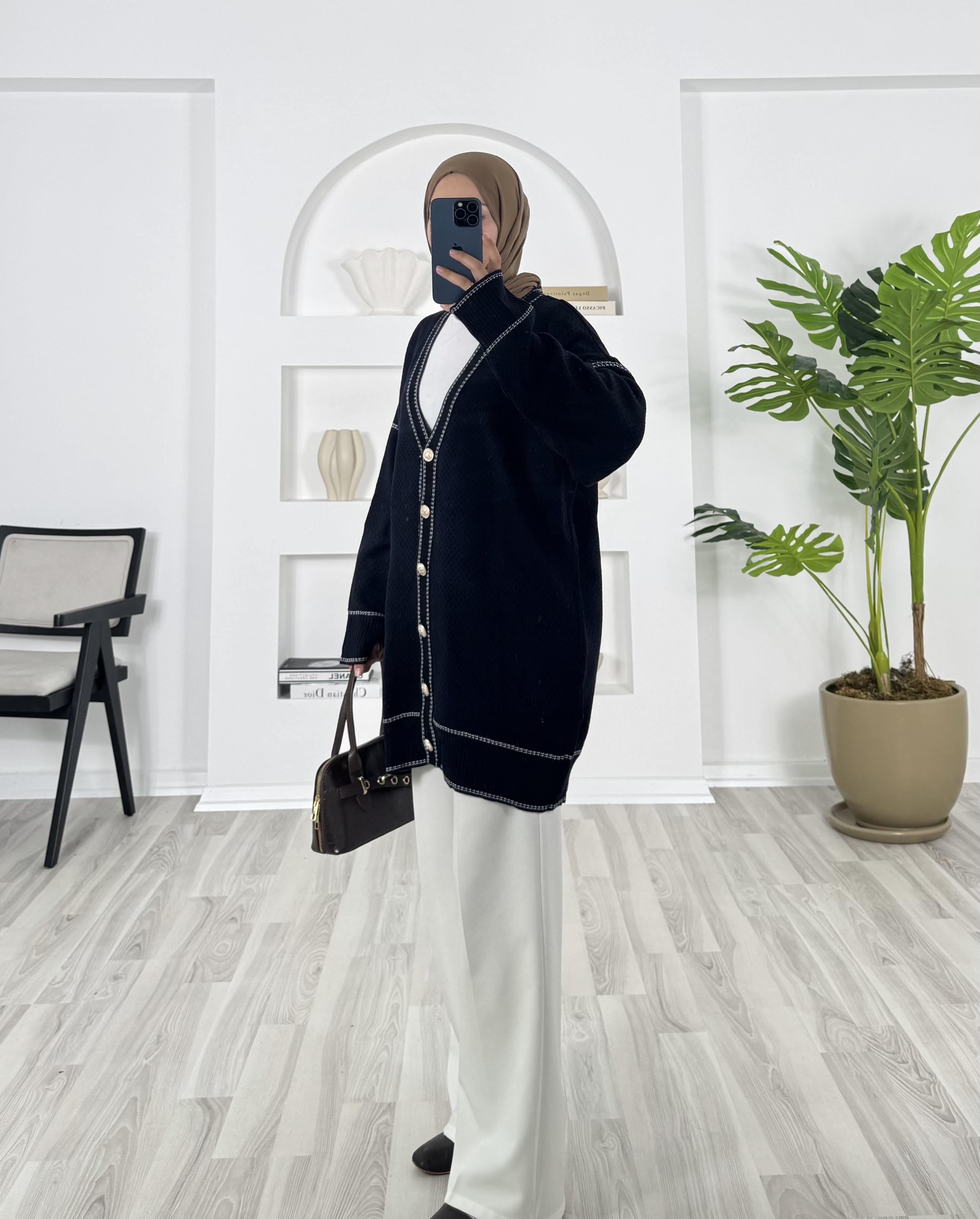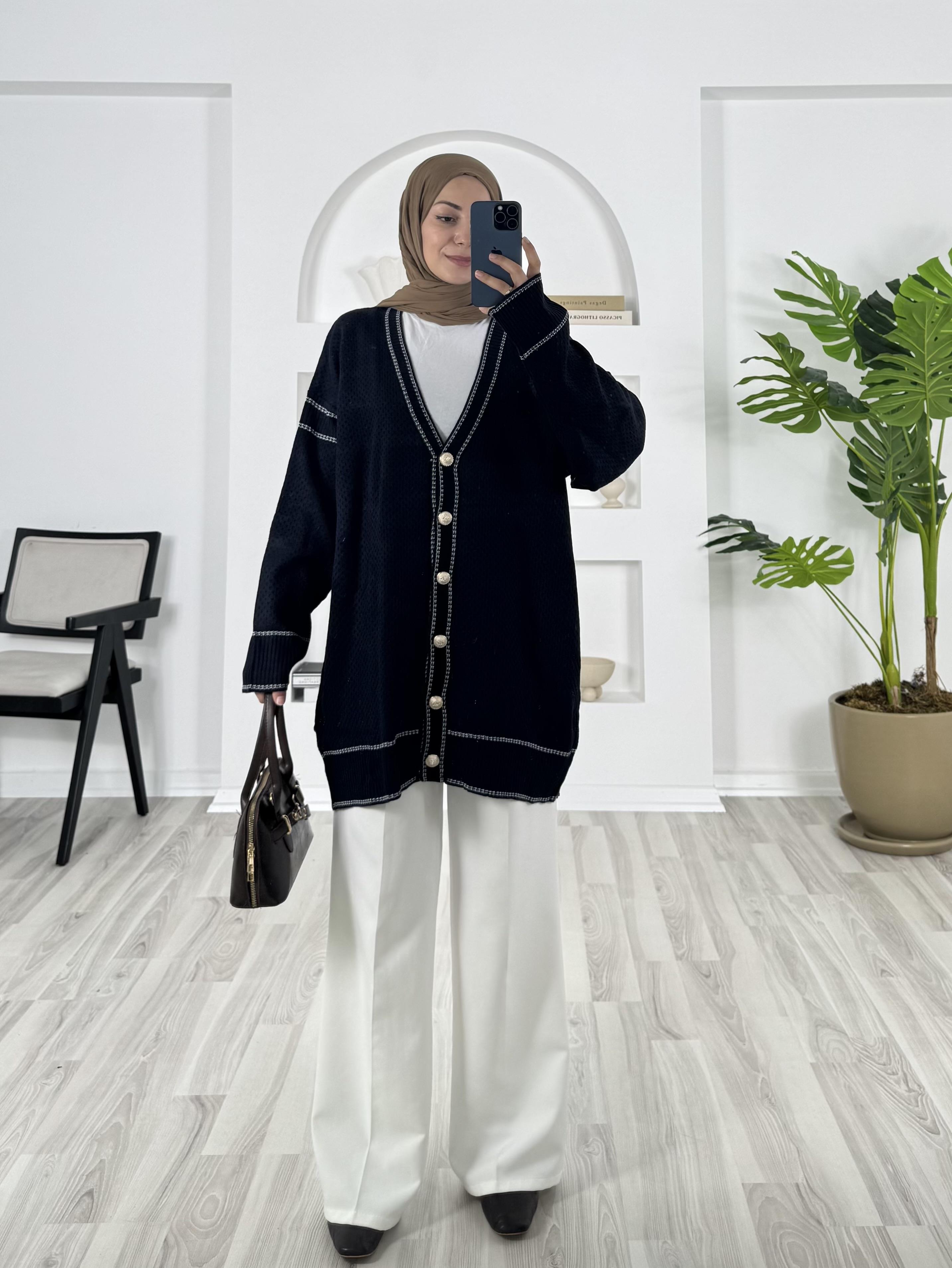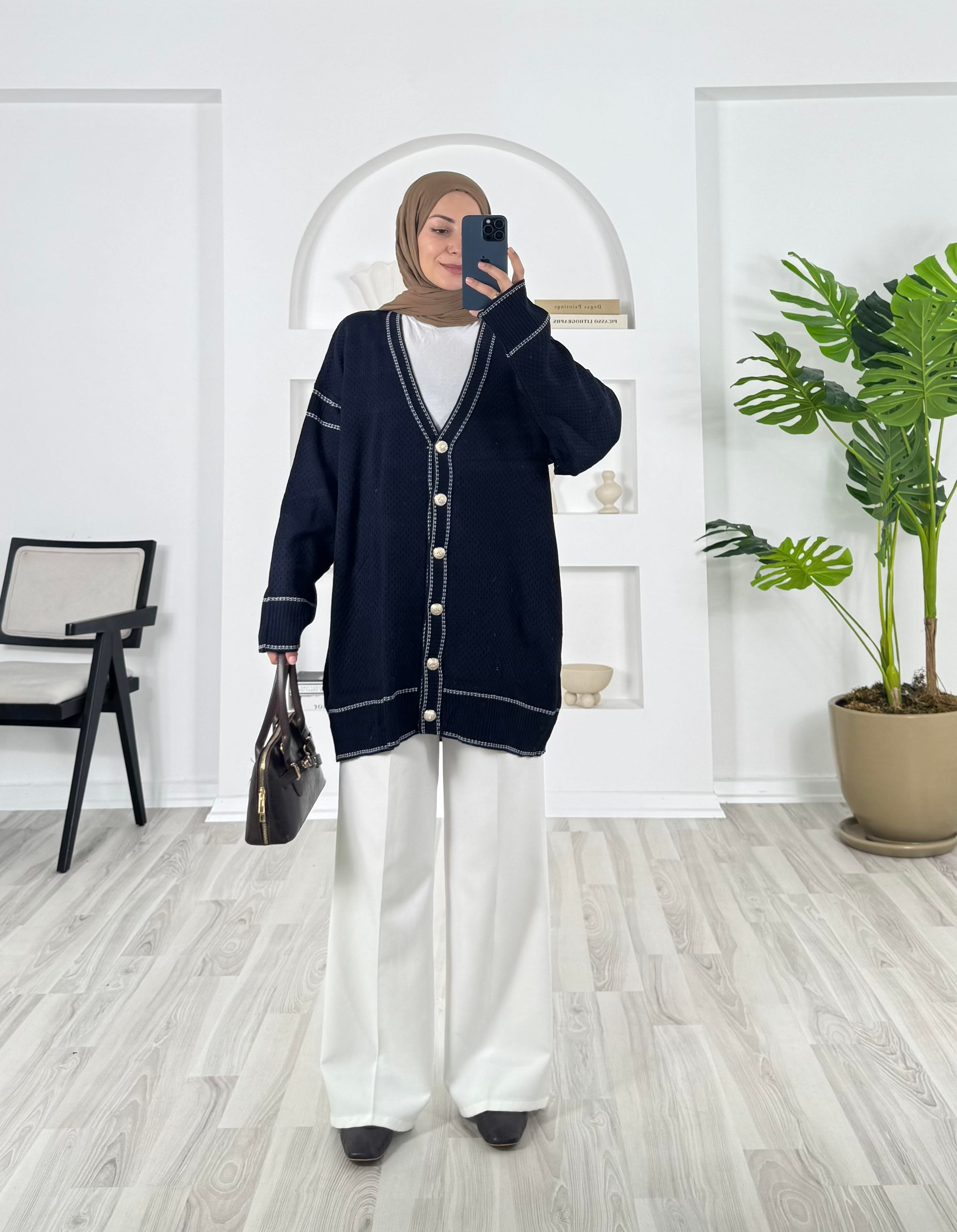 önü dügmeli çizgi detaylı triko hırka
