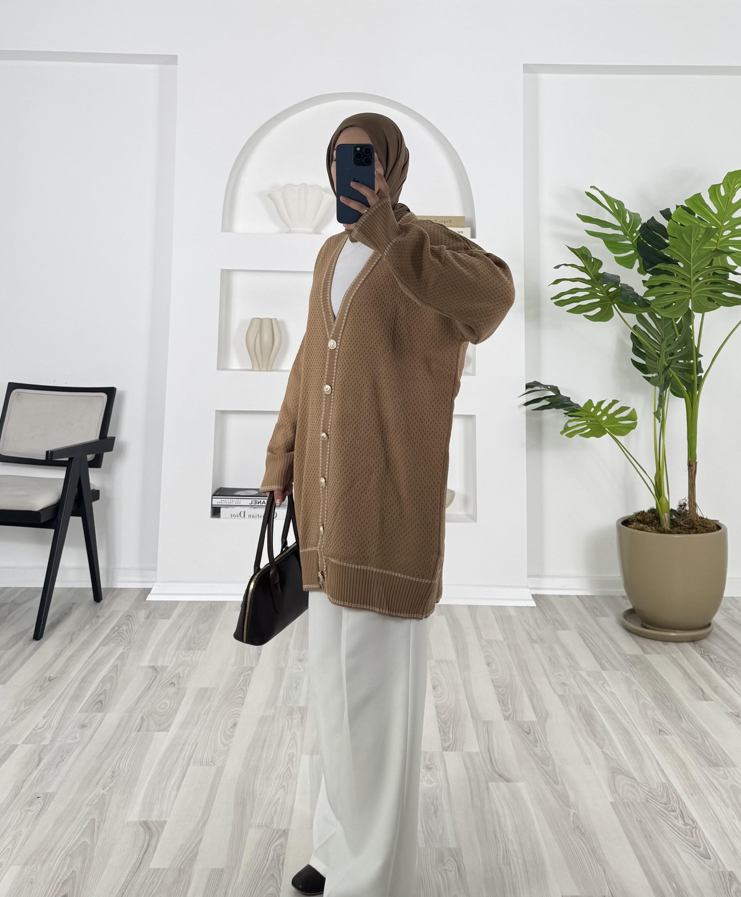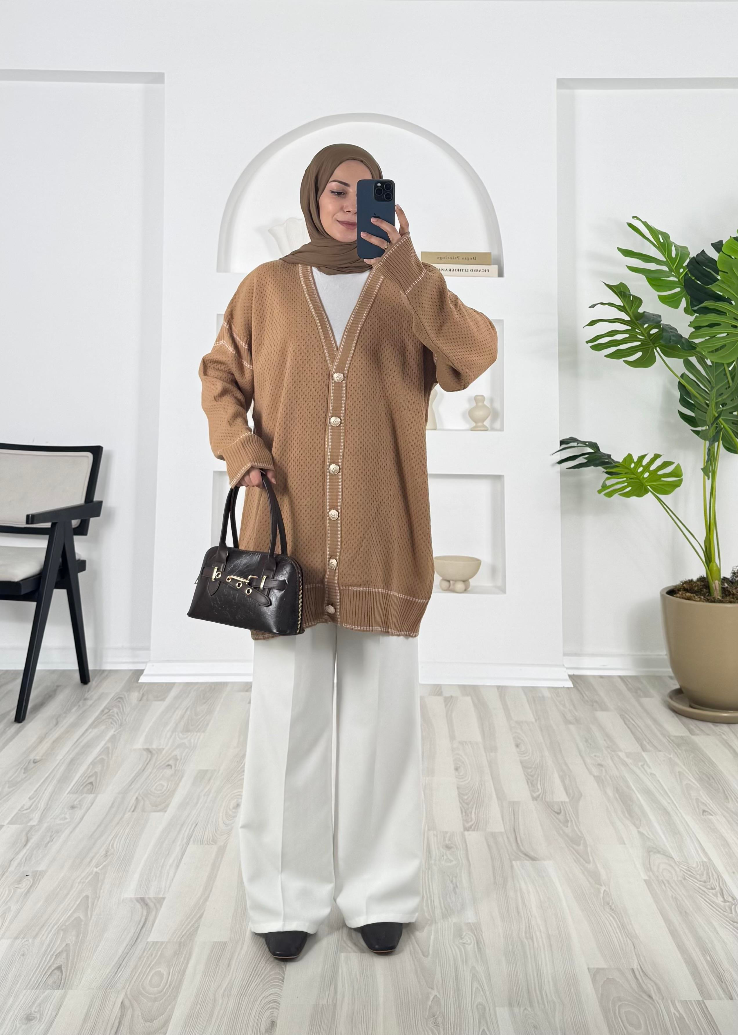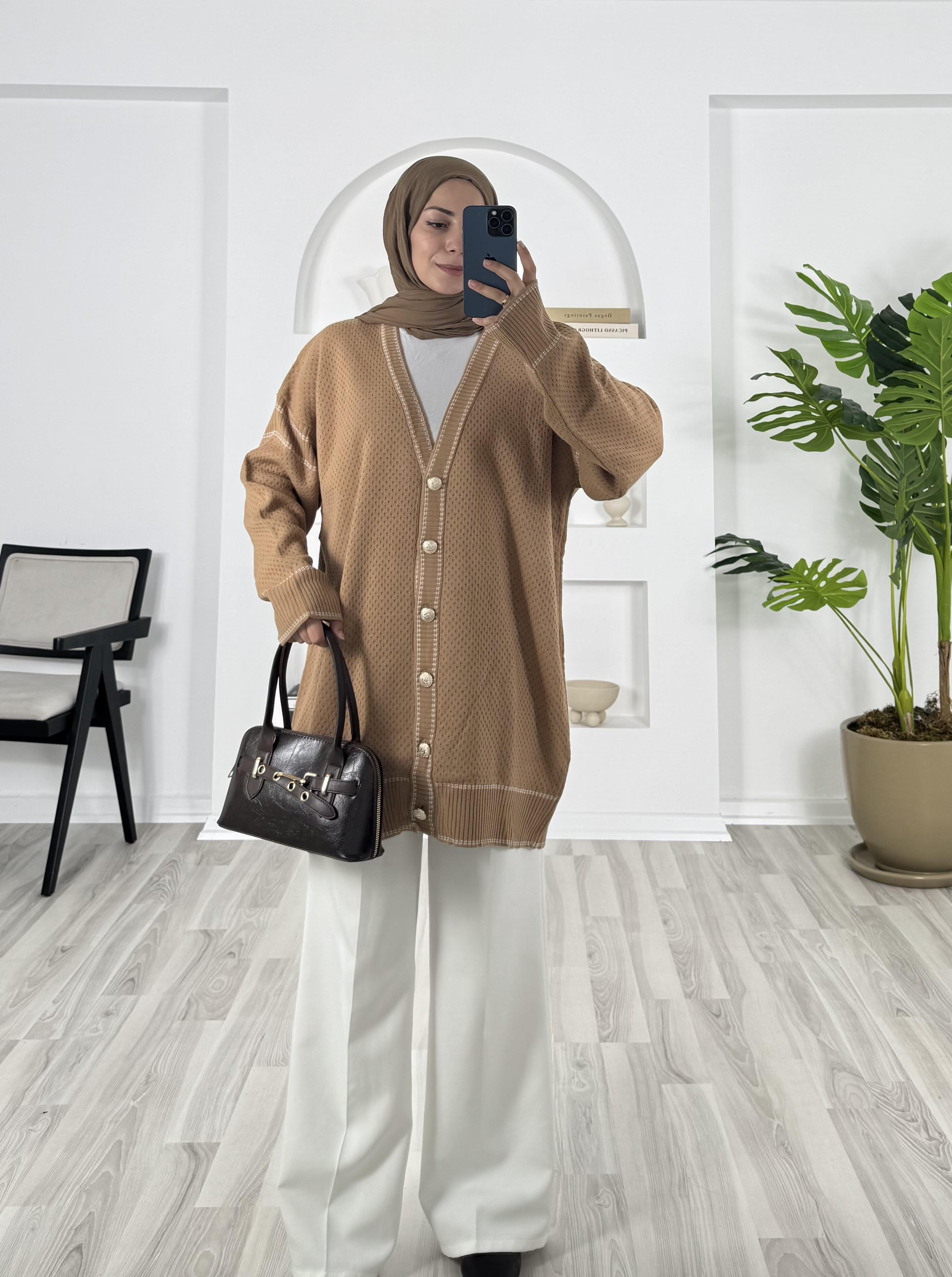 19634 - önü dügmeli çizgi detaylı triko hırka - sütlü kahve (19634)