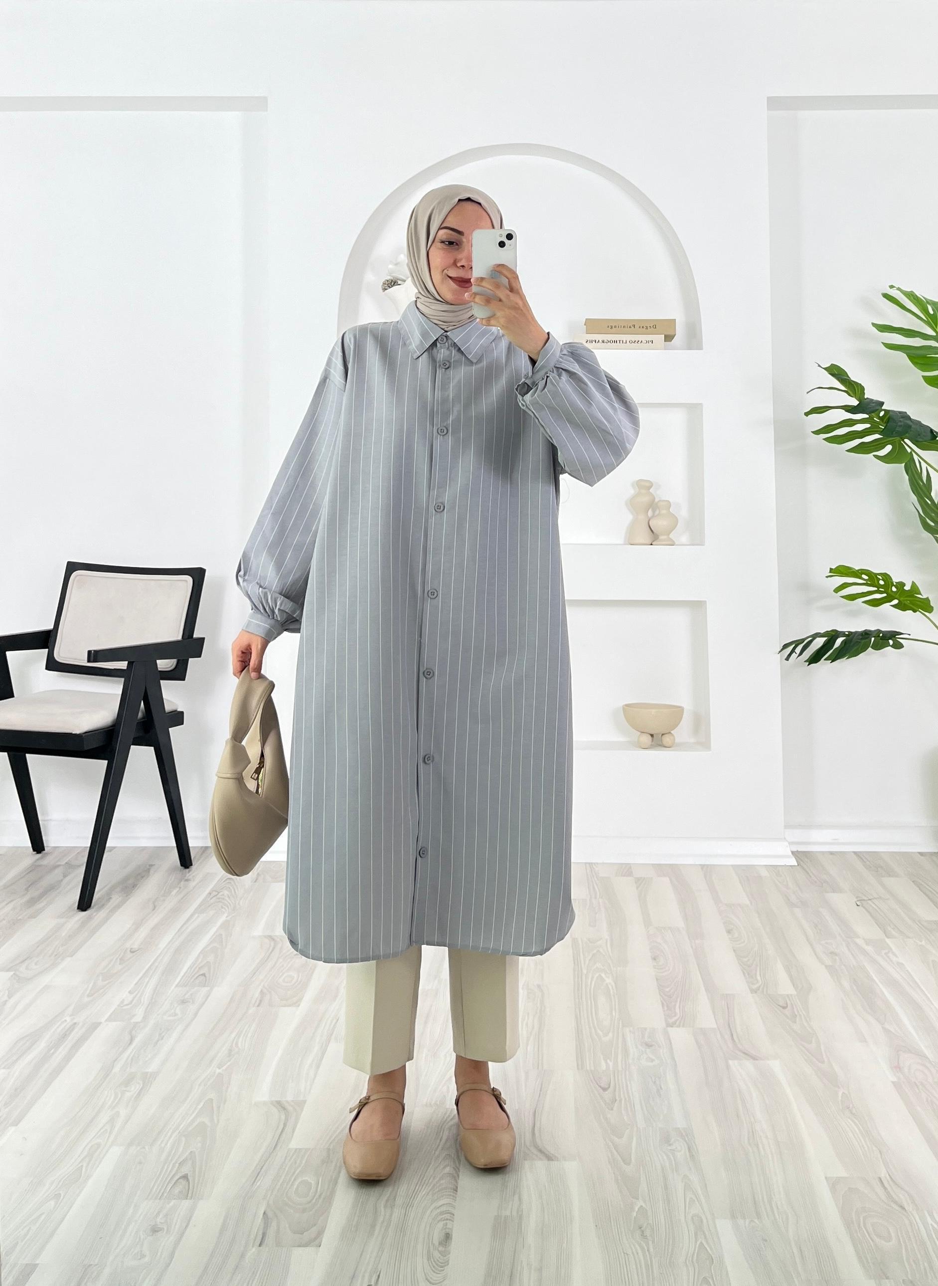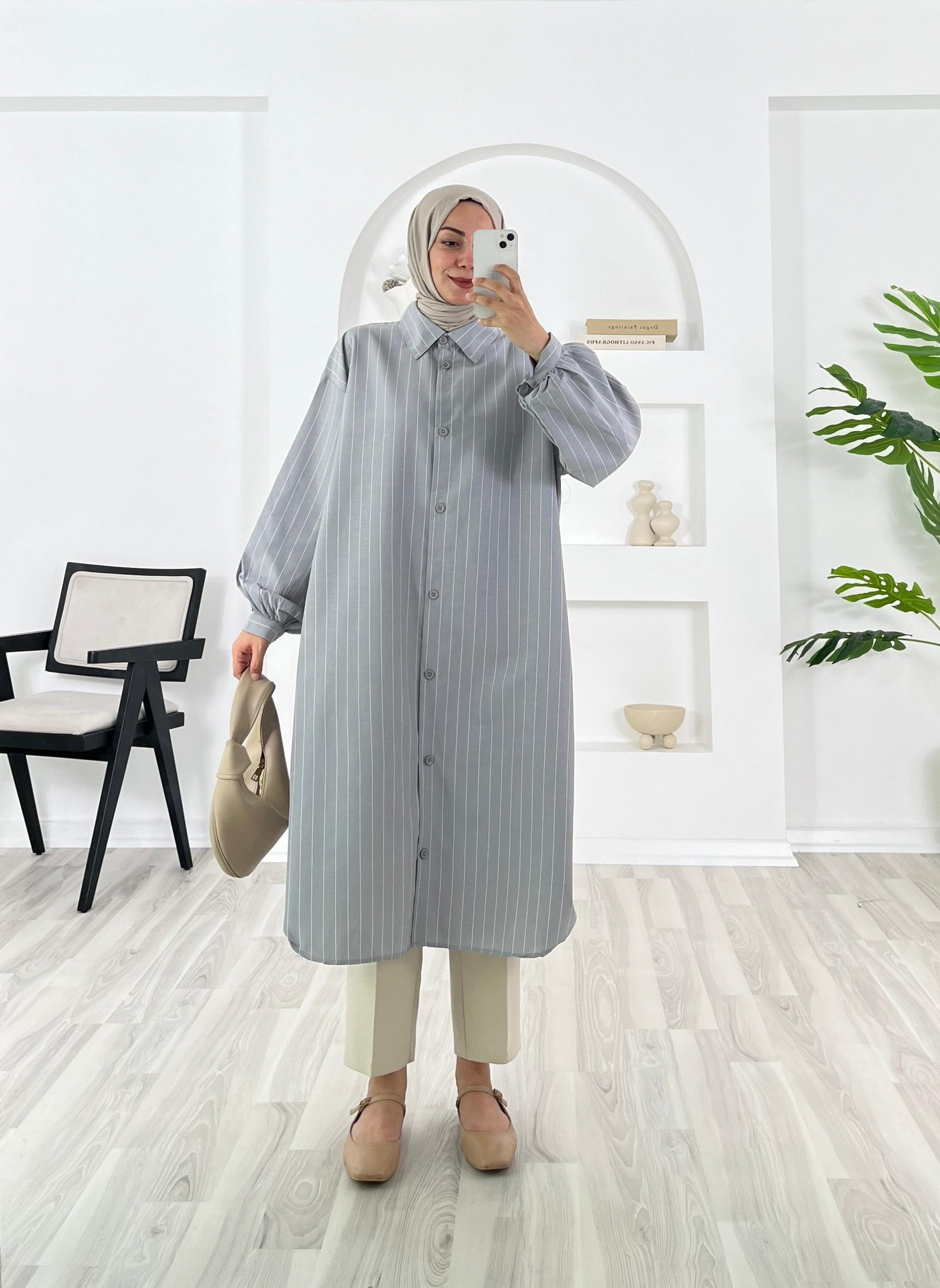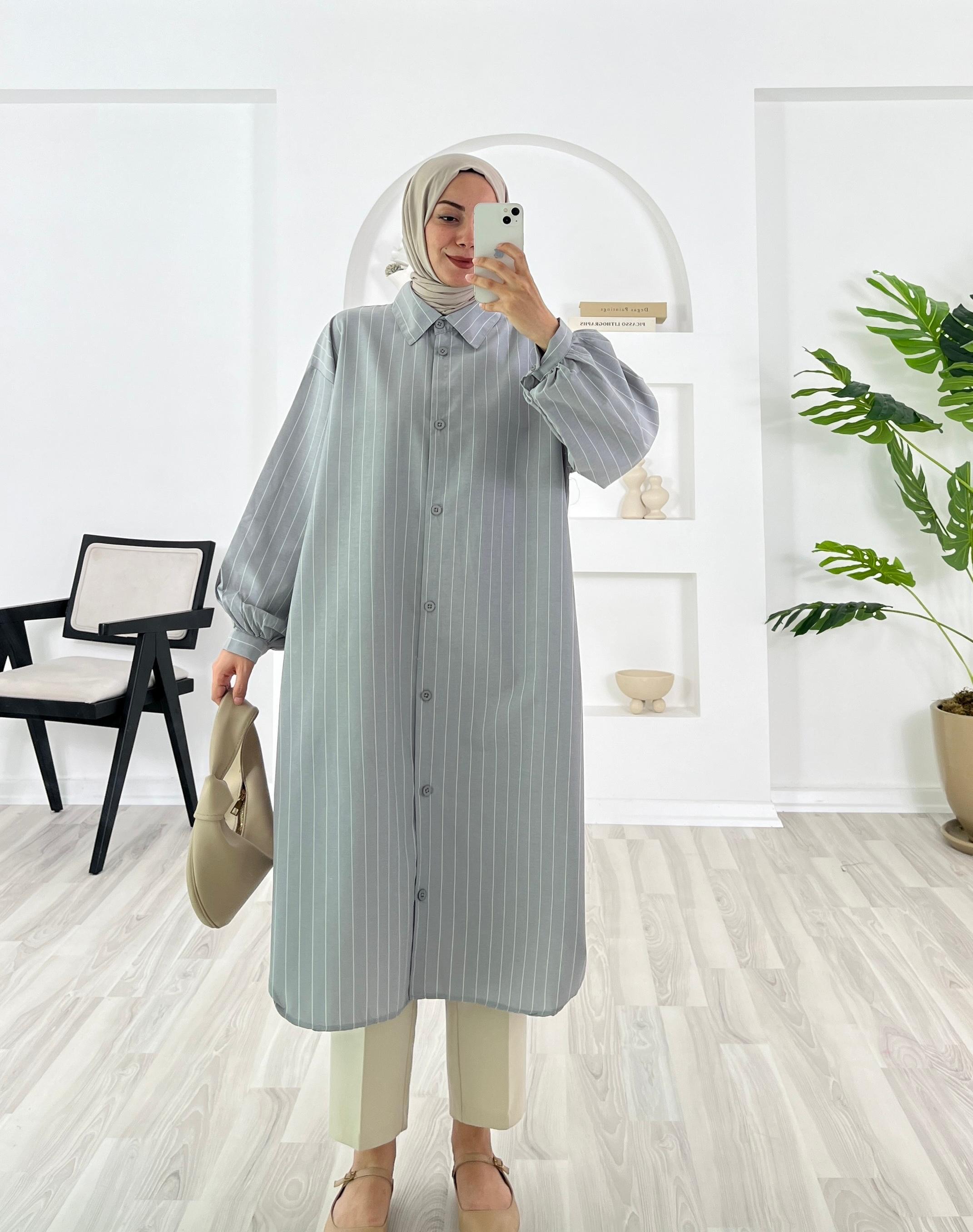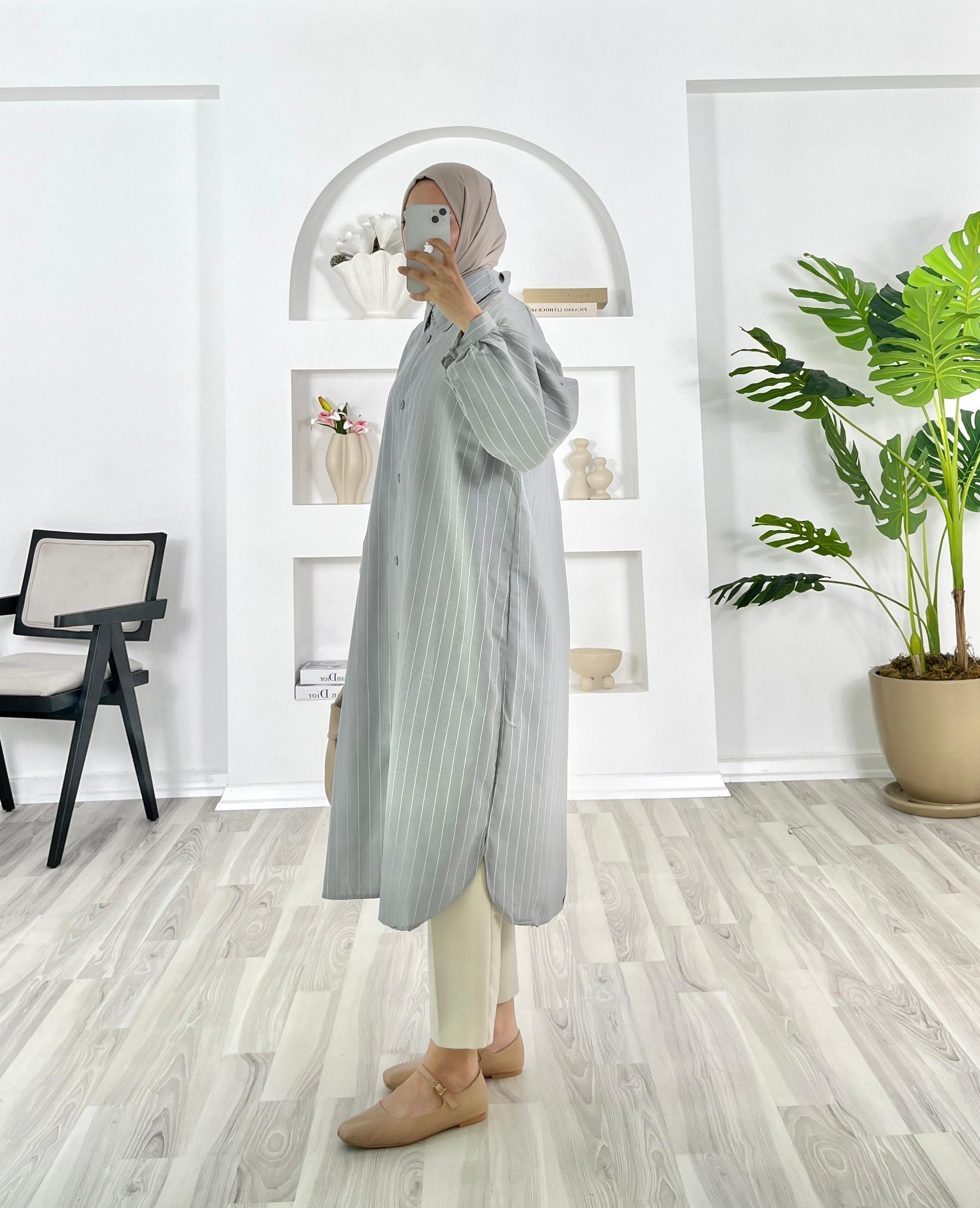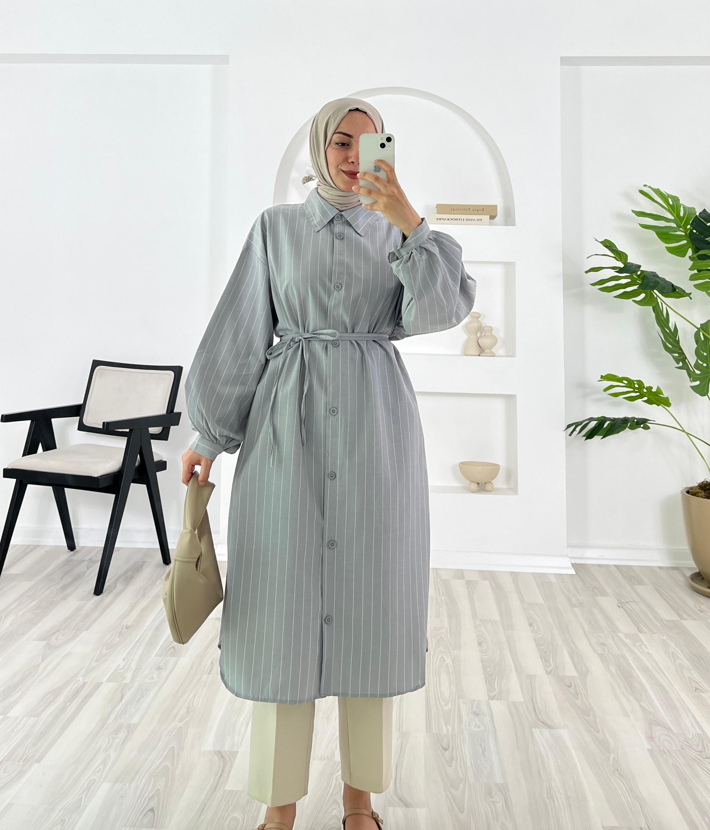 2123-Terikoton kumaş-çizgili-seyyar kuşaklı uzun tunik-gri (2123)