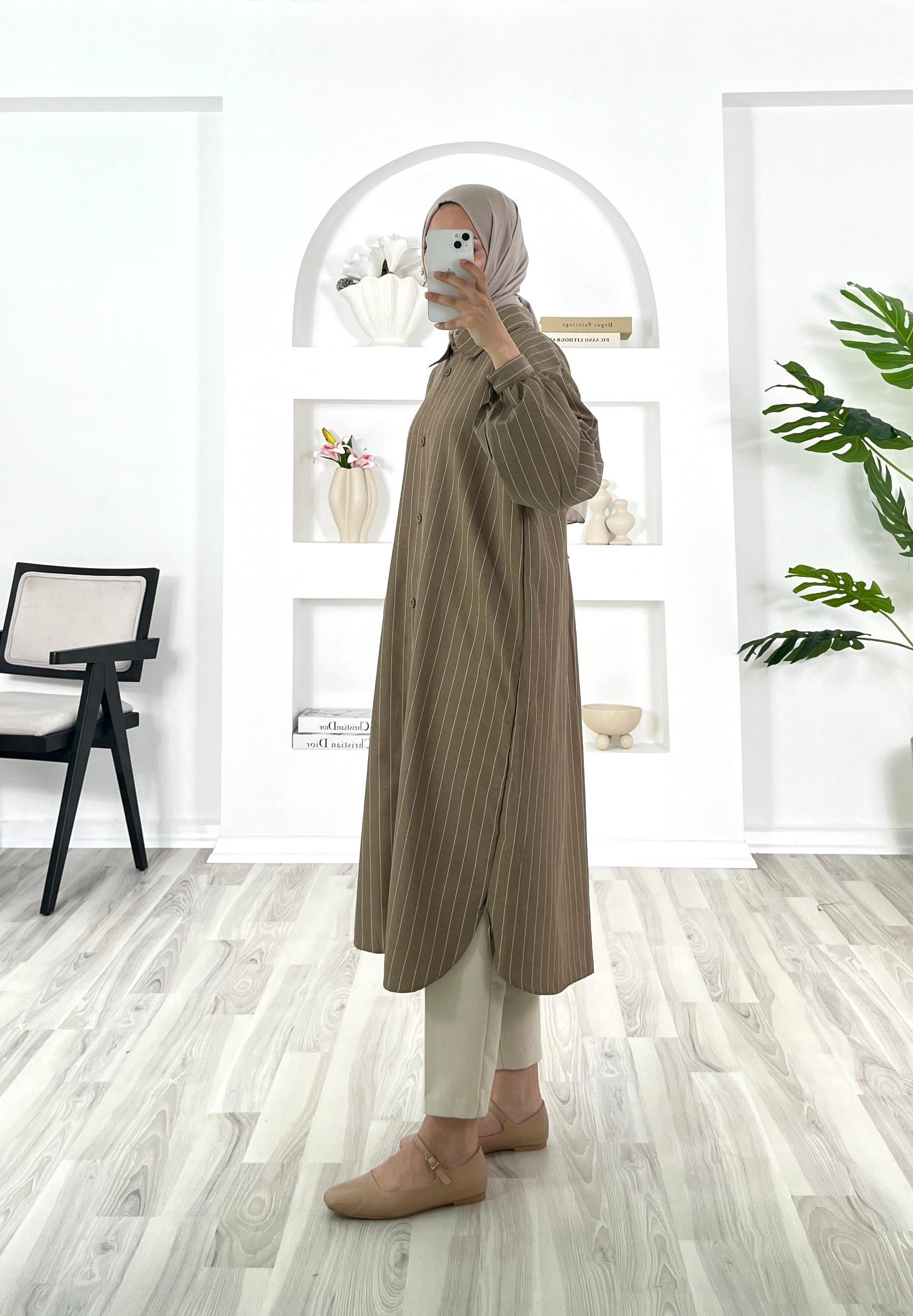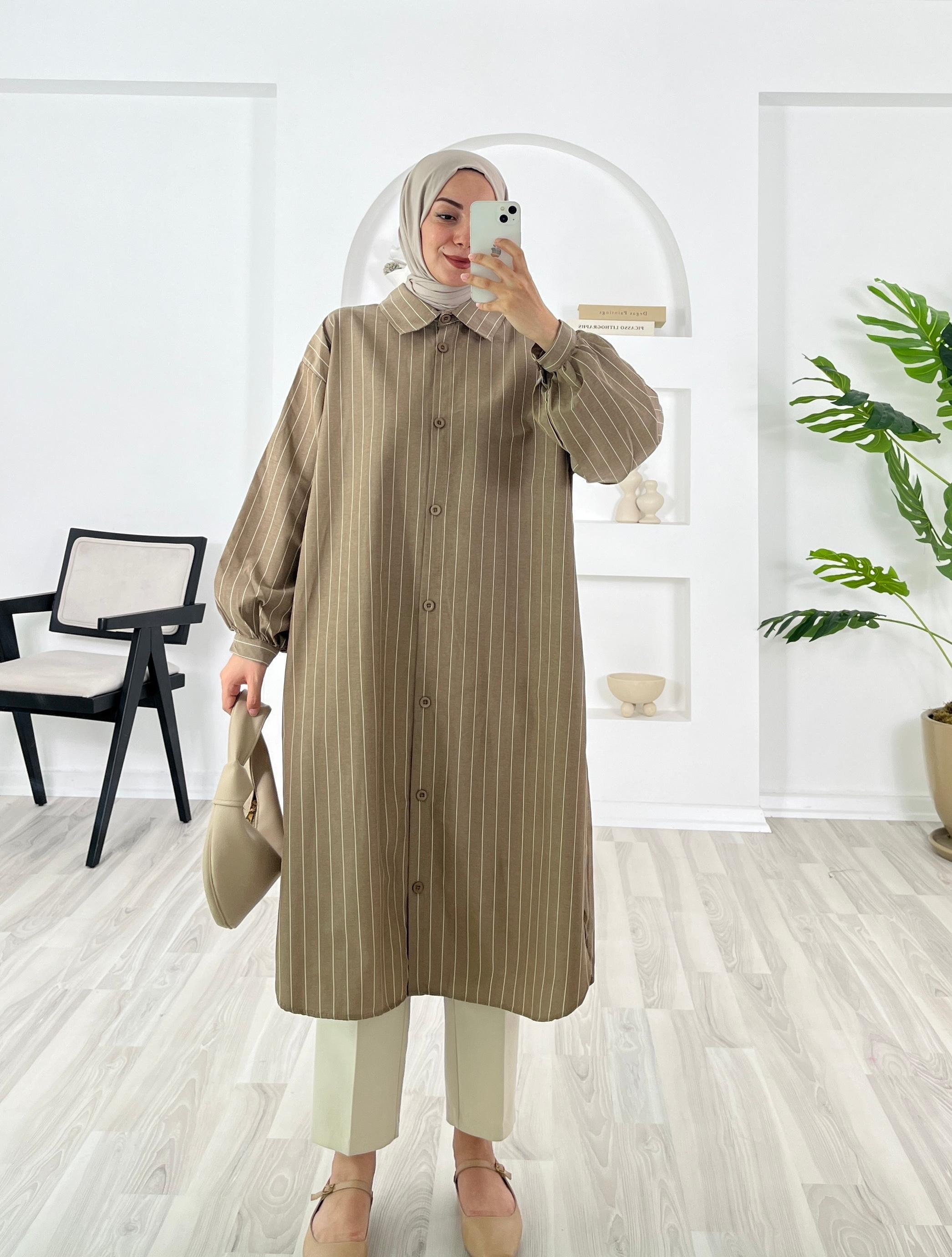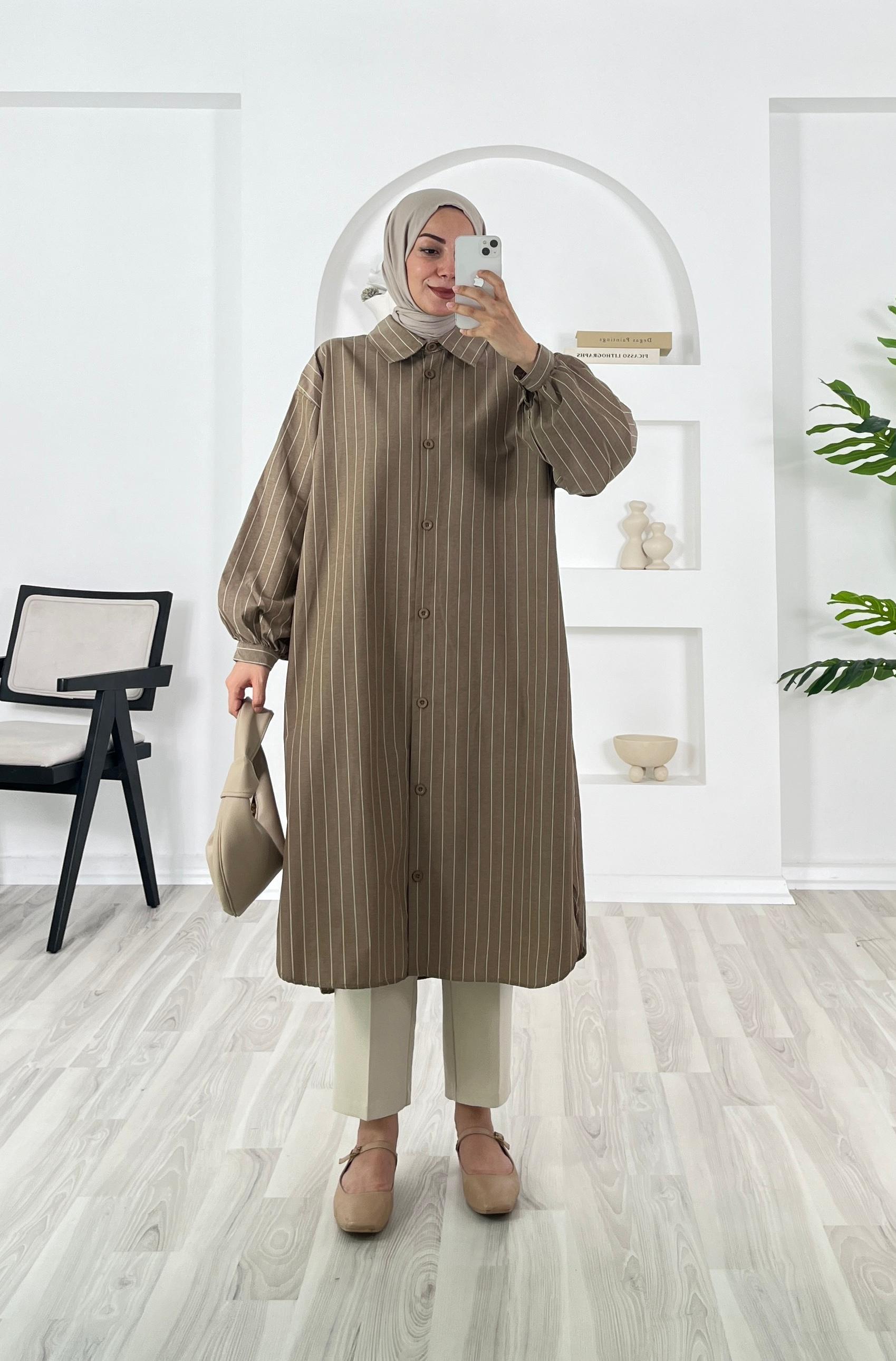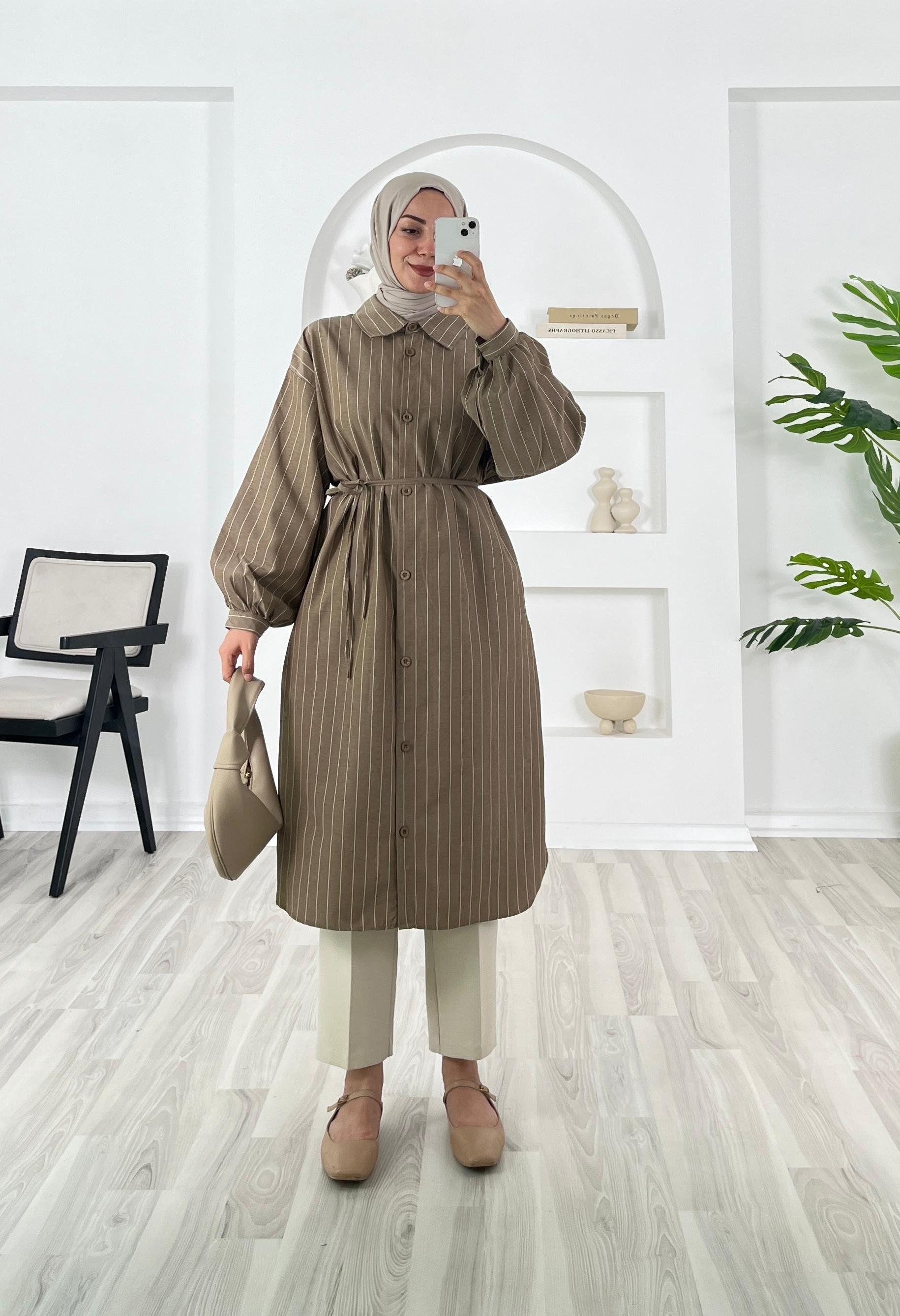 2123-Terikoton kumaş-çizgili-seyyar kuşaklı uzun tunik-kahve (2123)