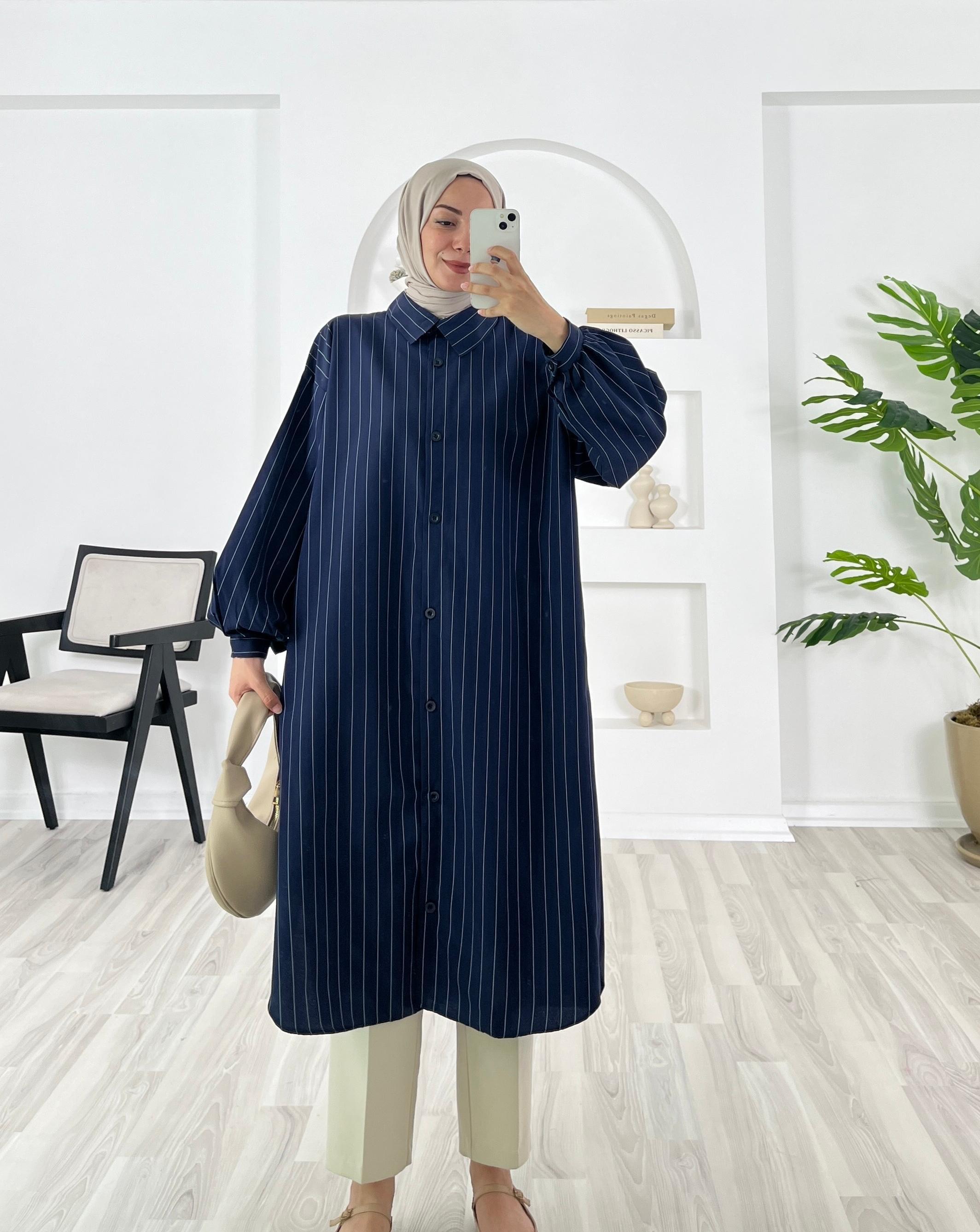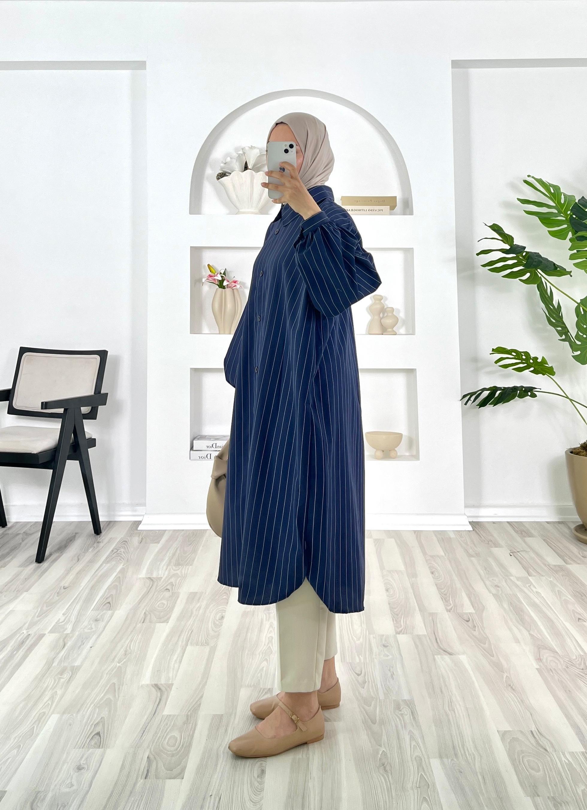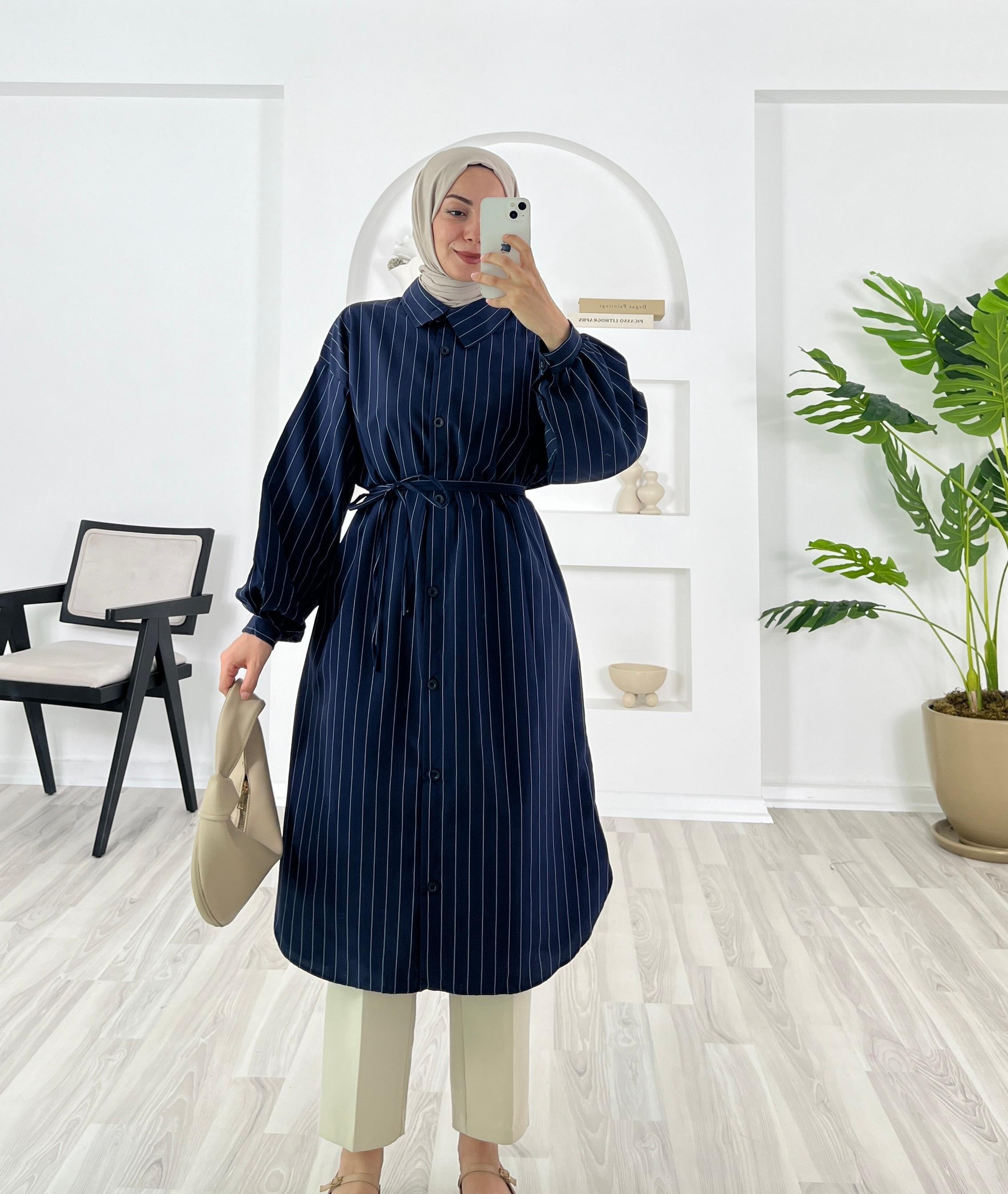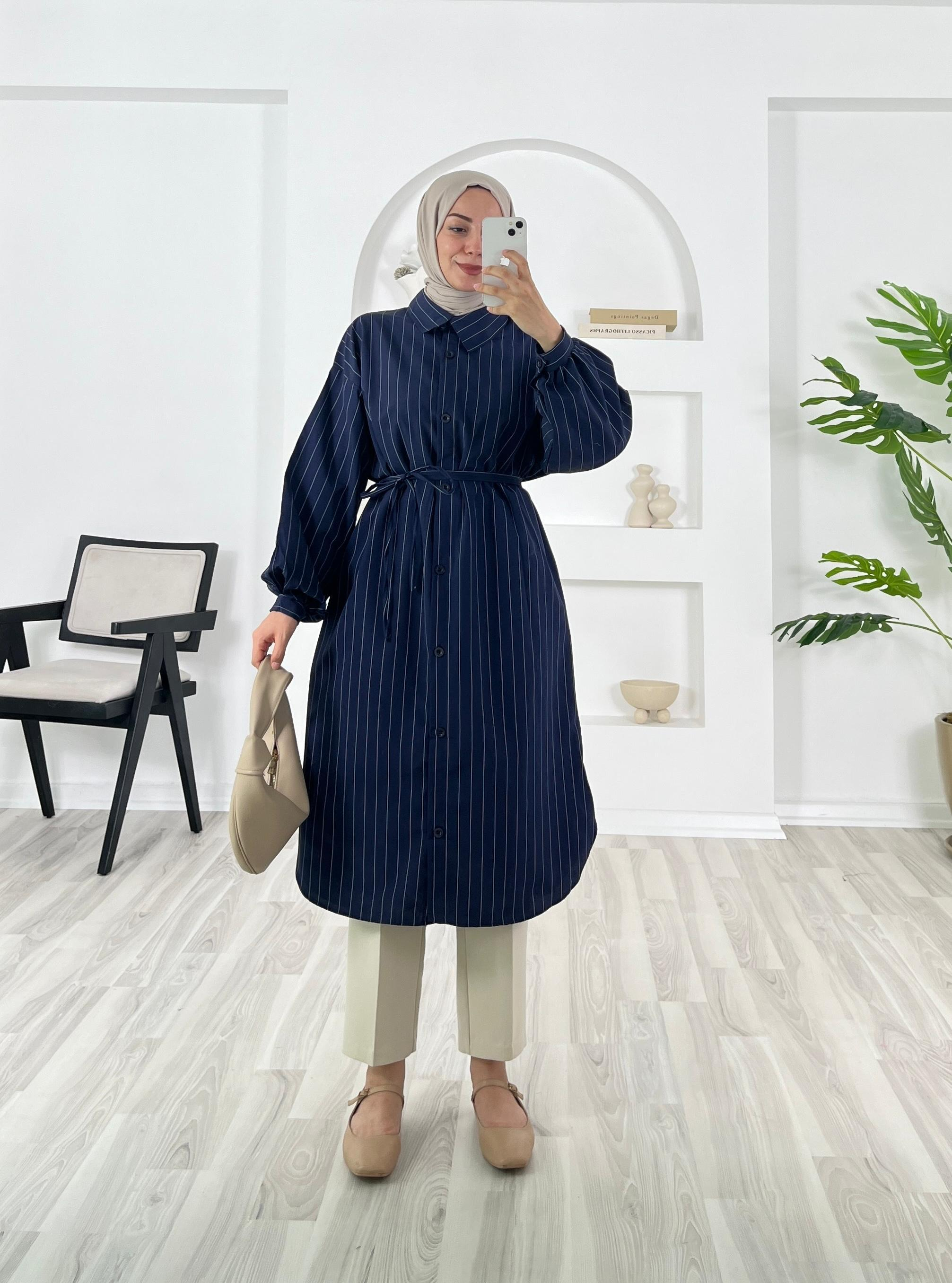 2123-Terikoton kumaş-çizgili-seyyar kuşaklı uzun tunik-lacivert (2123)