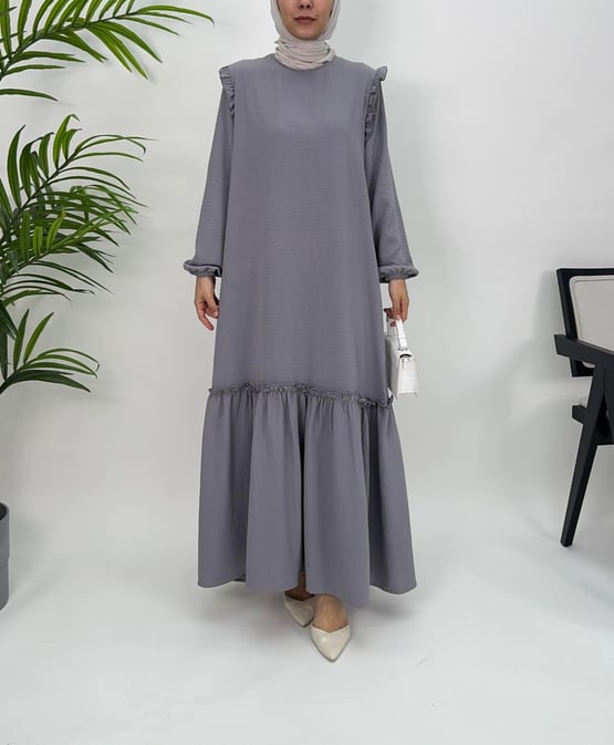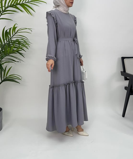 2147-ayrobin kumaş-fırfır detaylı kol ucu lastikli elbise-GRİ (2147)