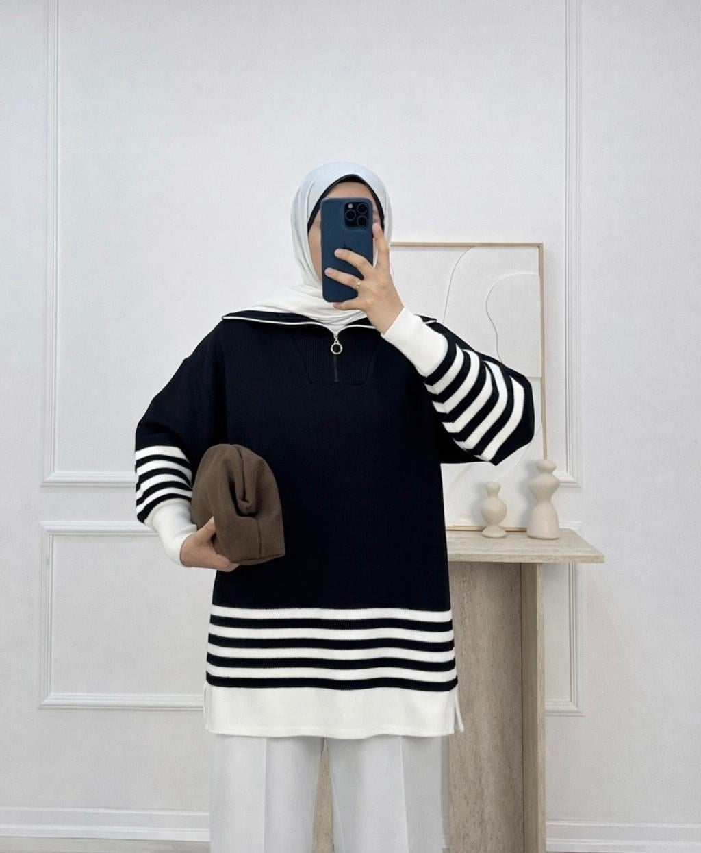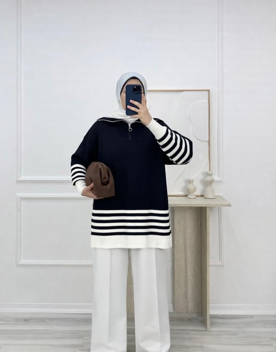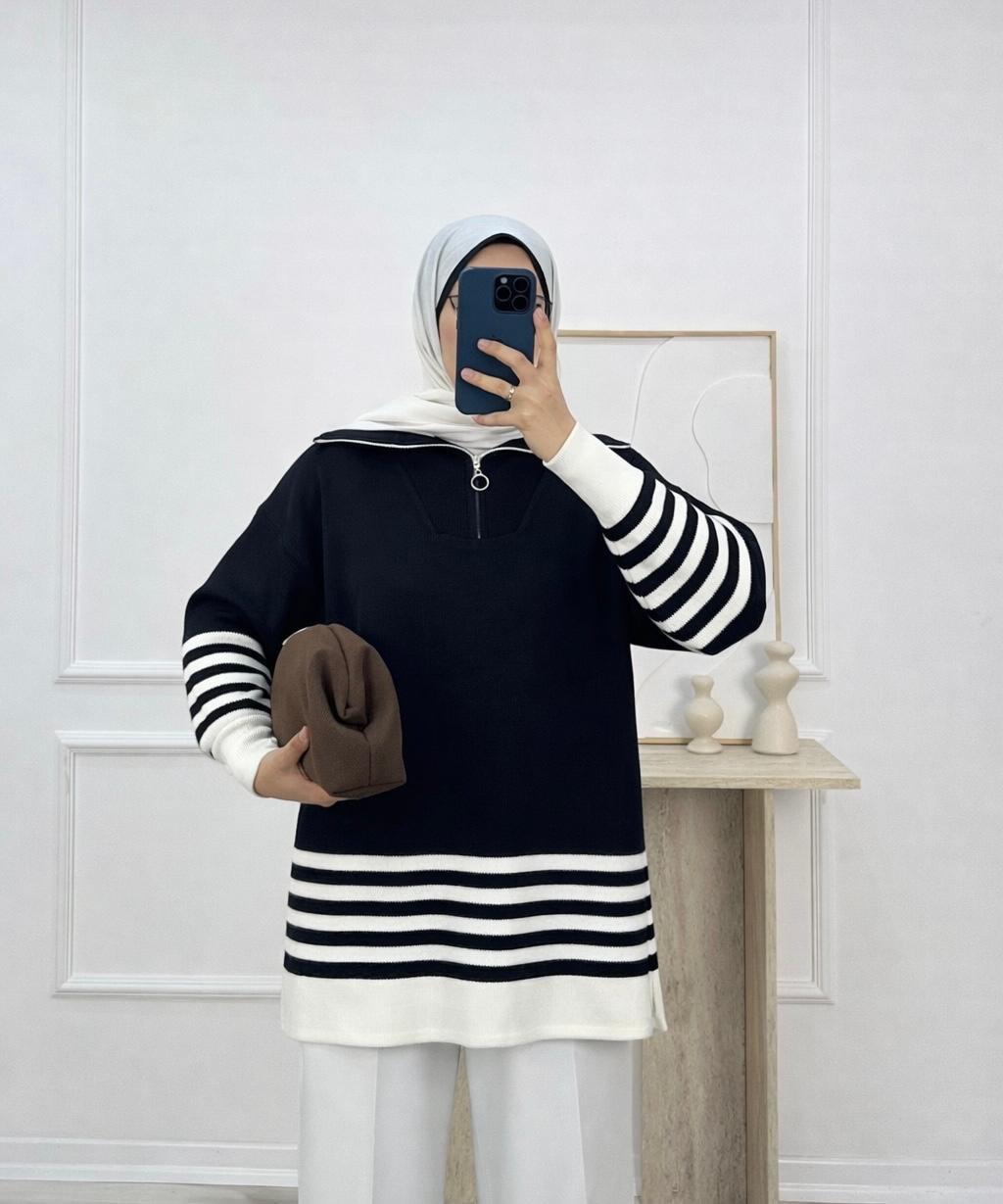 fermuar yaka çizgili triko tunik