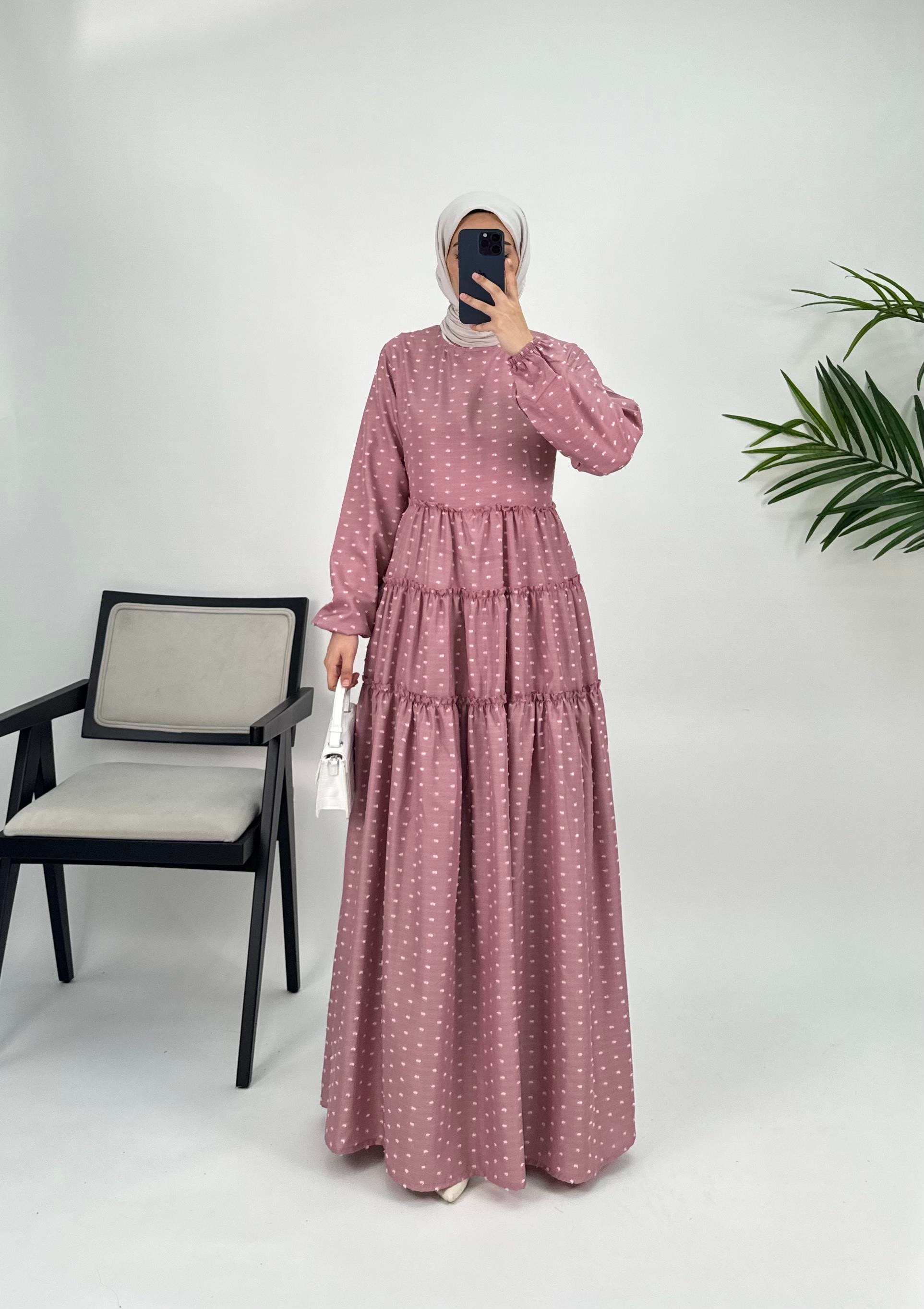 2163-ponpon efektli koton kumaş kat kat elbise gül kurusu (2163)