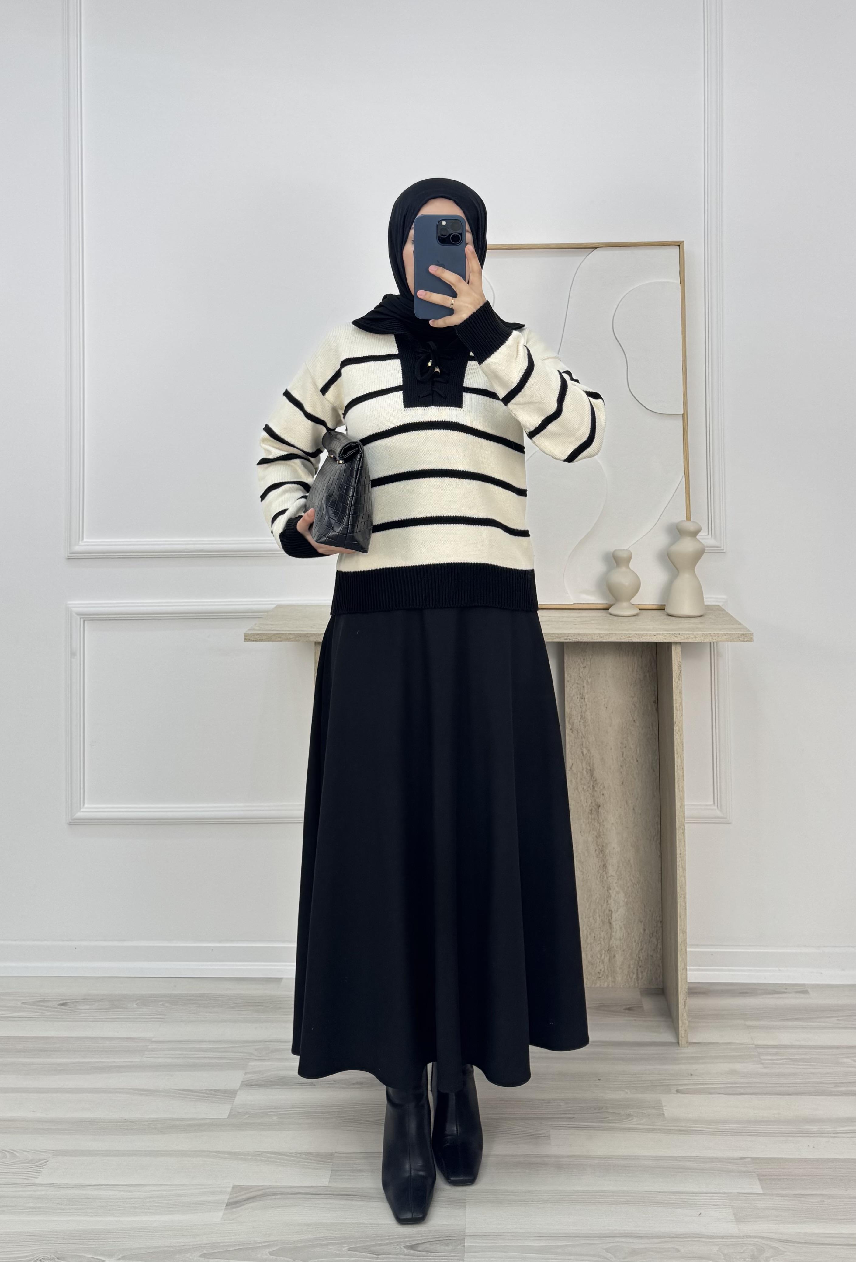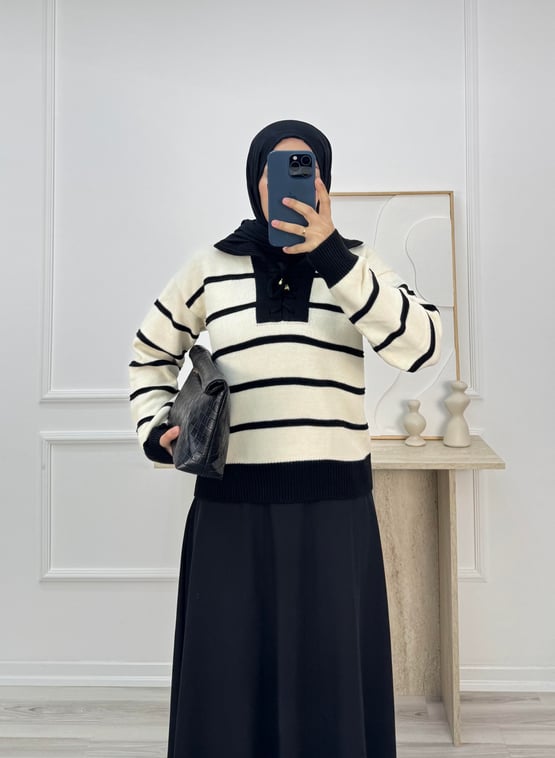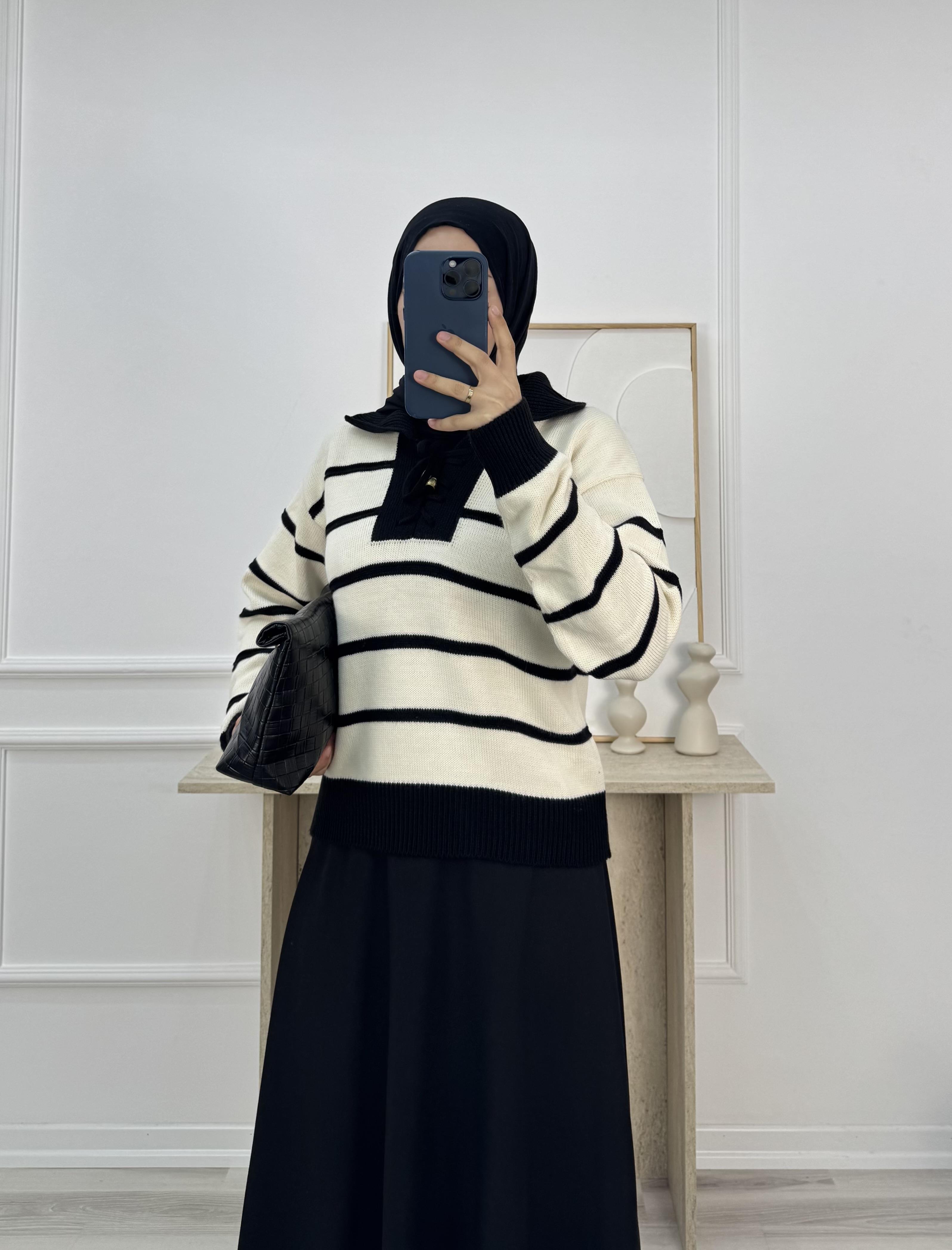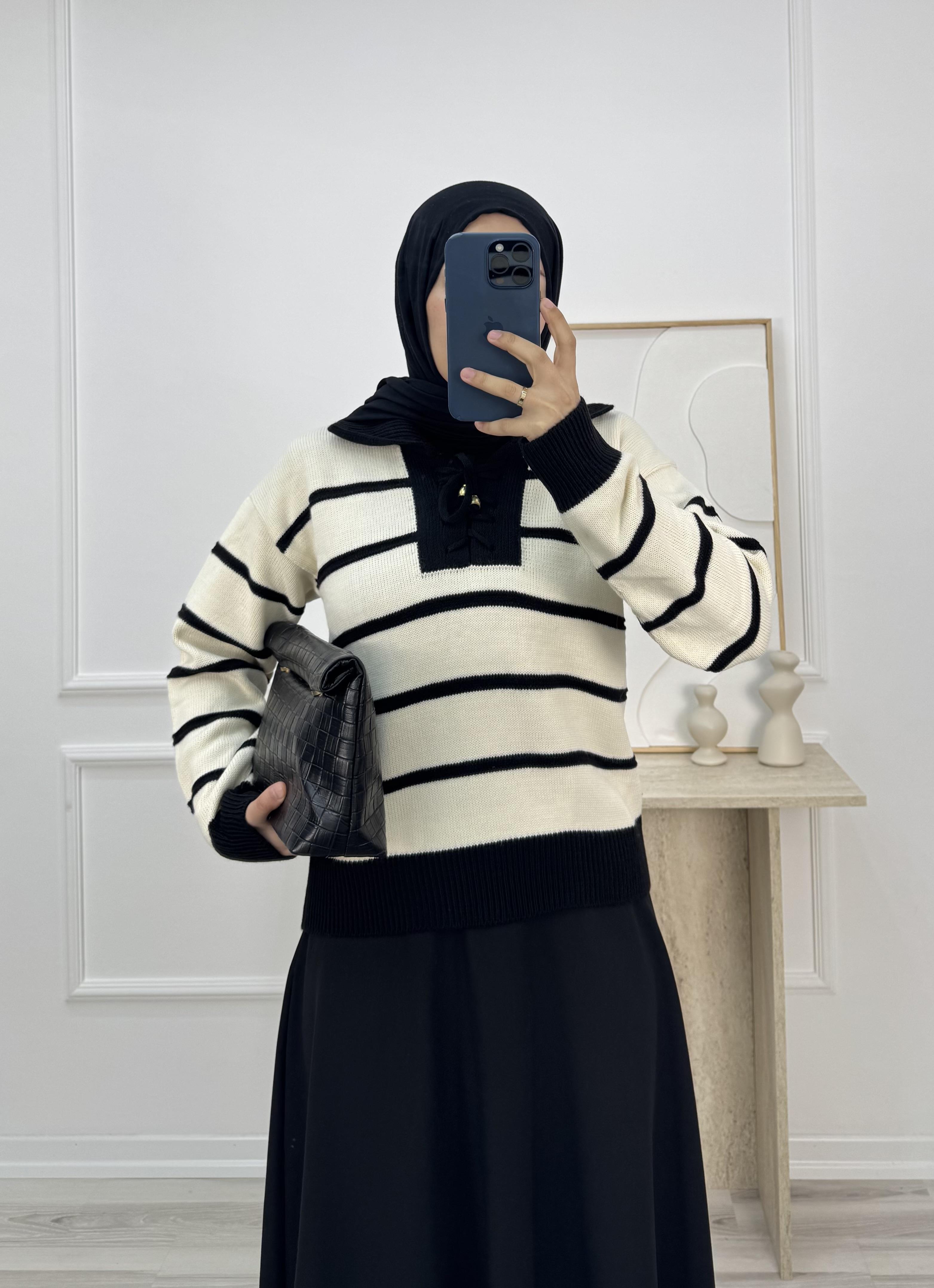 240764-çizgili önü çapraz ipli triko kazak-beyaz (240764)