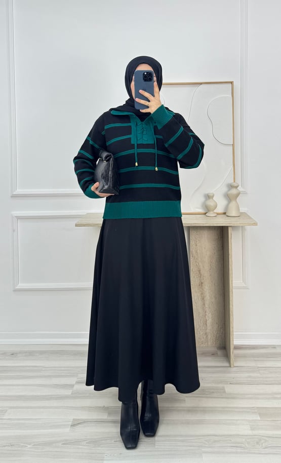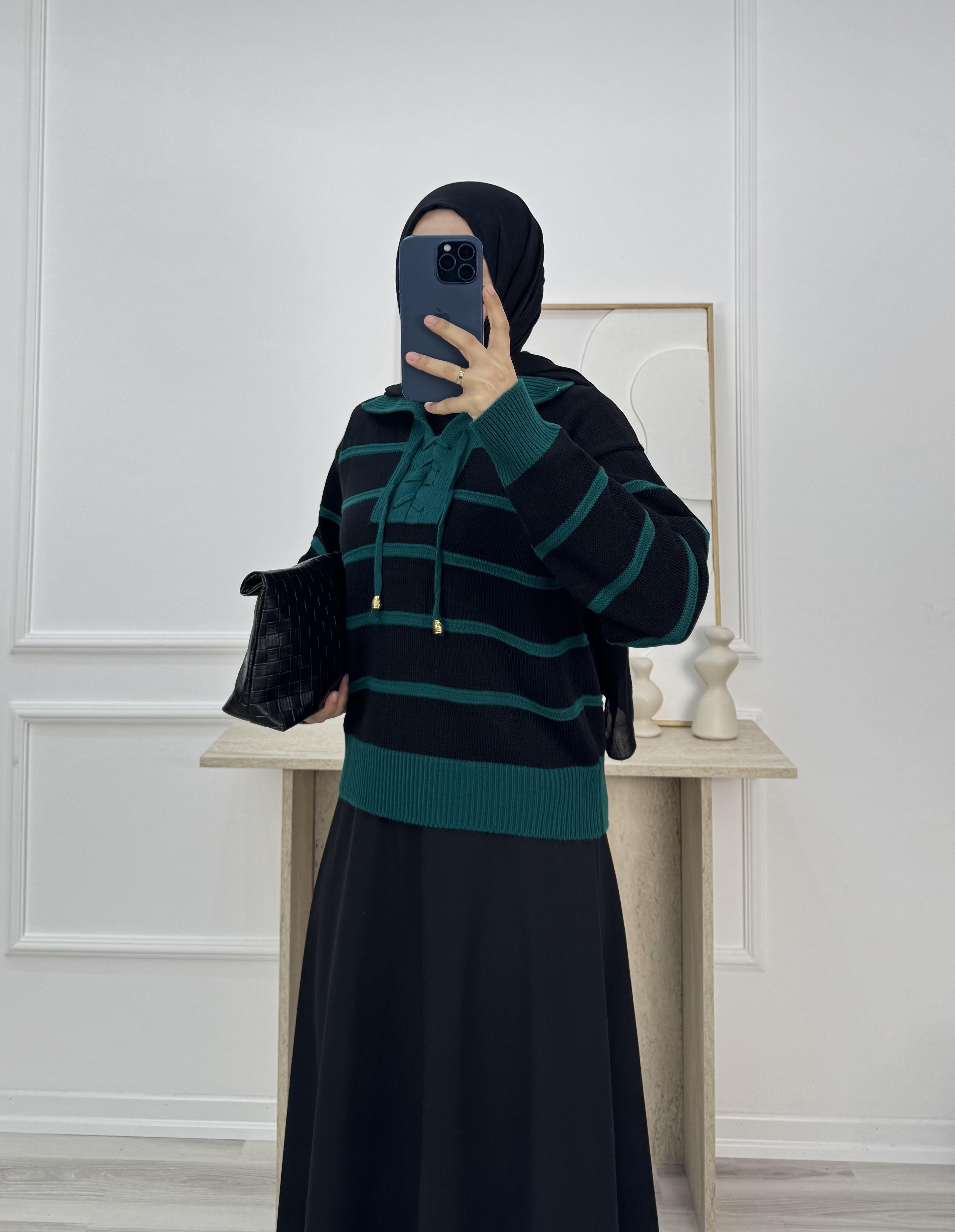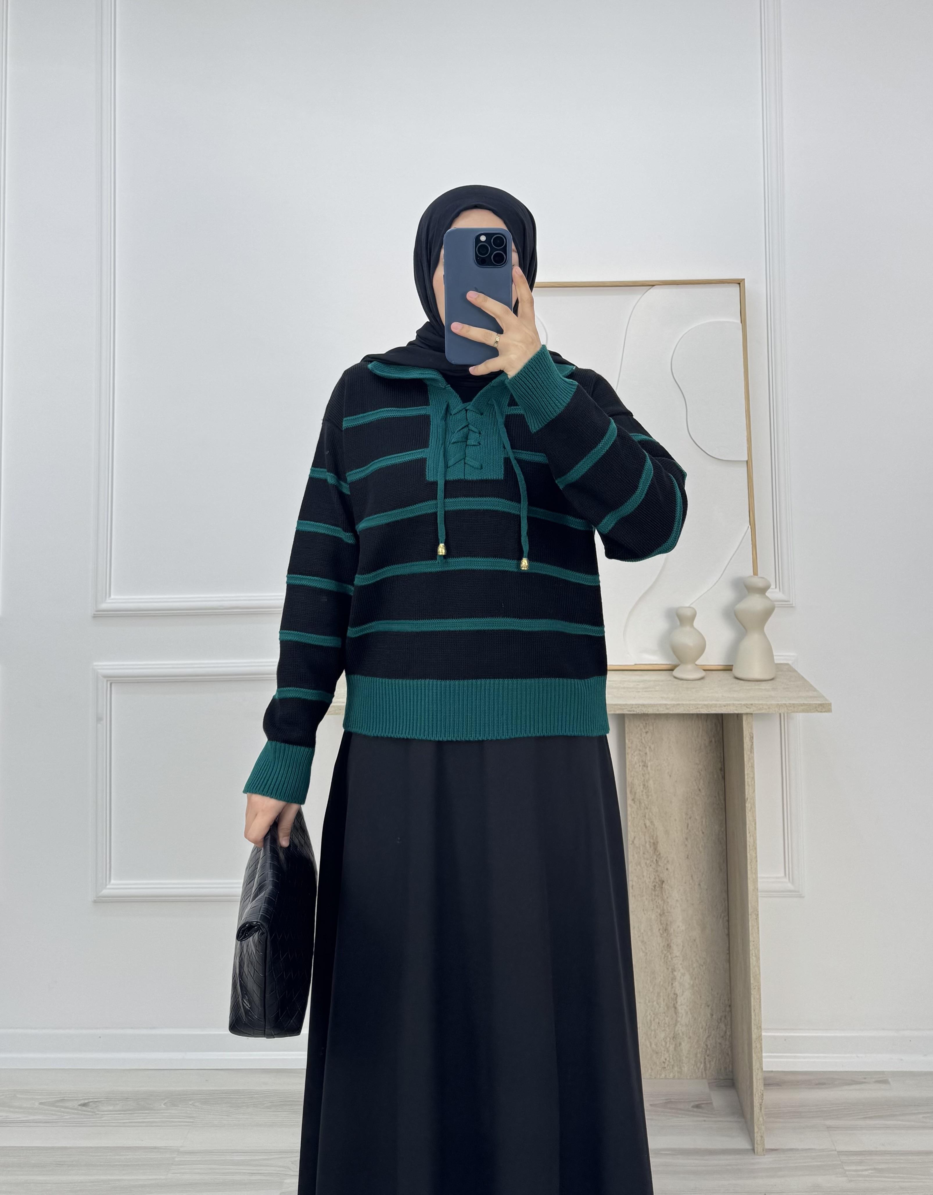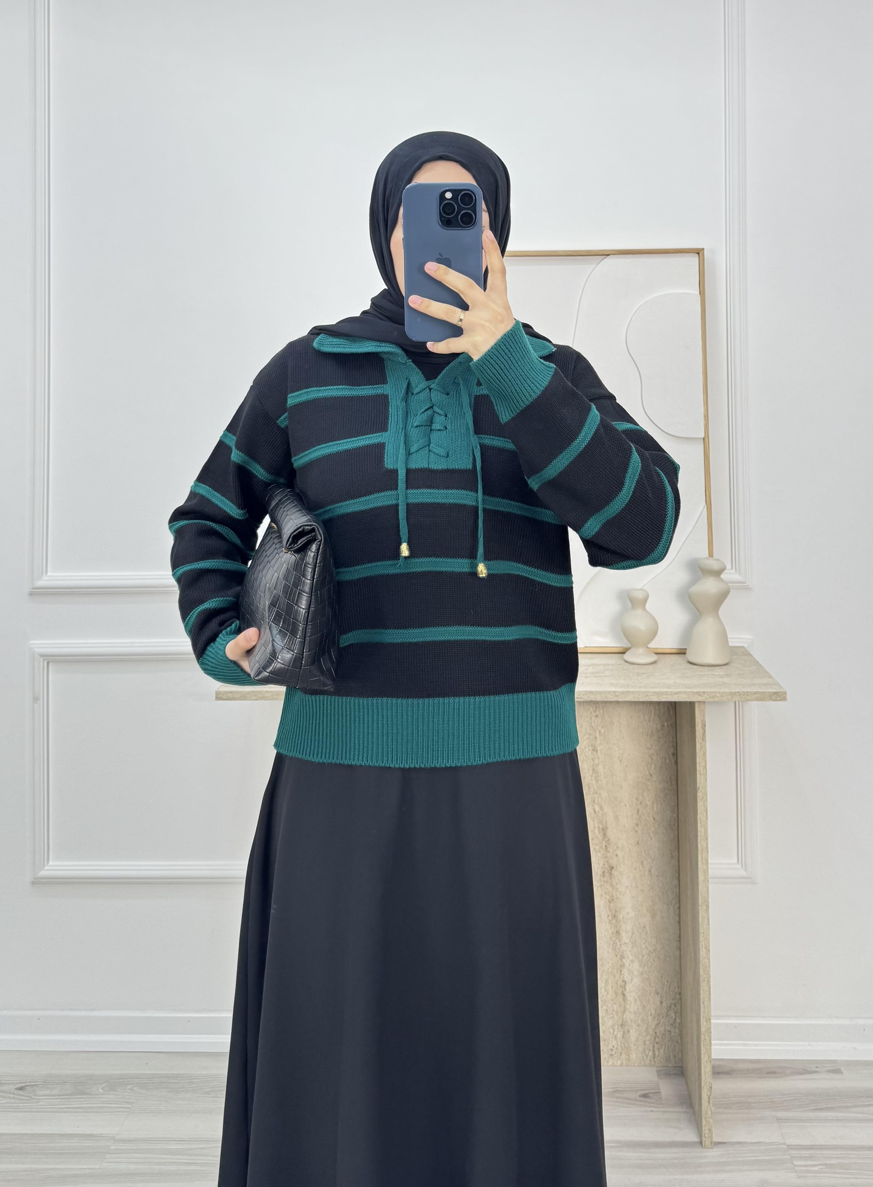 240764-çizgili önü çapraz ipli triko kazak-yeşil (240764)