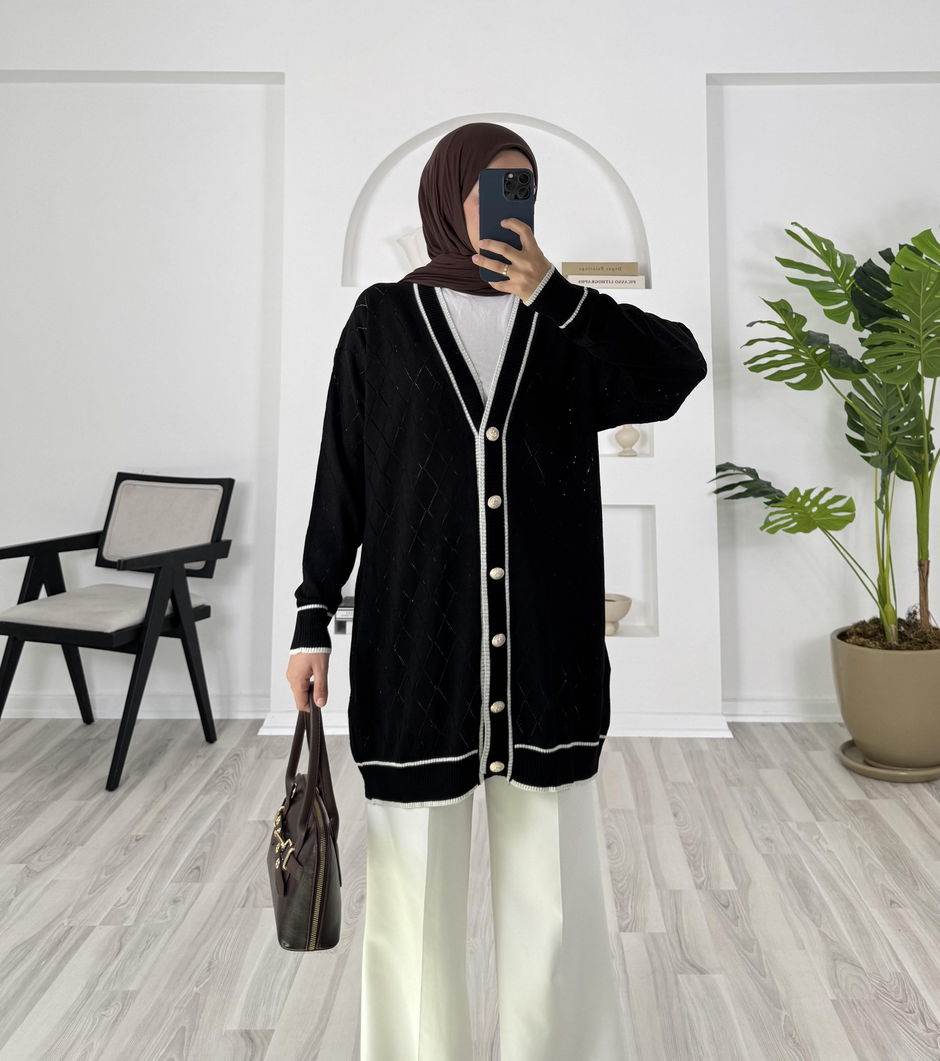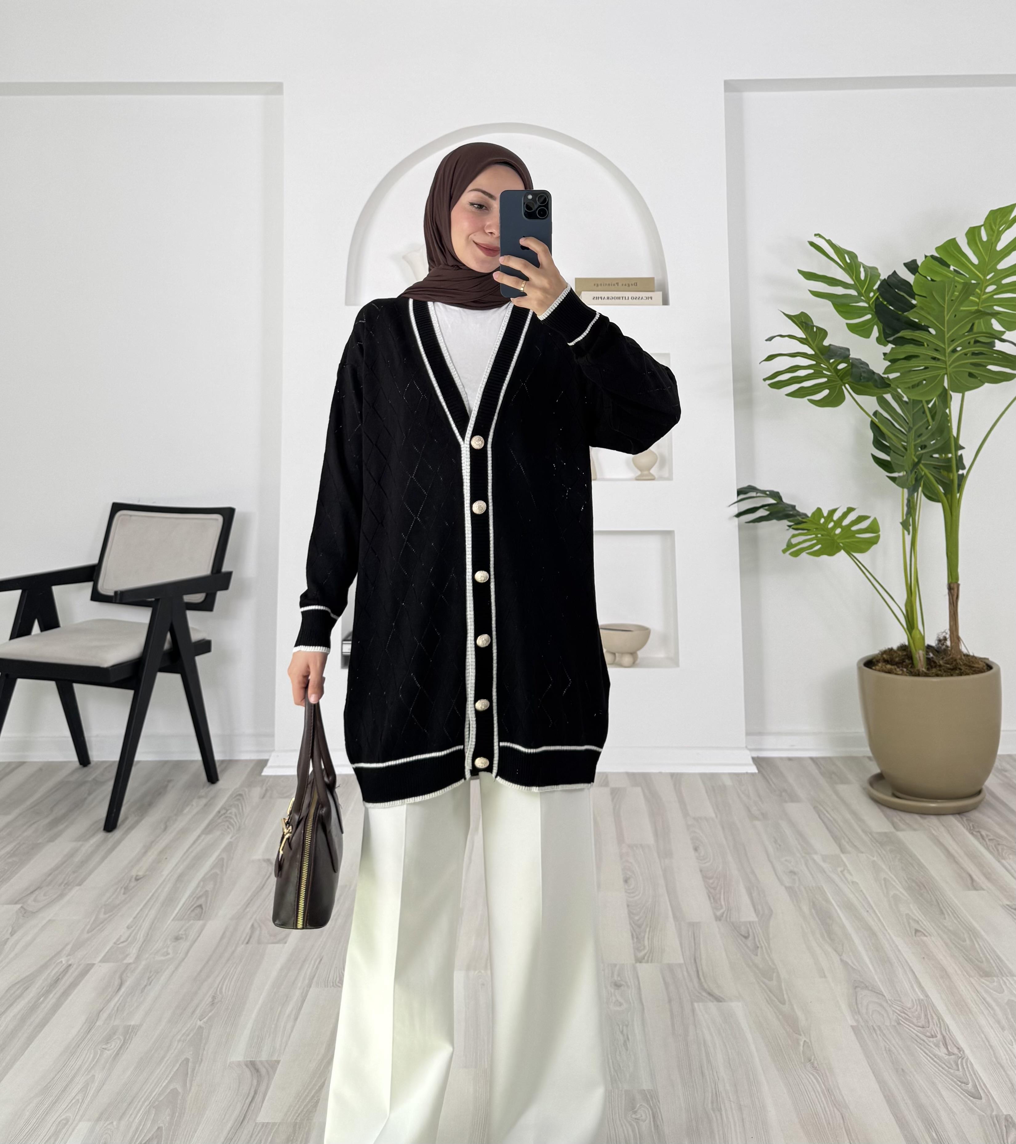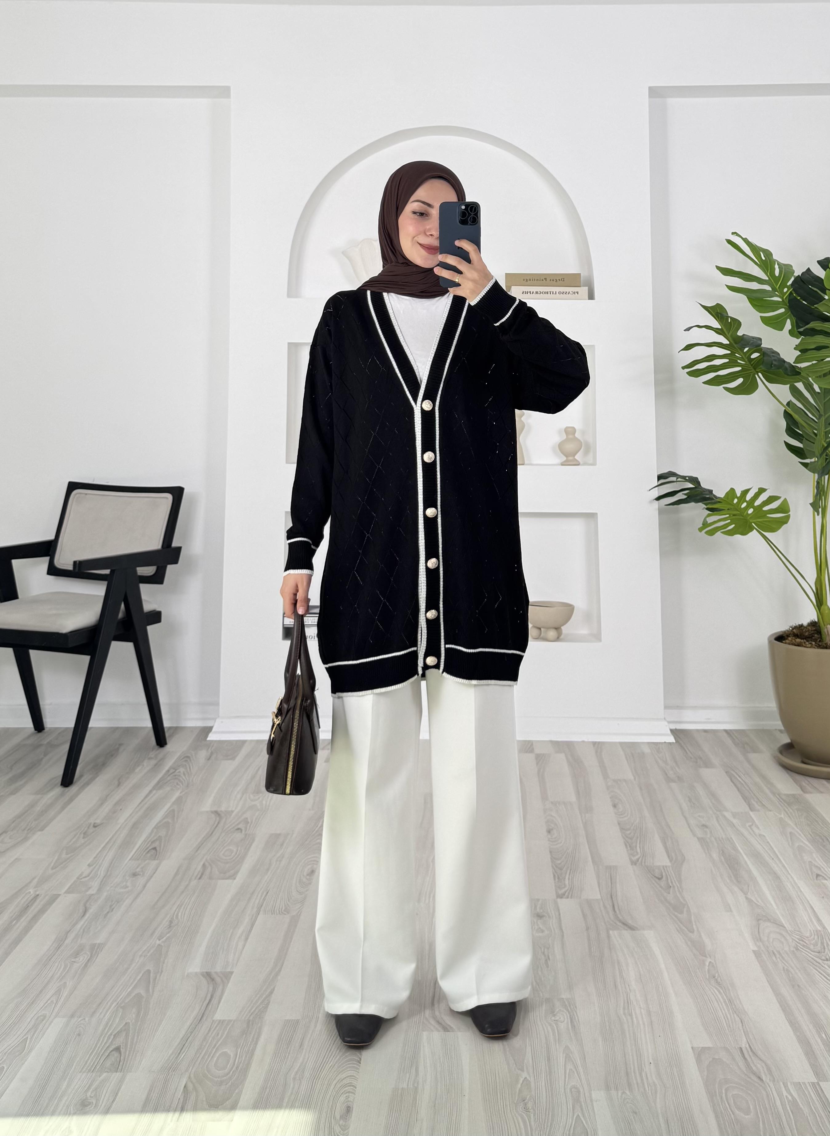 2442 - dügmeli uzun triko hırka - siyah (2442)