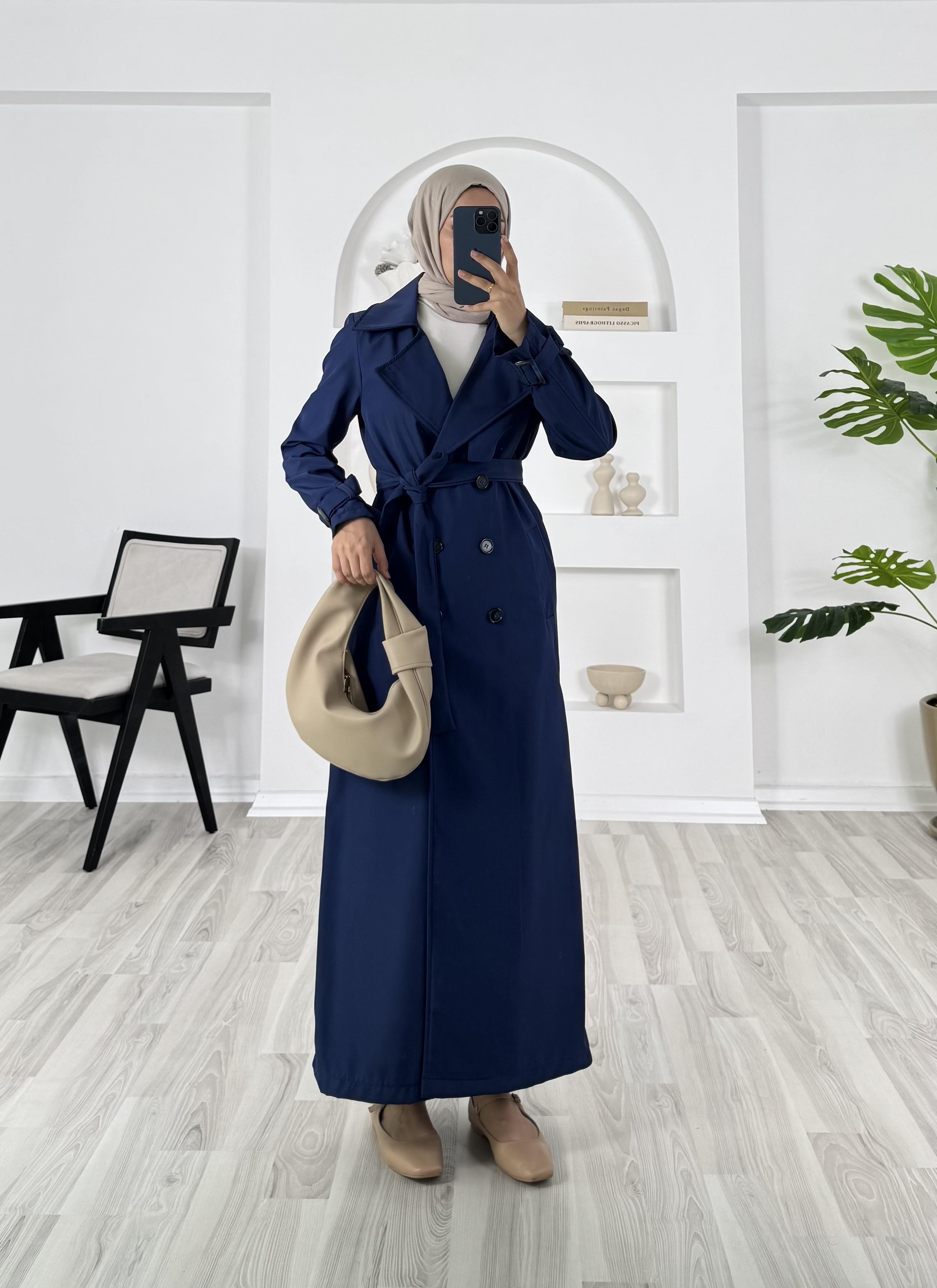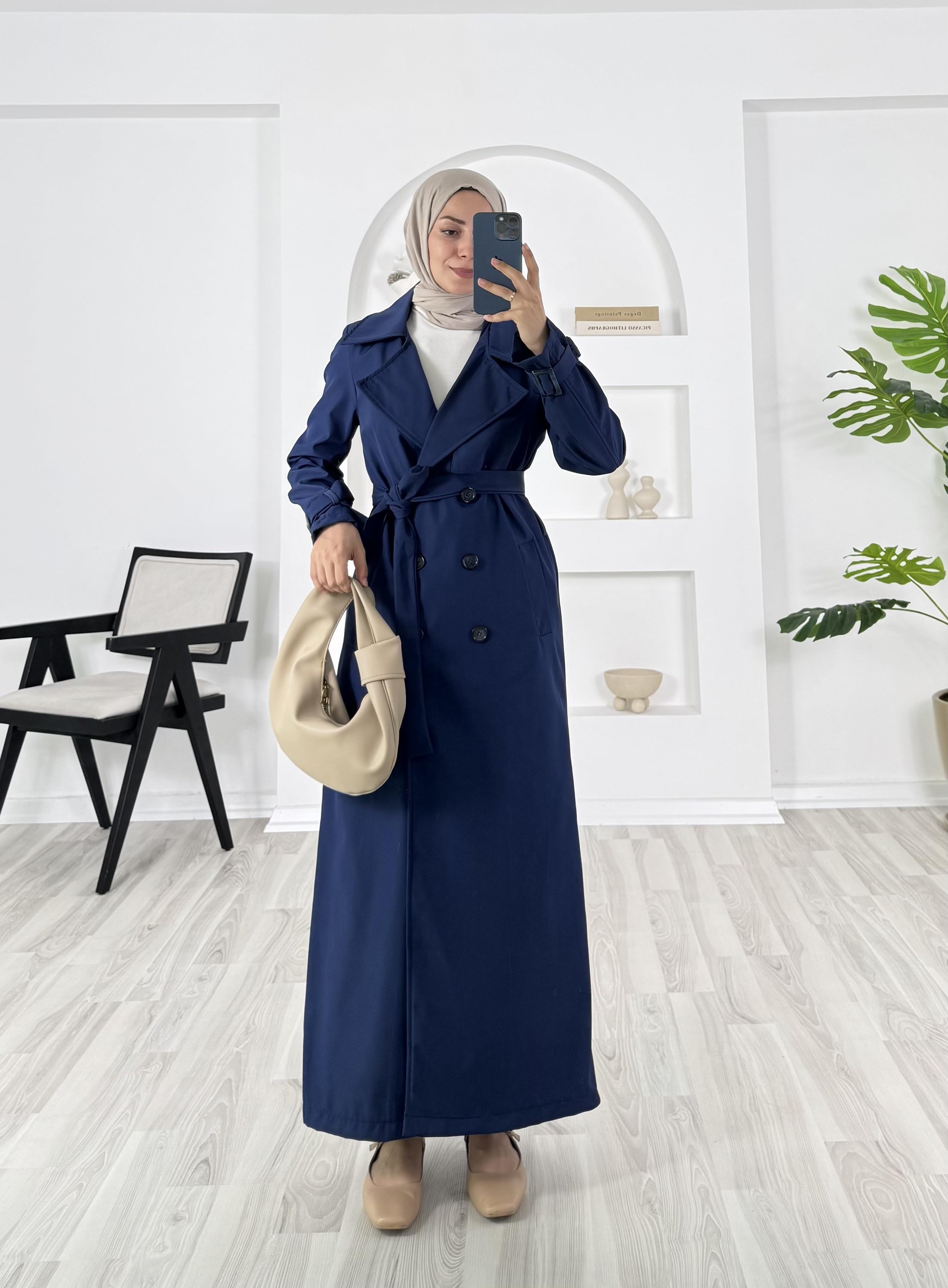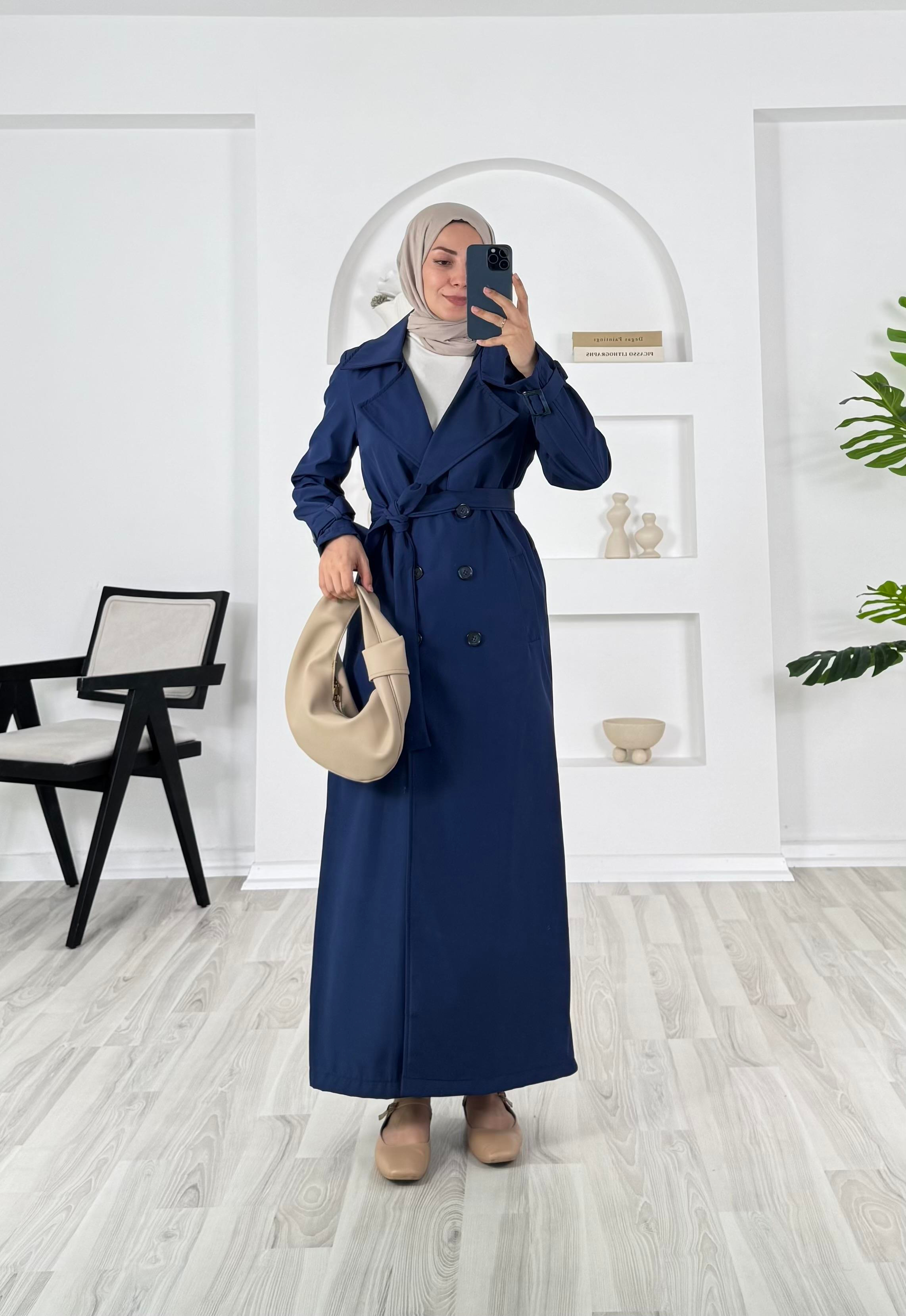 2460-bondit kumaş-bilek ucu kemerli tam boy trenç-saks mavisi (2460)