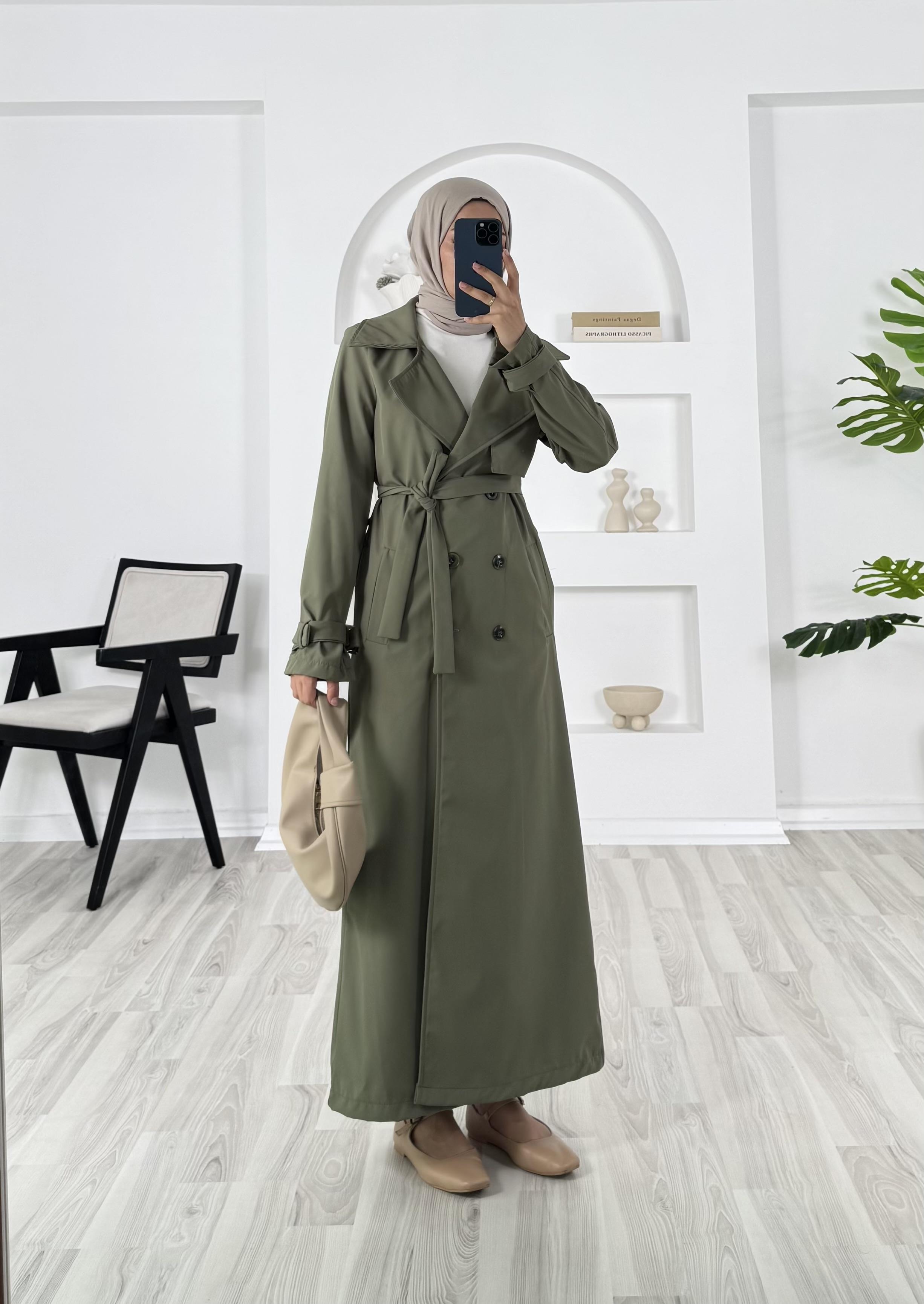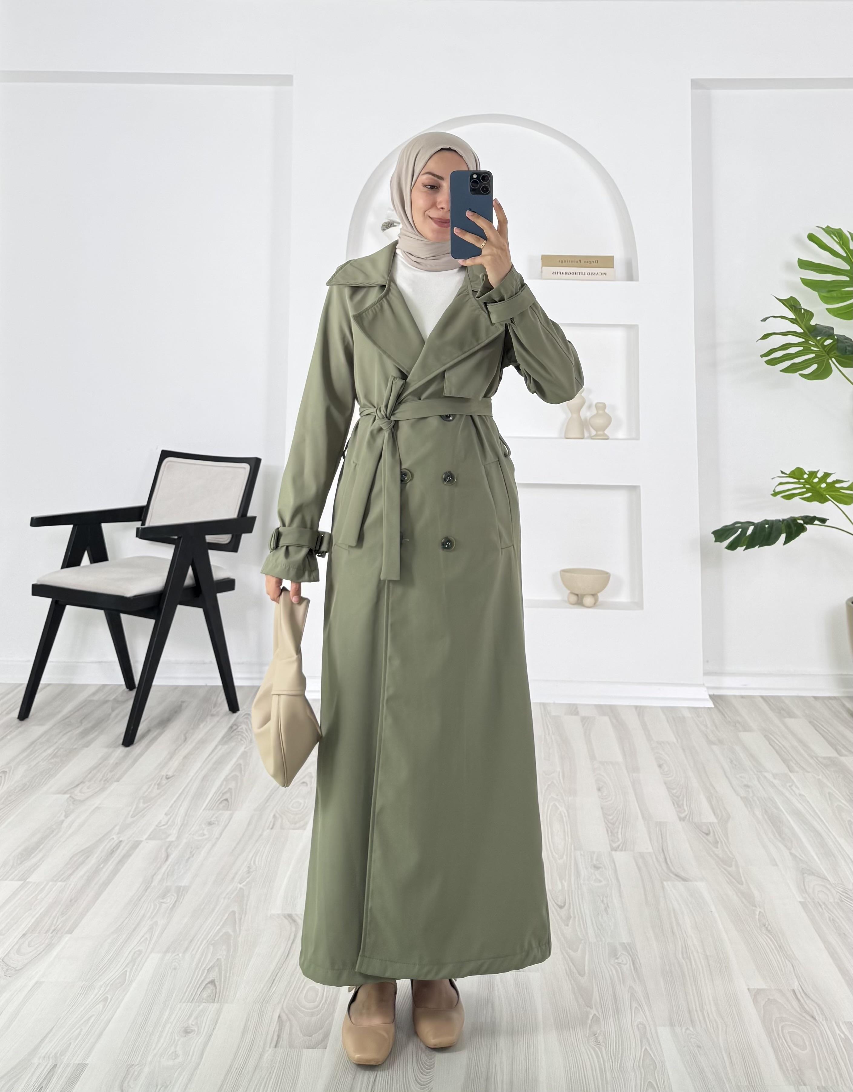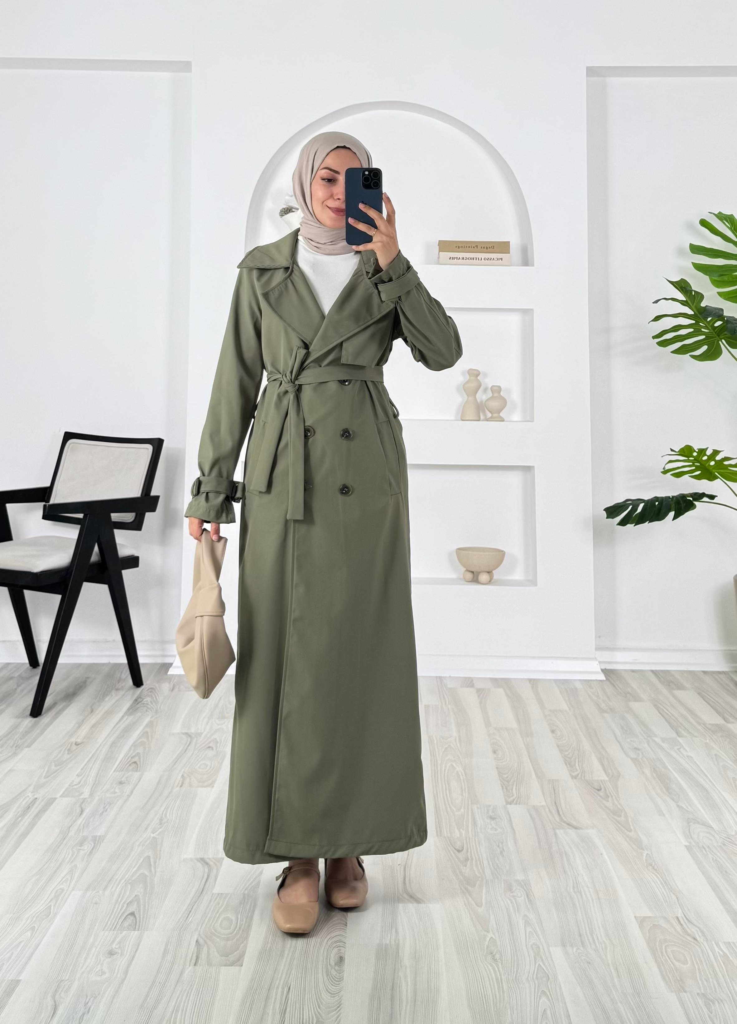 2460-bondit kumaş-bilek ucu kemerli tam boy trenç-yeşil (2460)