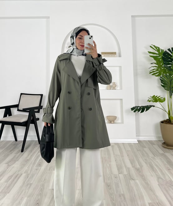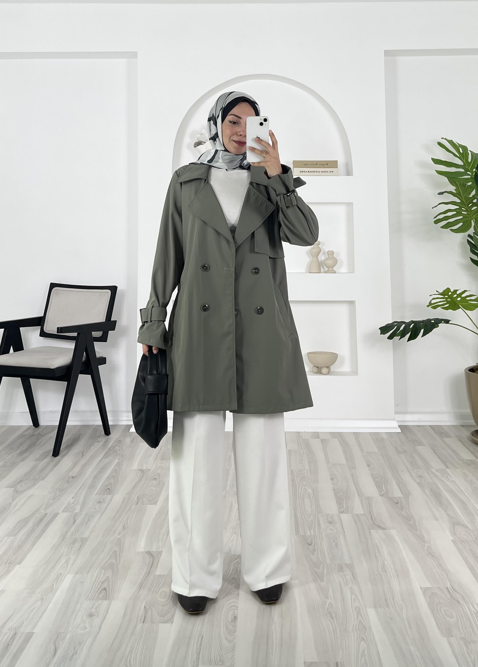 2464-bondit kumaş-bilek ucu kemerli kısa trenç-yeşil (2464)