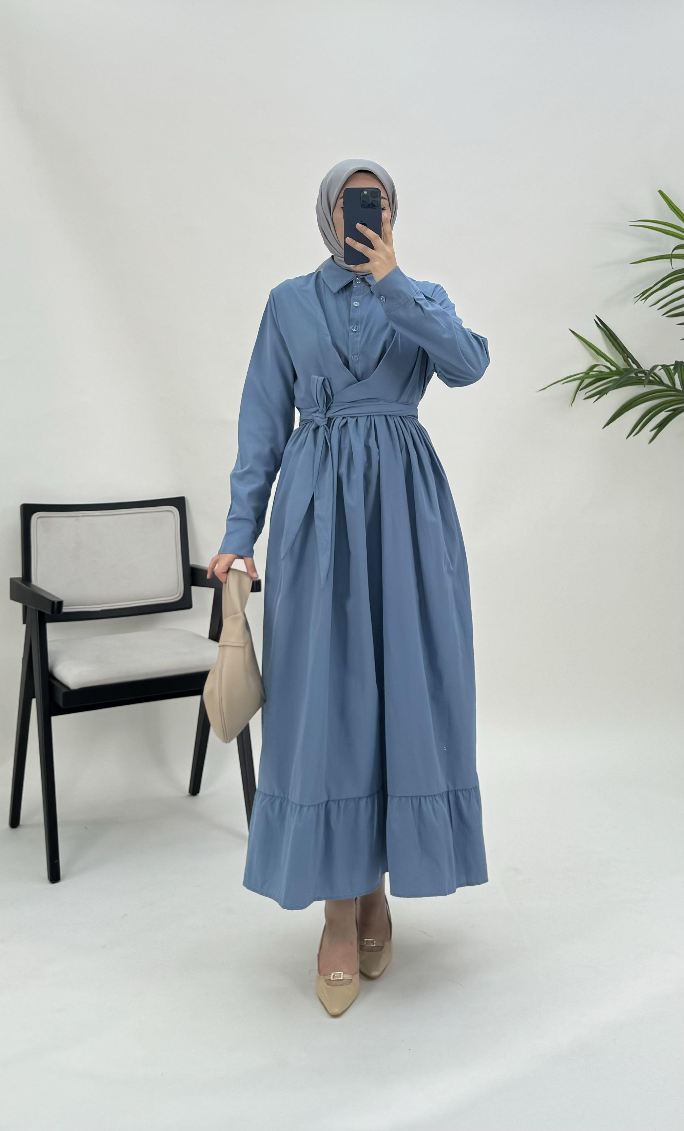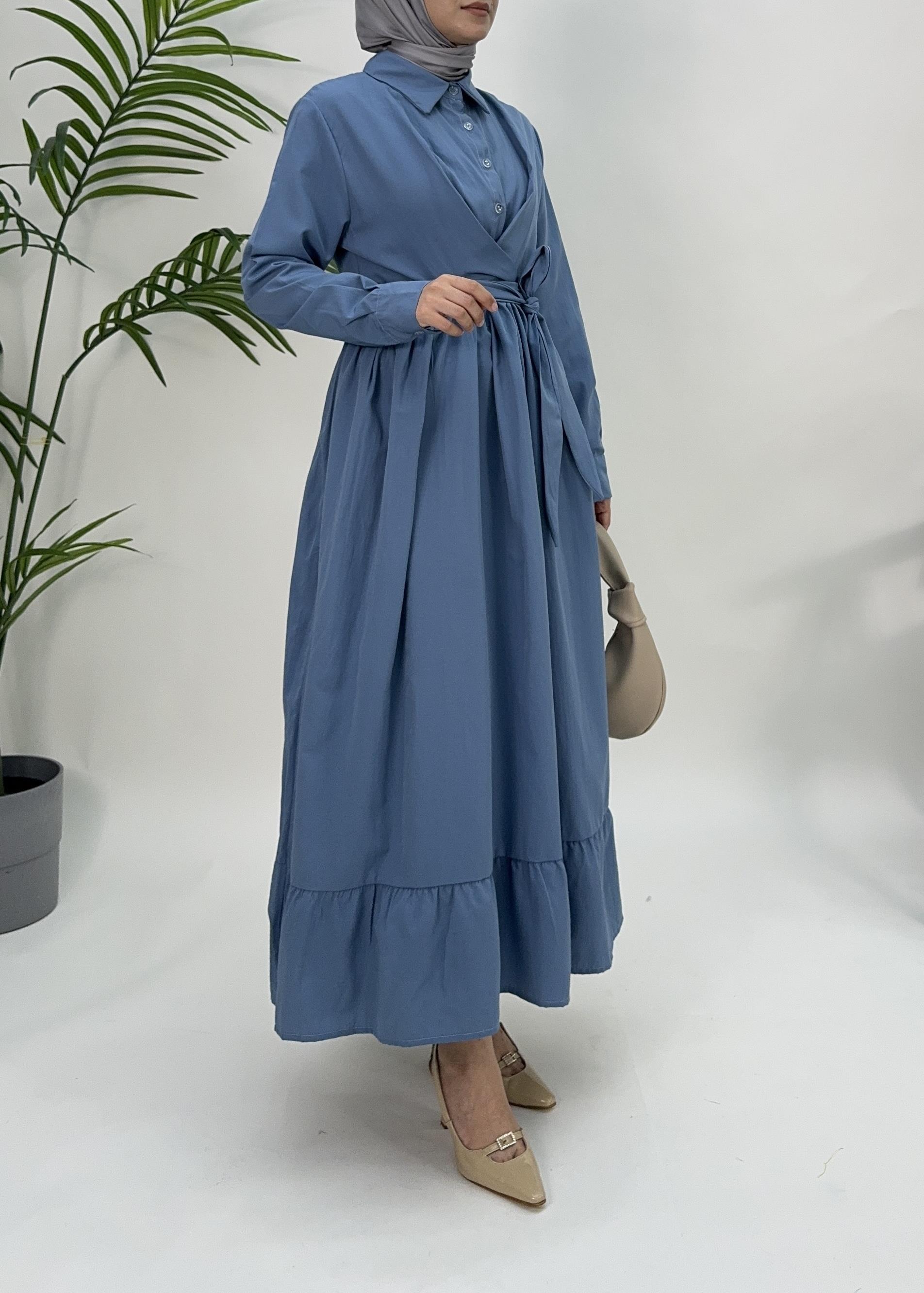2501-terikoton kumaş-önden bağlama detaylı alt kısmı fırfırlı elbise-bebe mavisi (2501)