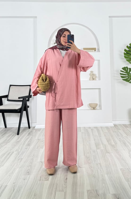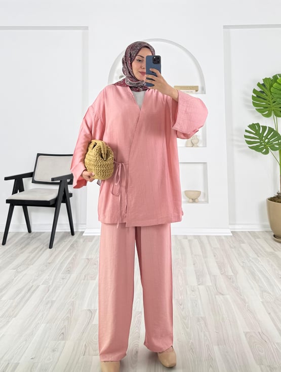 önden bağlamalı pantolonlu takım