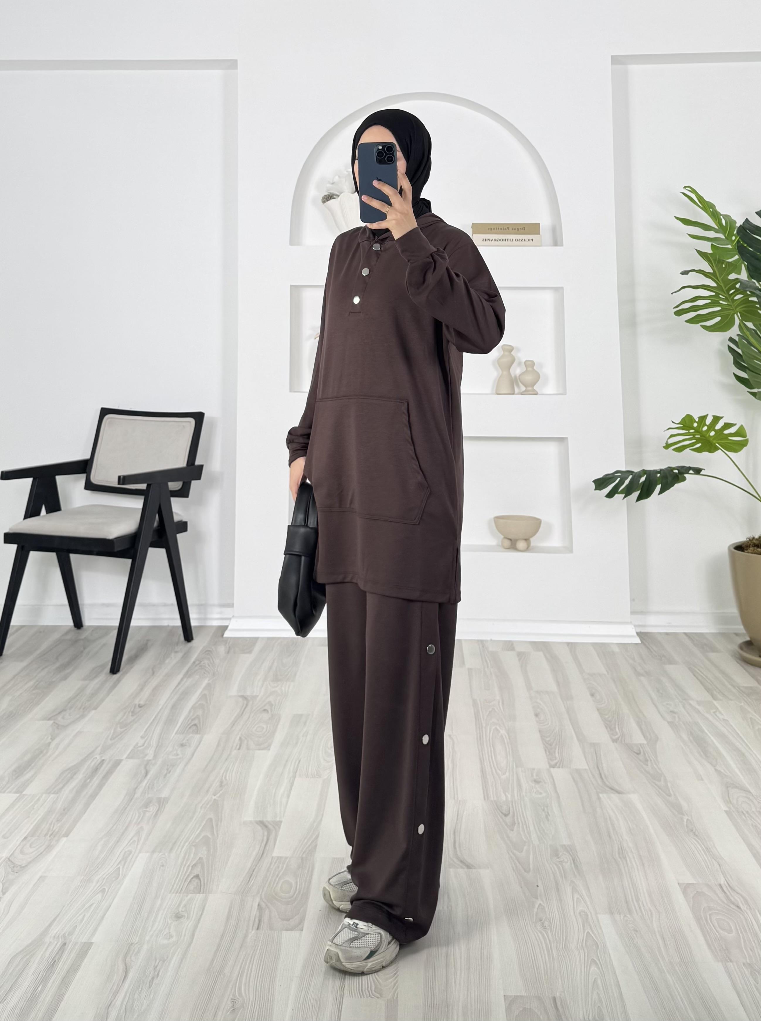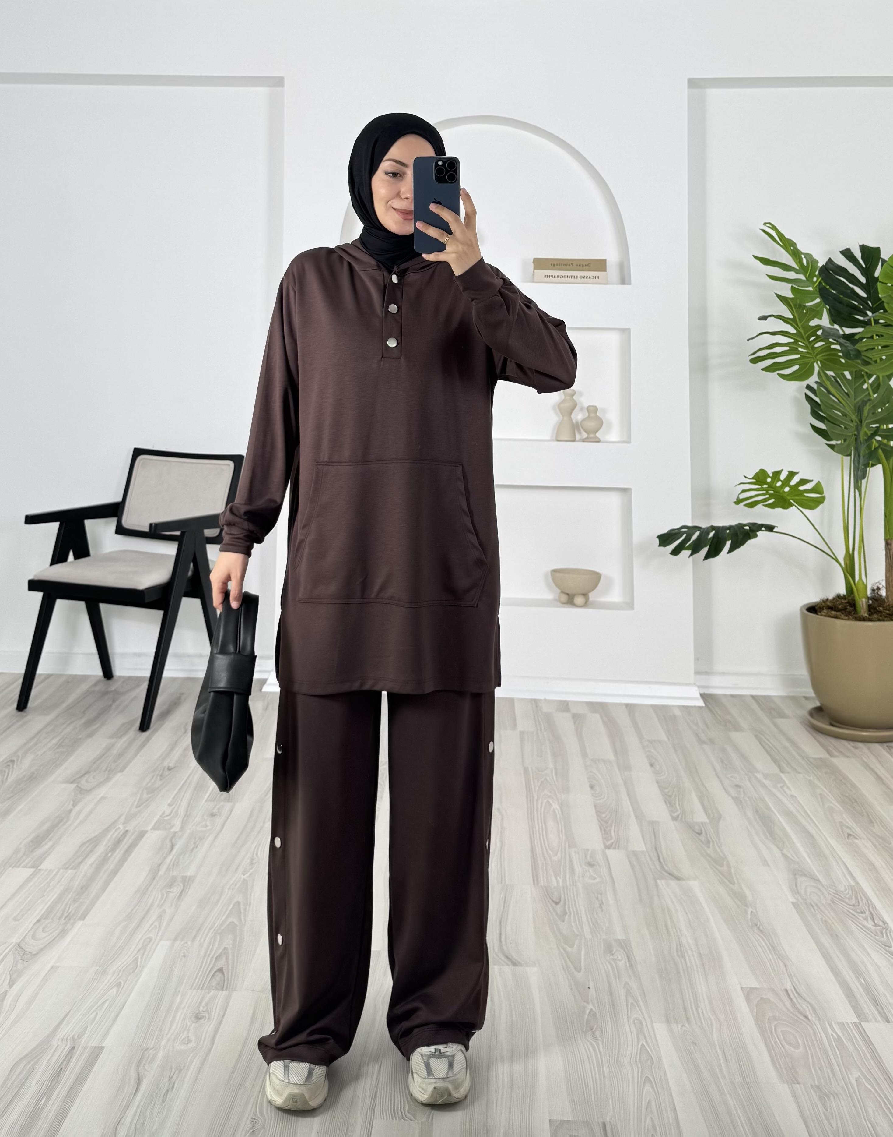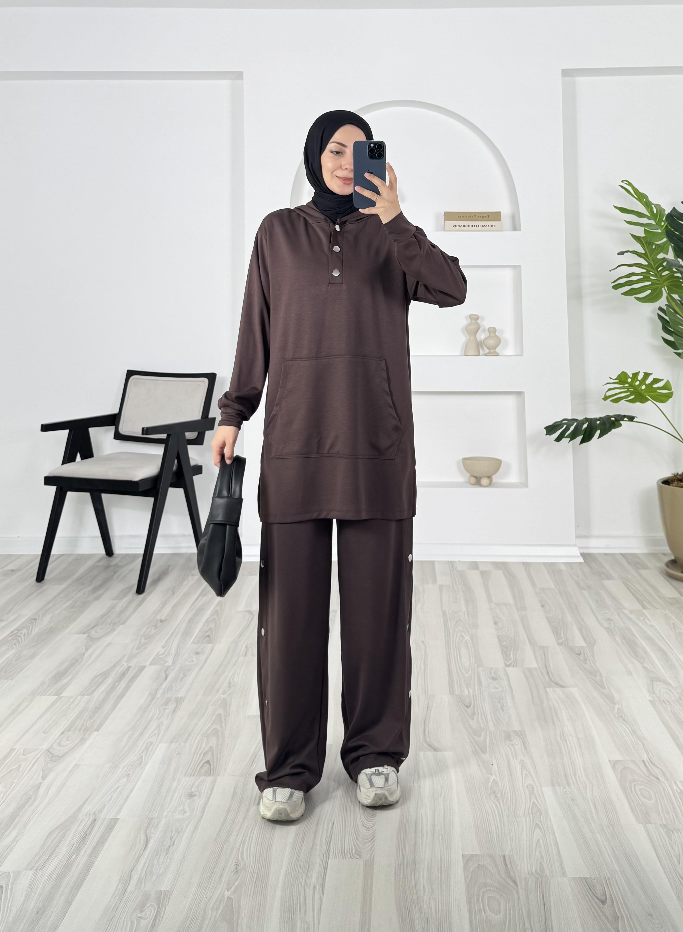 26126-oysho kumaş-kapşonlu çıtçıt detaylı pantolonlu takım-acı kahve (26126)