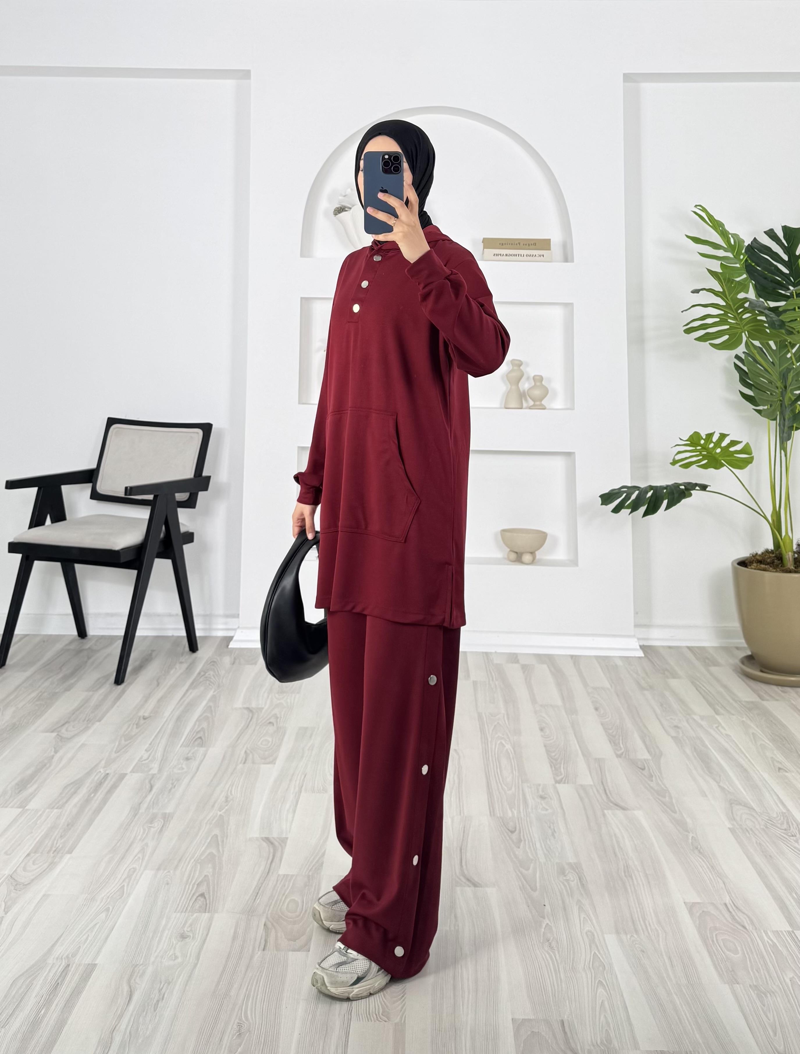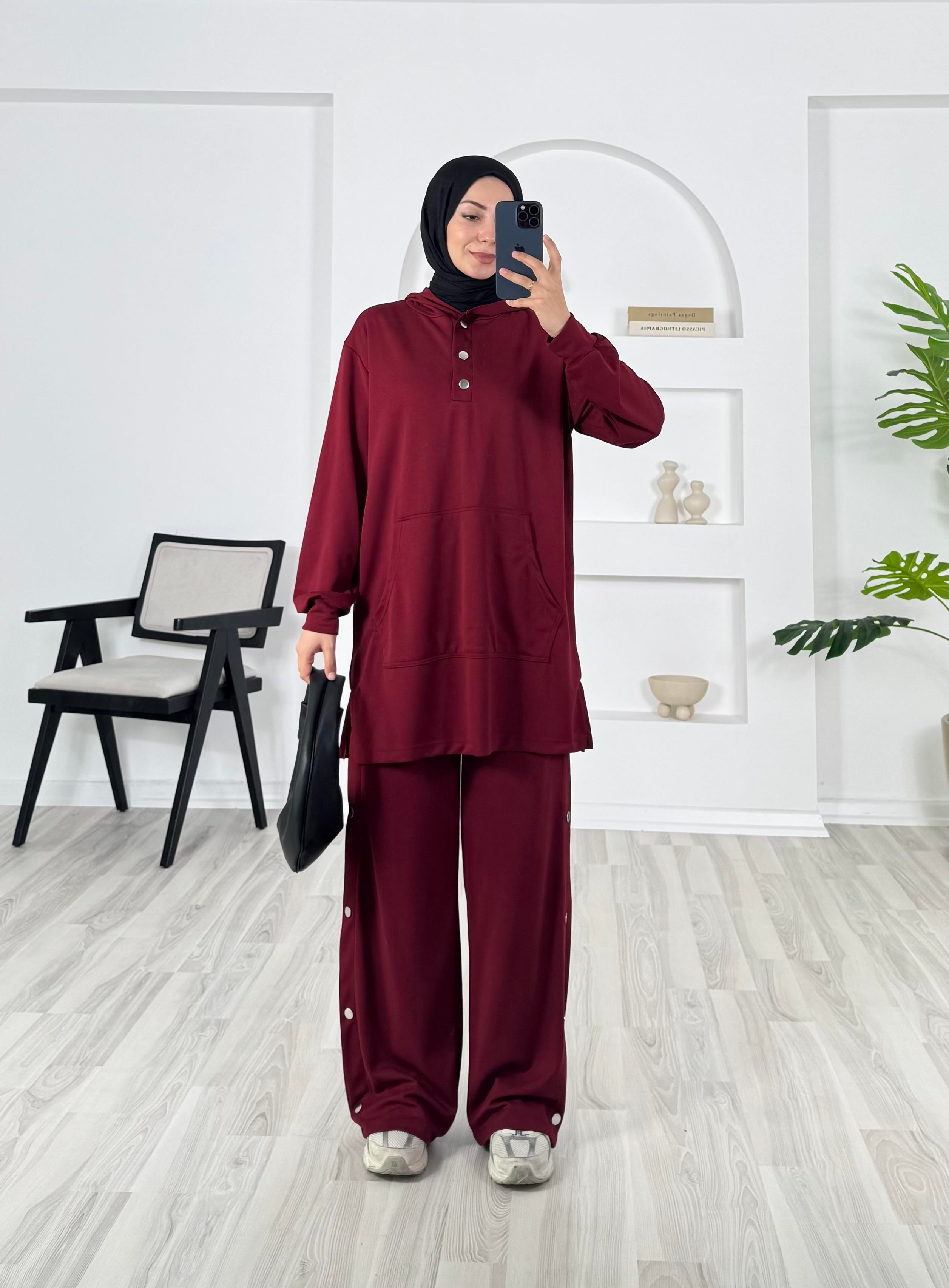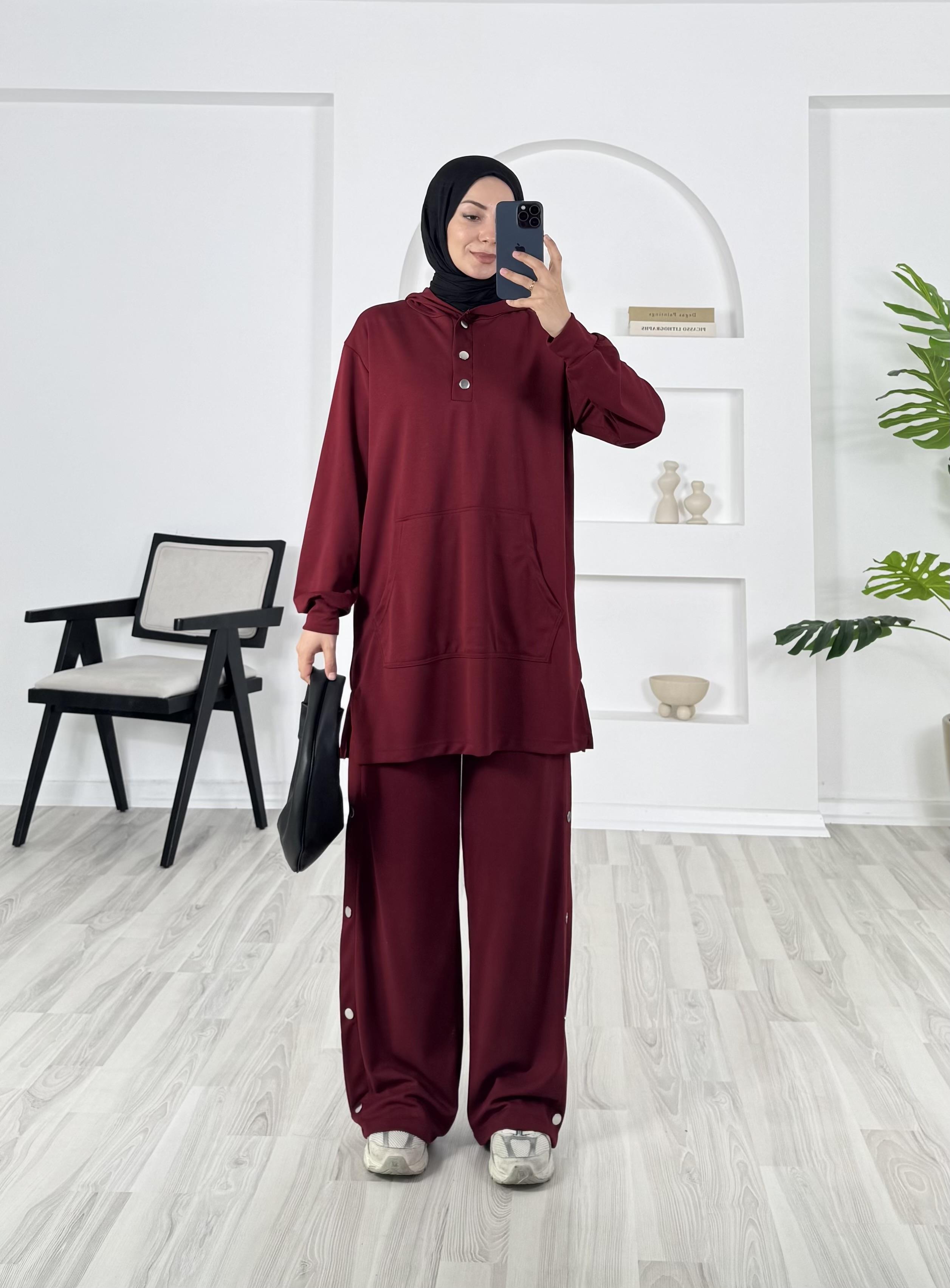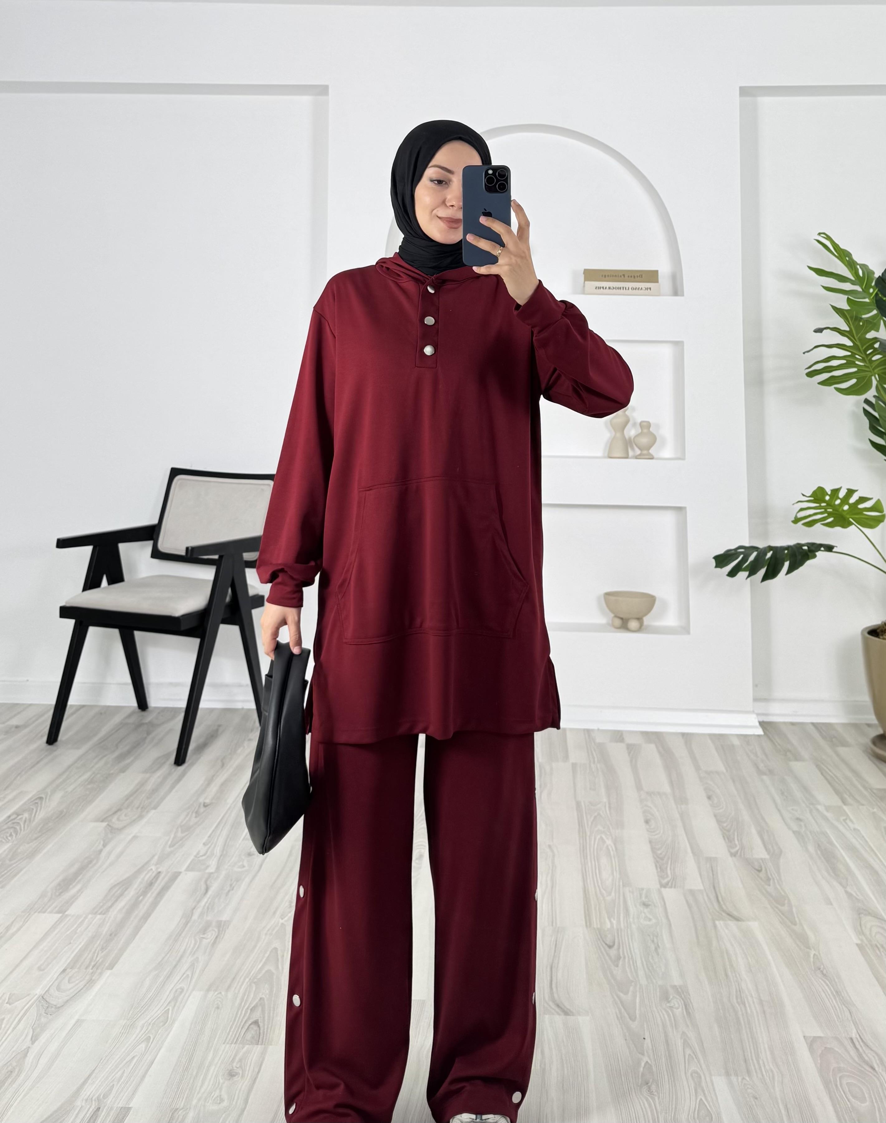 kapşonlu çıtçıt detaylı pantolonlu takım
