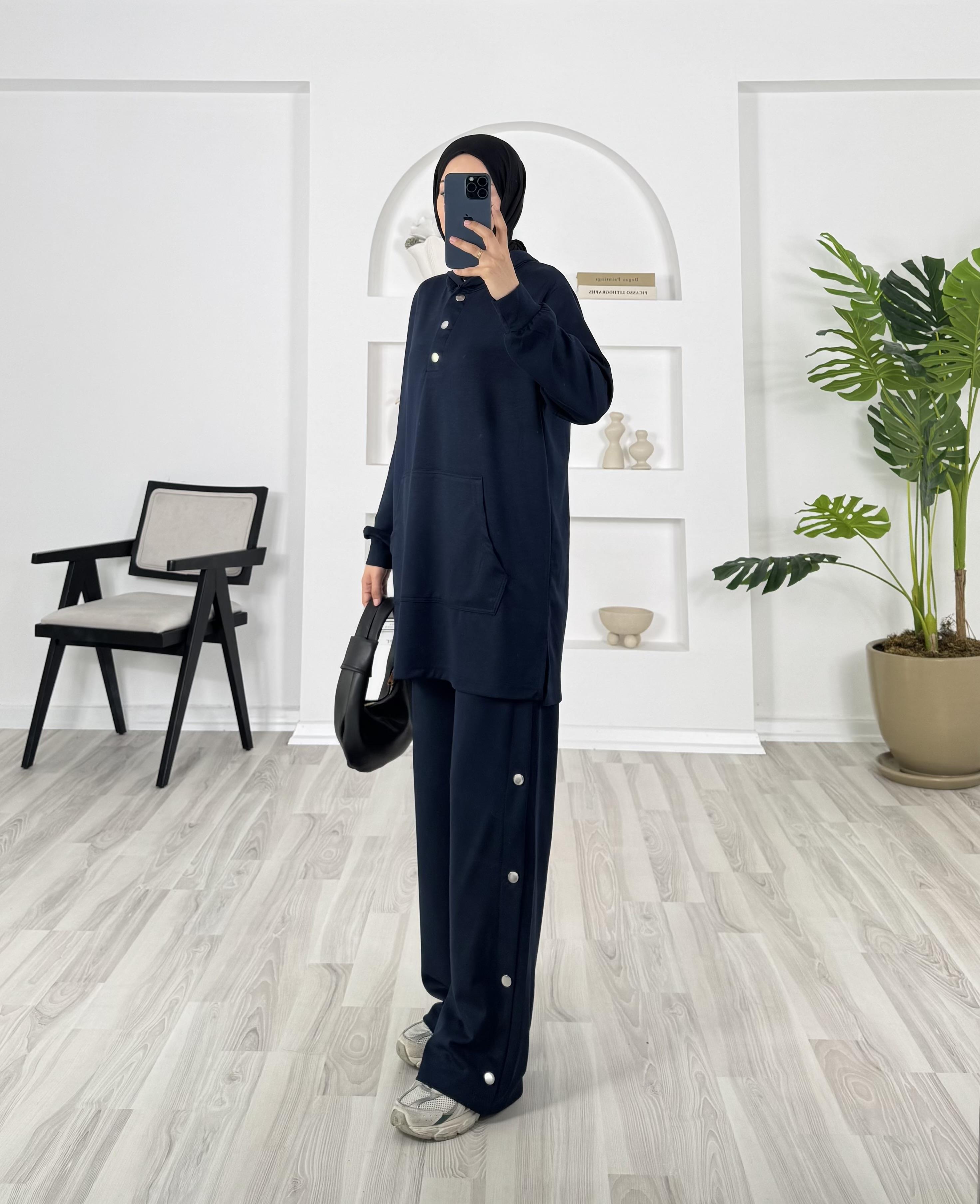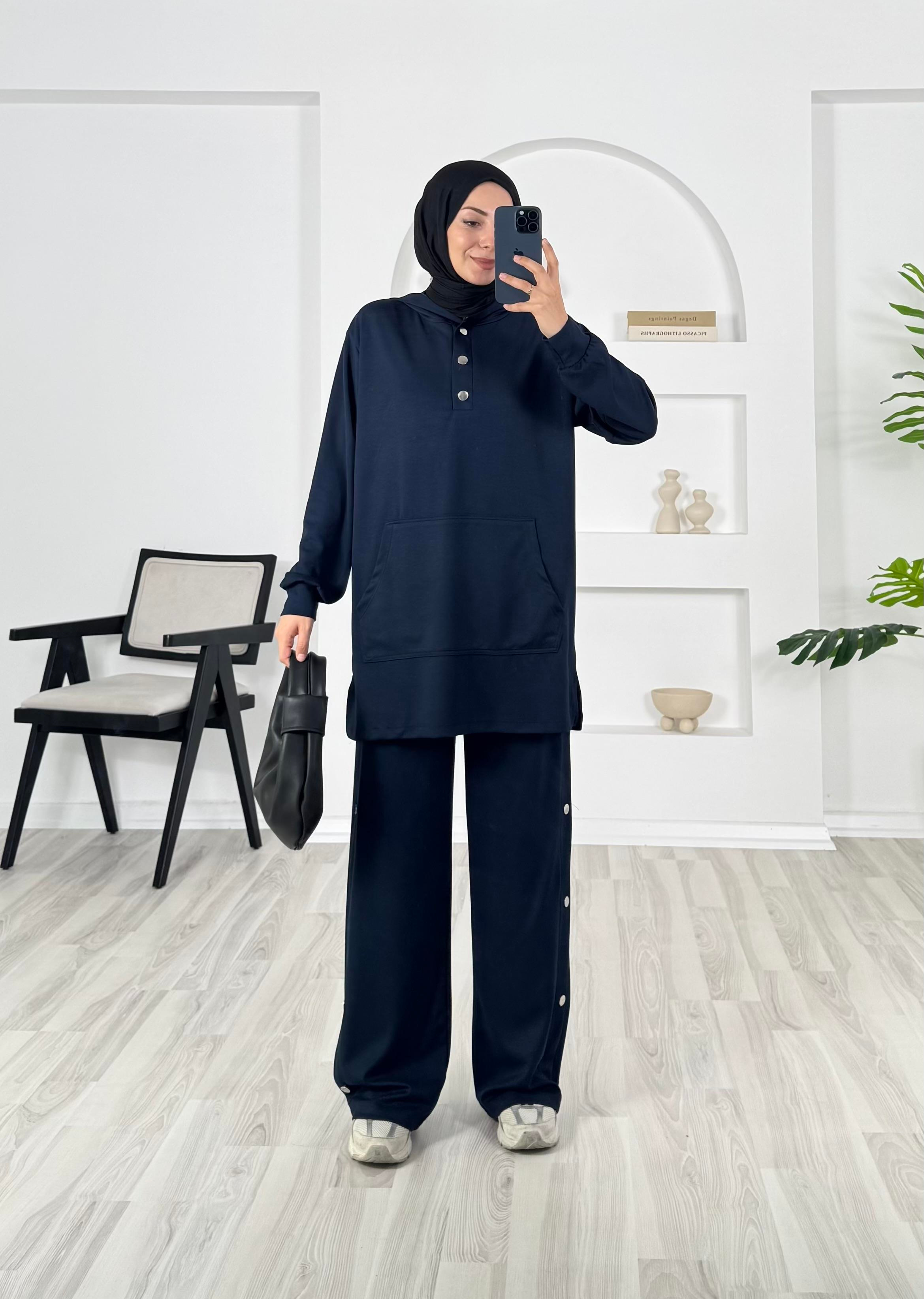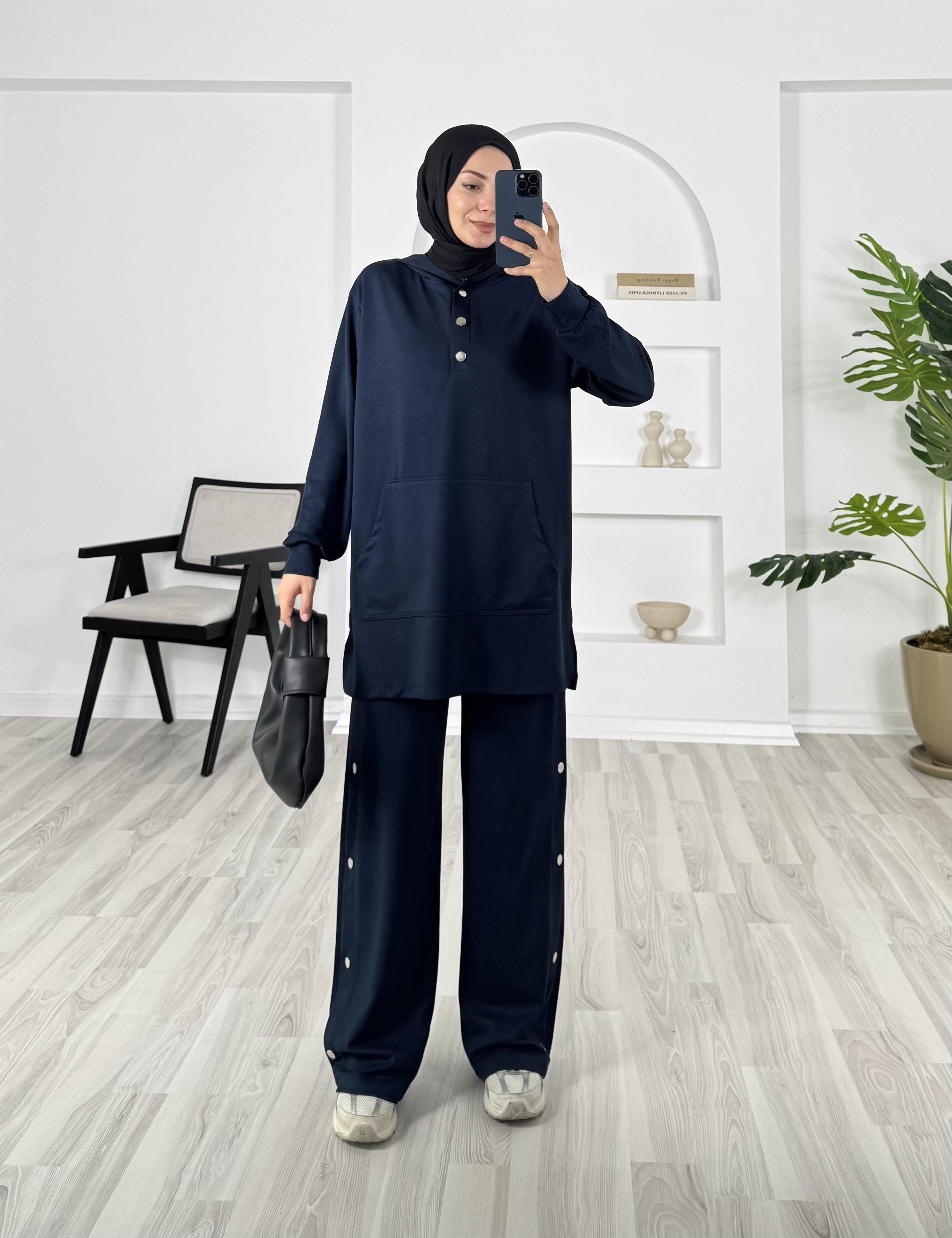 kapşonlu çıtçıt detaylı pantolonlu takım