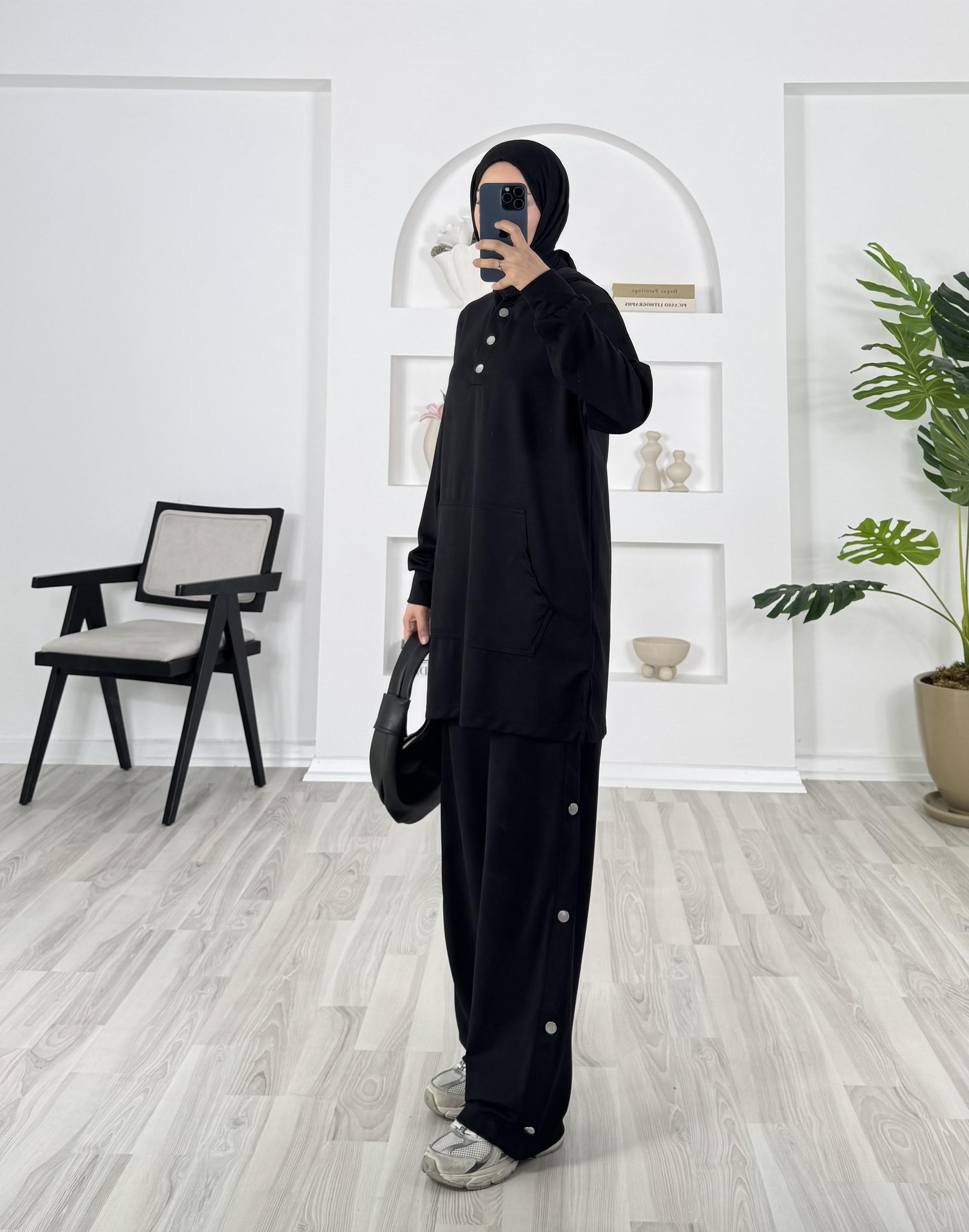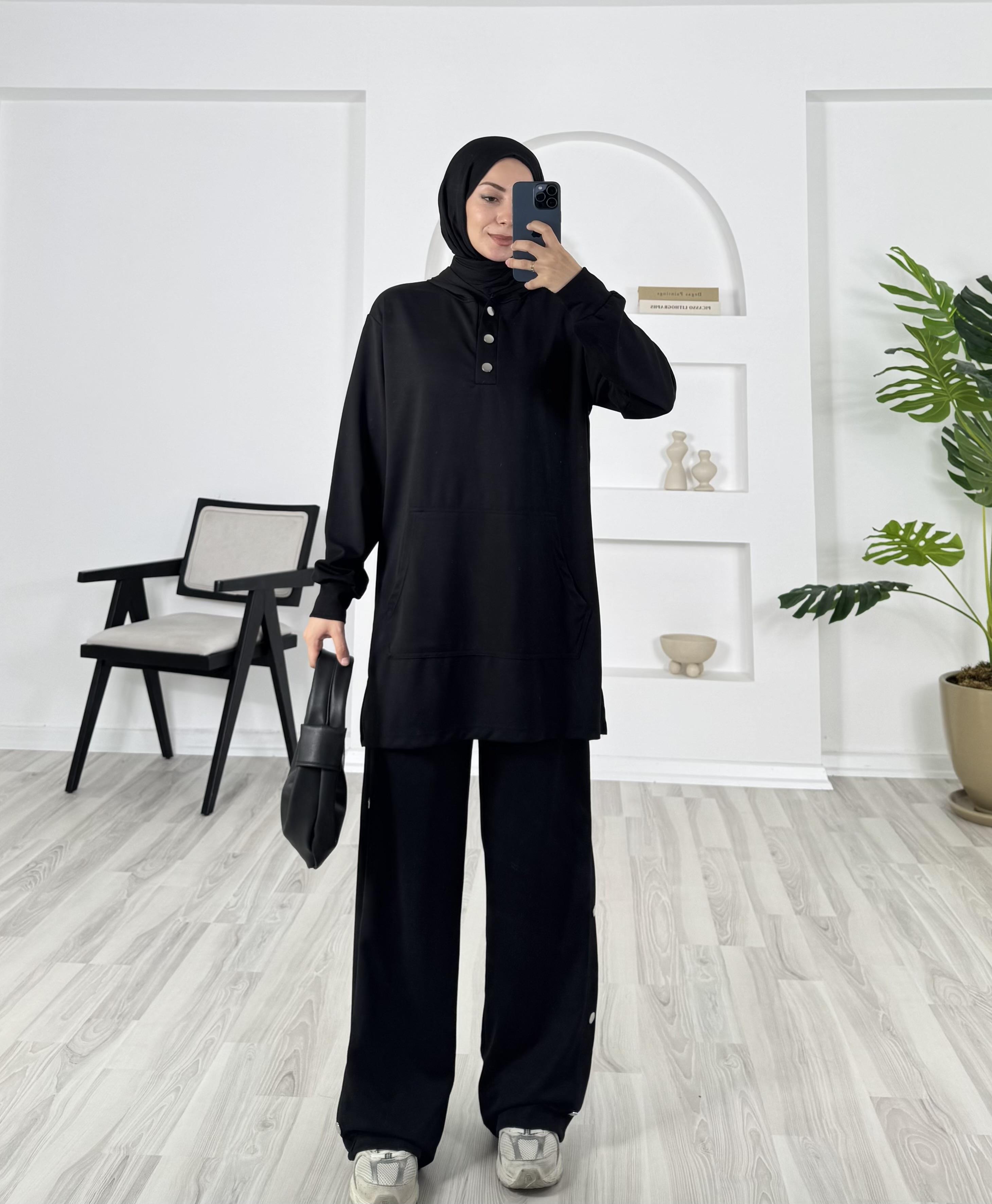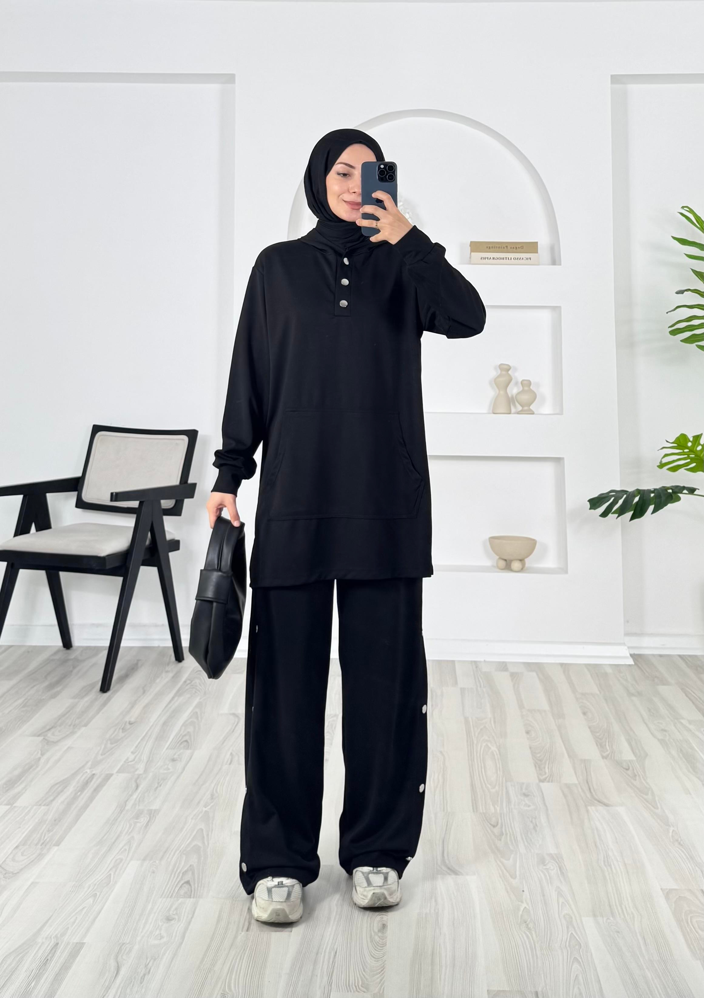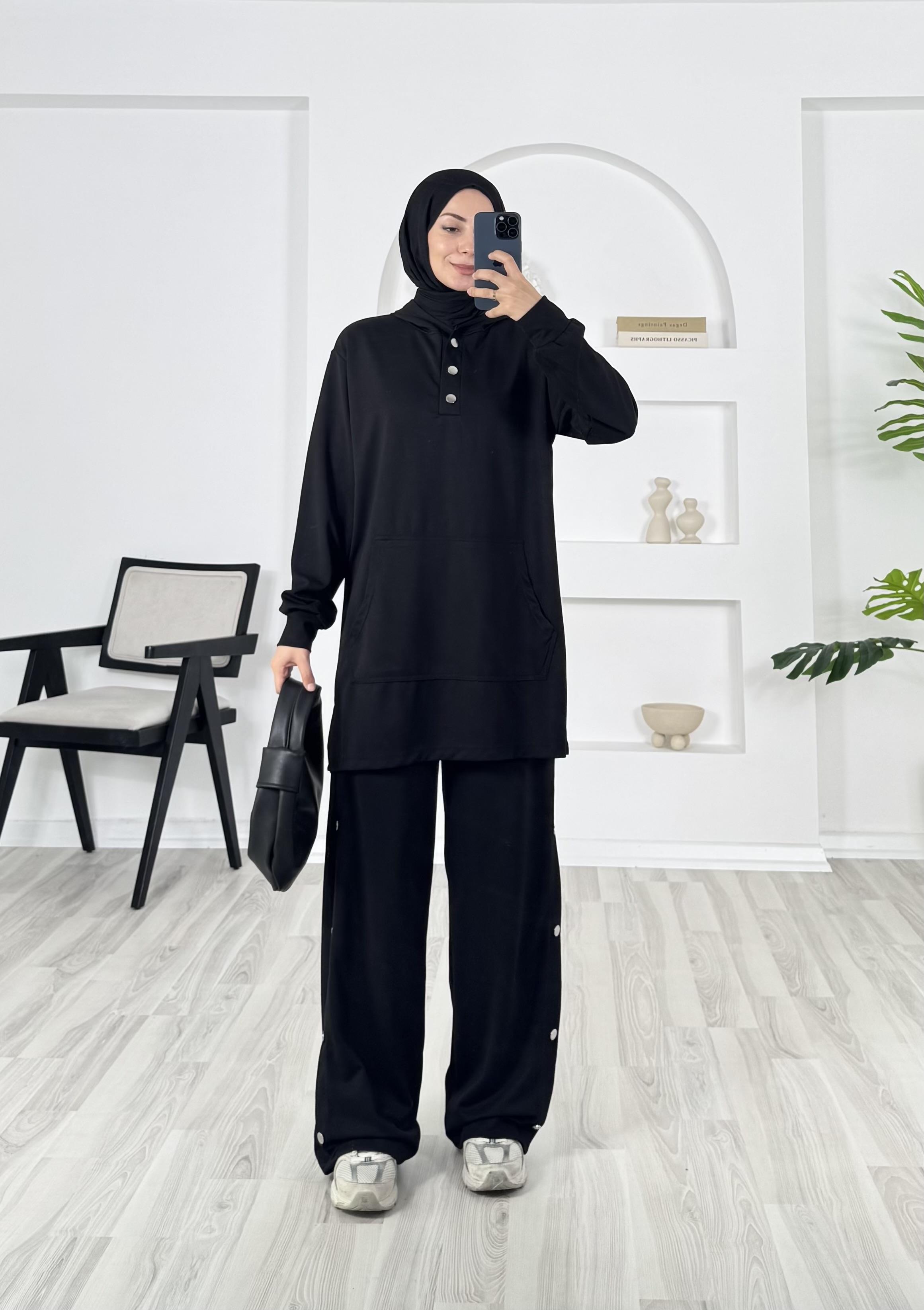 kapşonlu çıtçıt detaylı pantolonlu takım