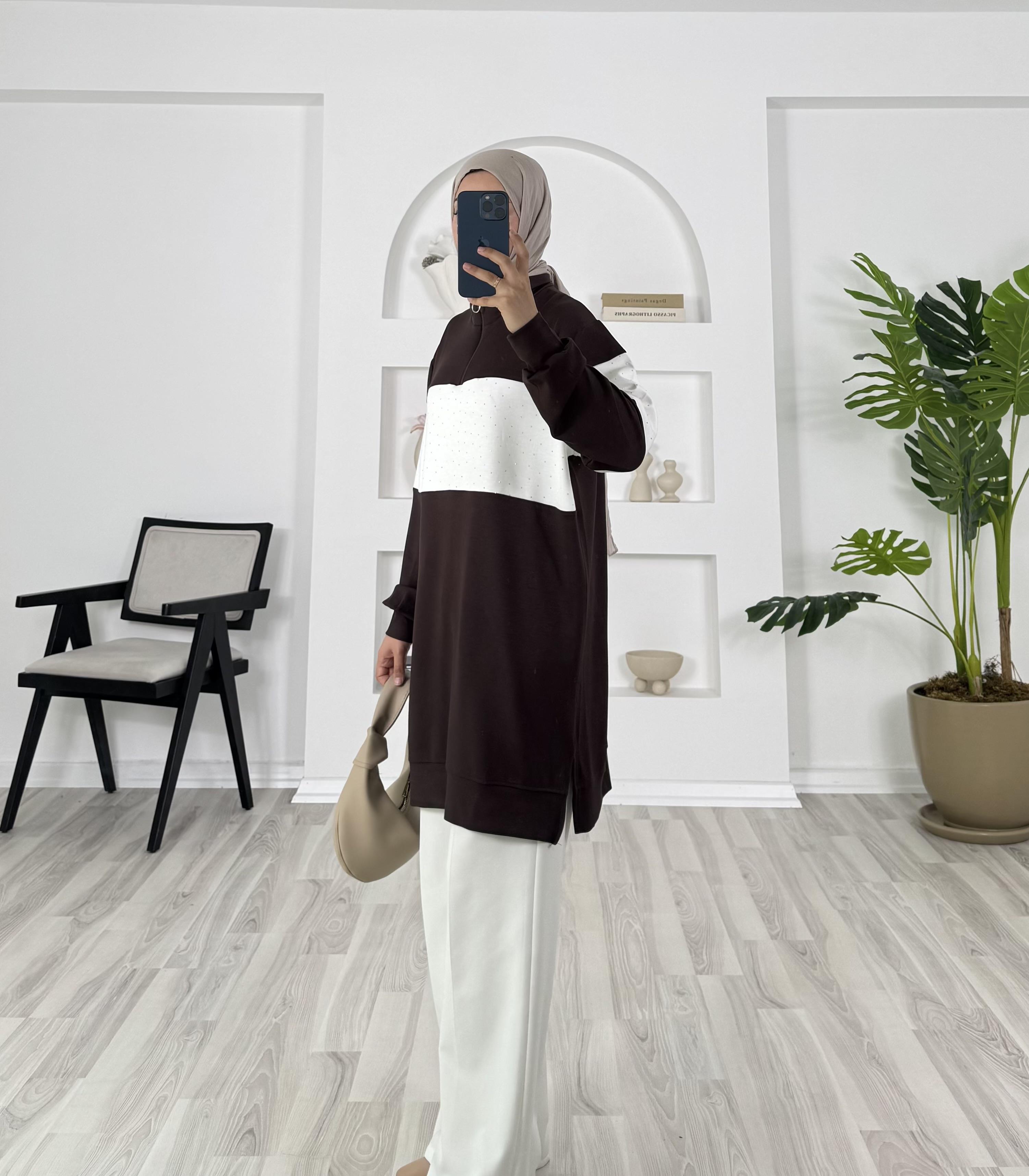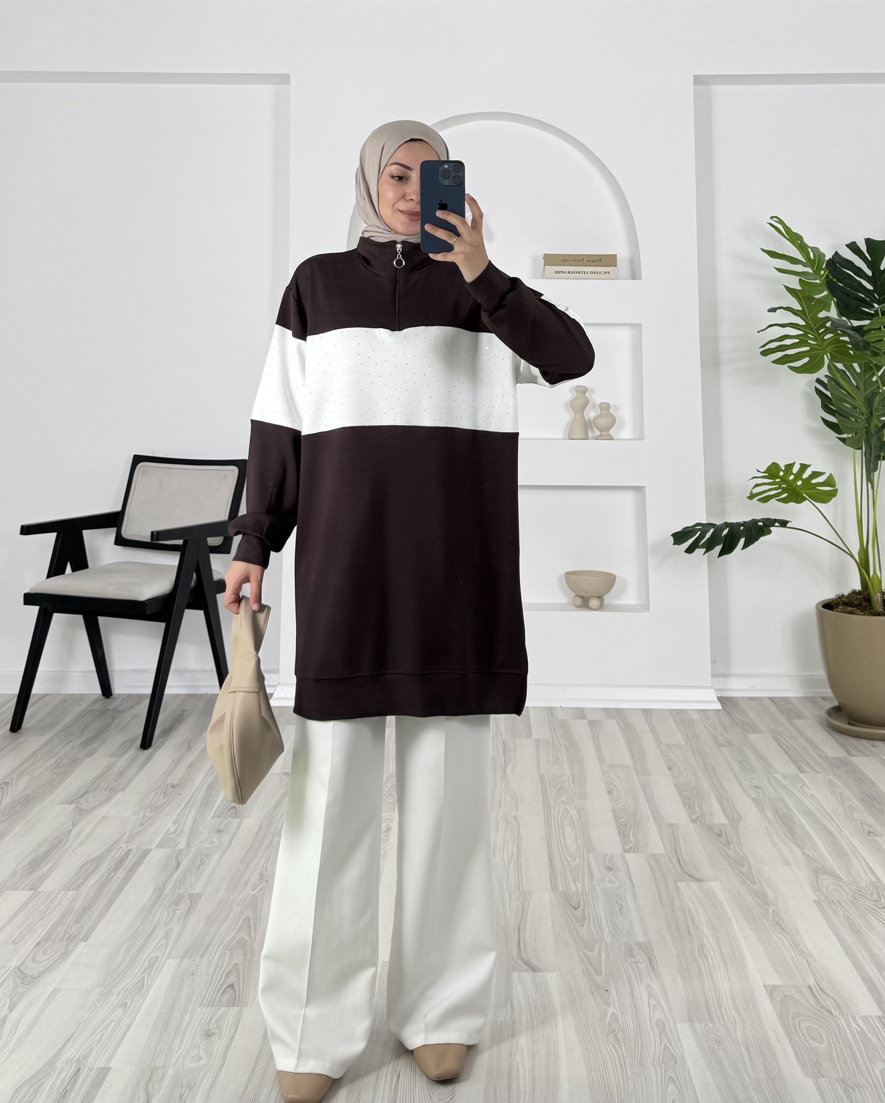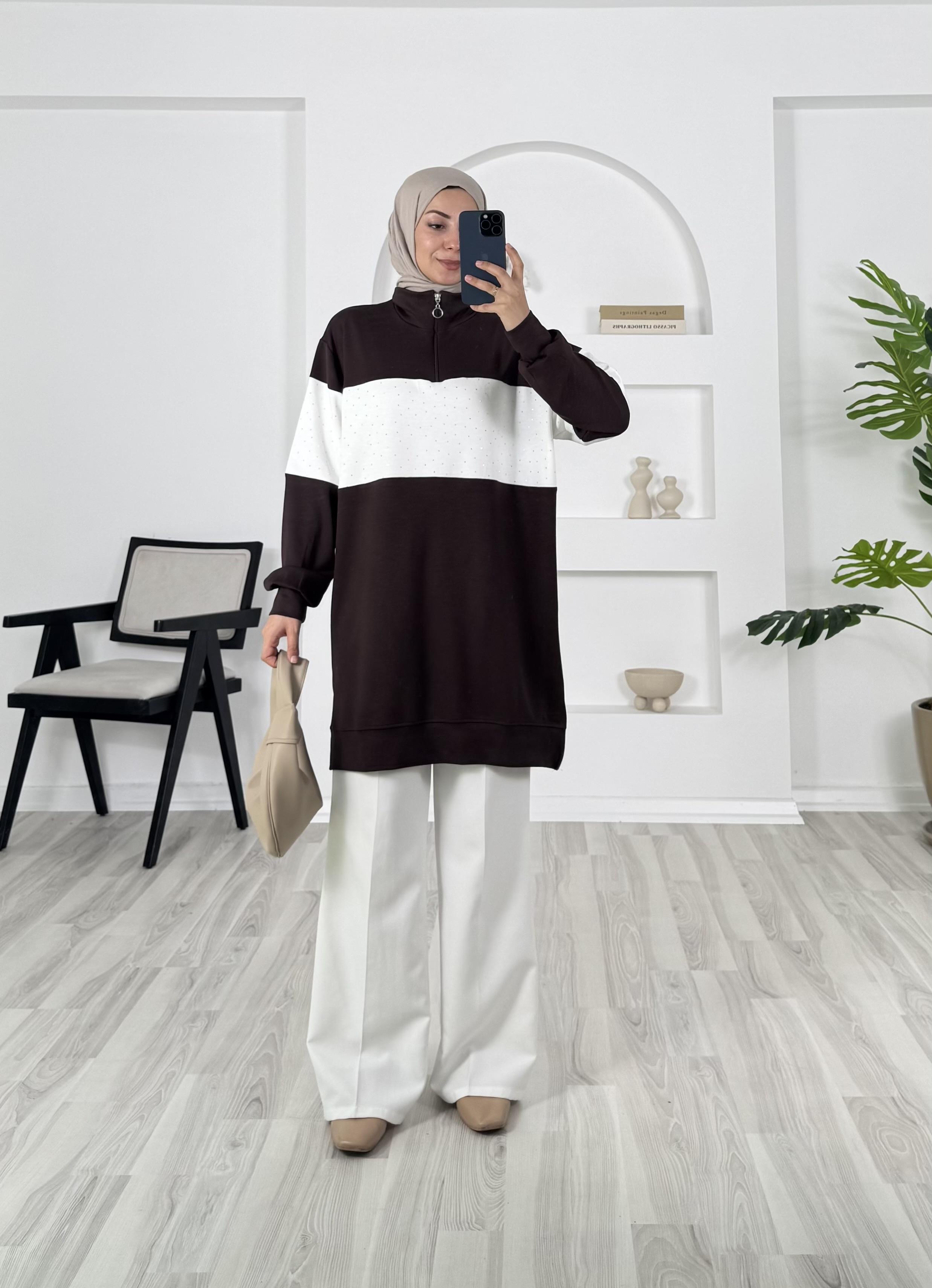 26127-oysho kumaş-yaka fermuar detaylı taşlı tunik-acı kahve (26127)