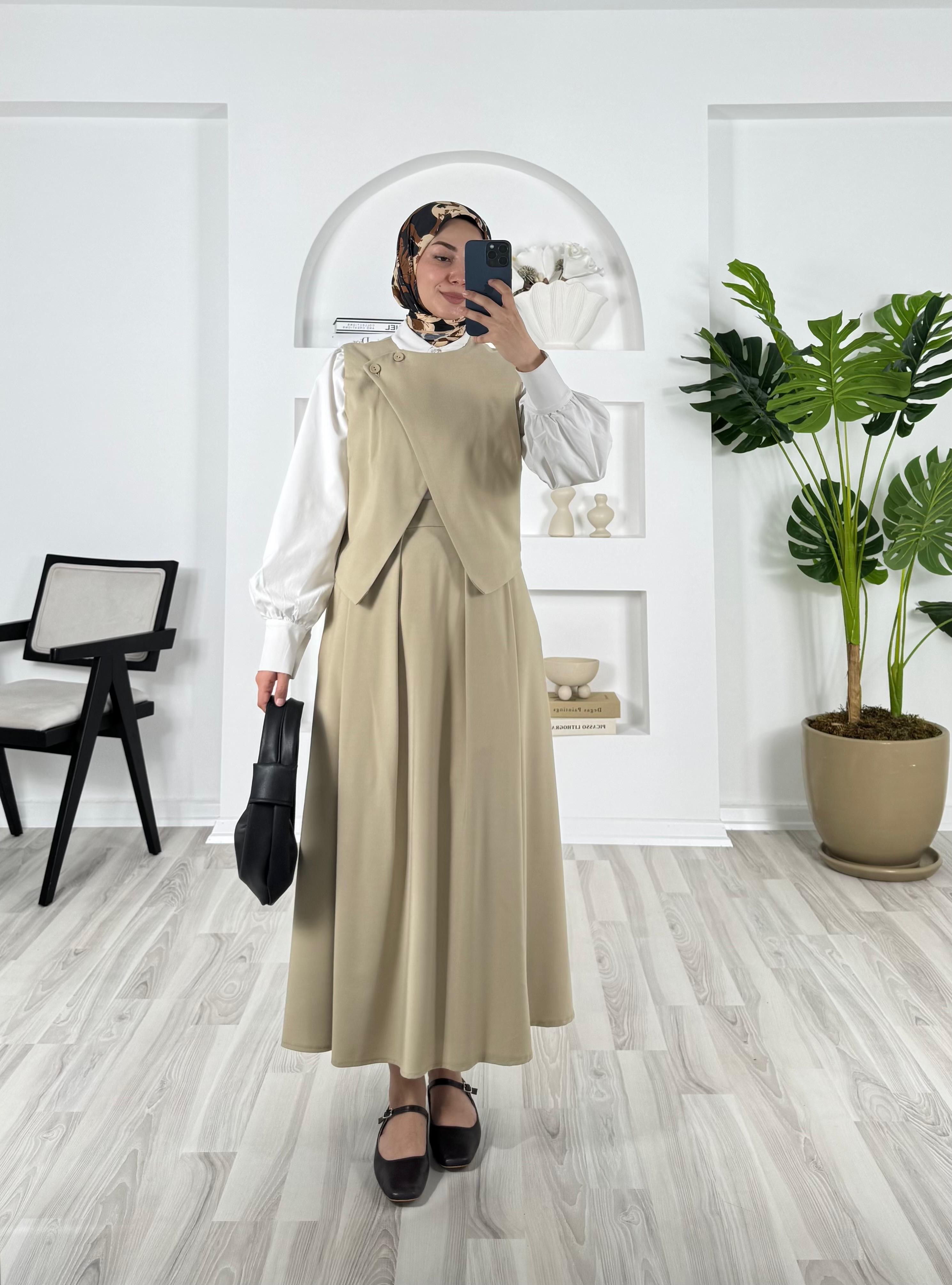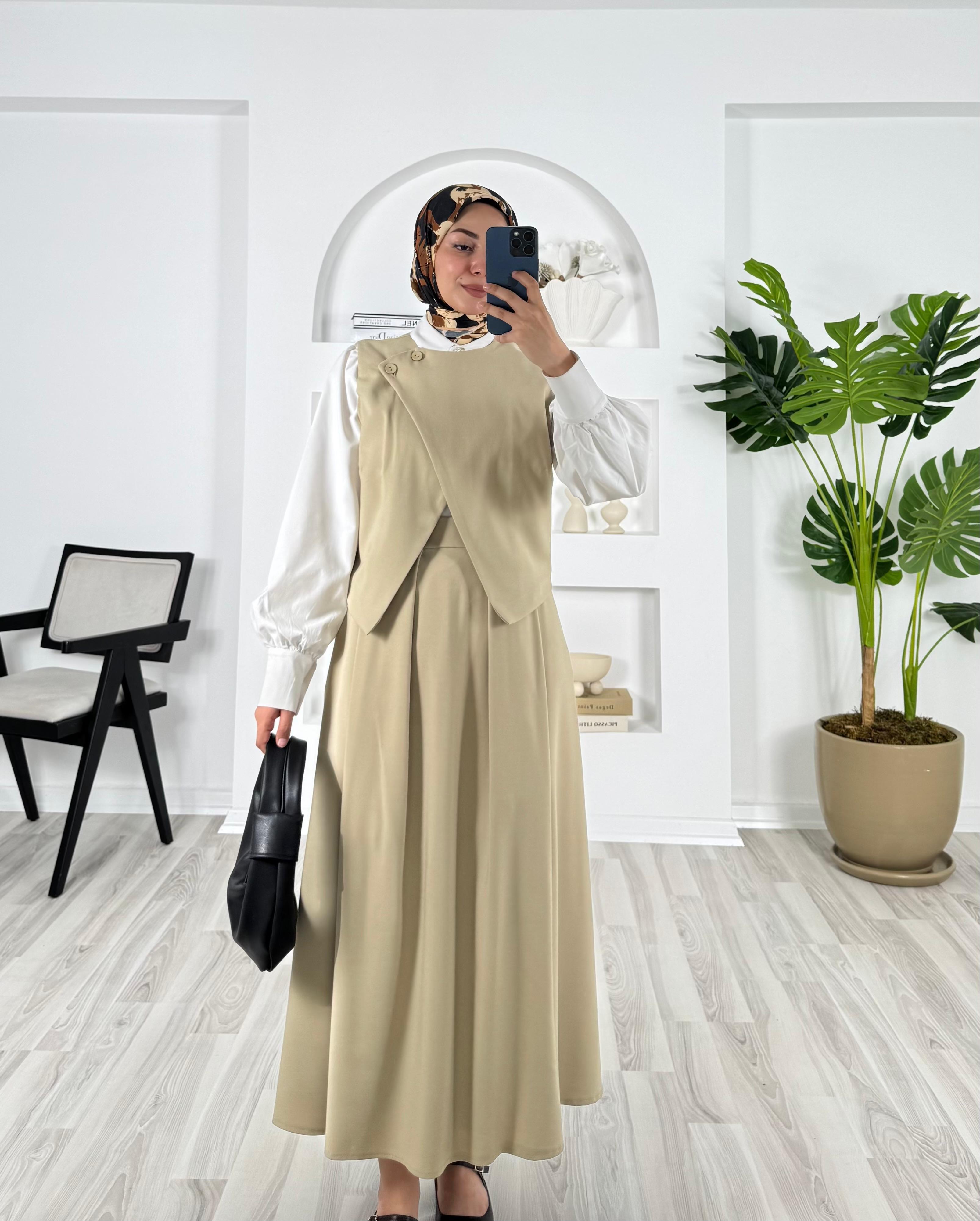 2625-poliviskon kumaş-omuz düğmeli asimetrik kesim etekli takım-taş (2625)