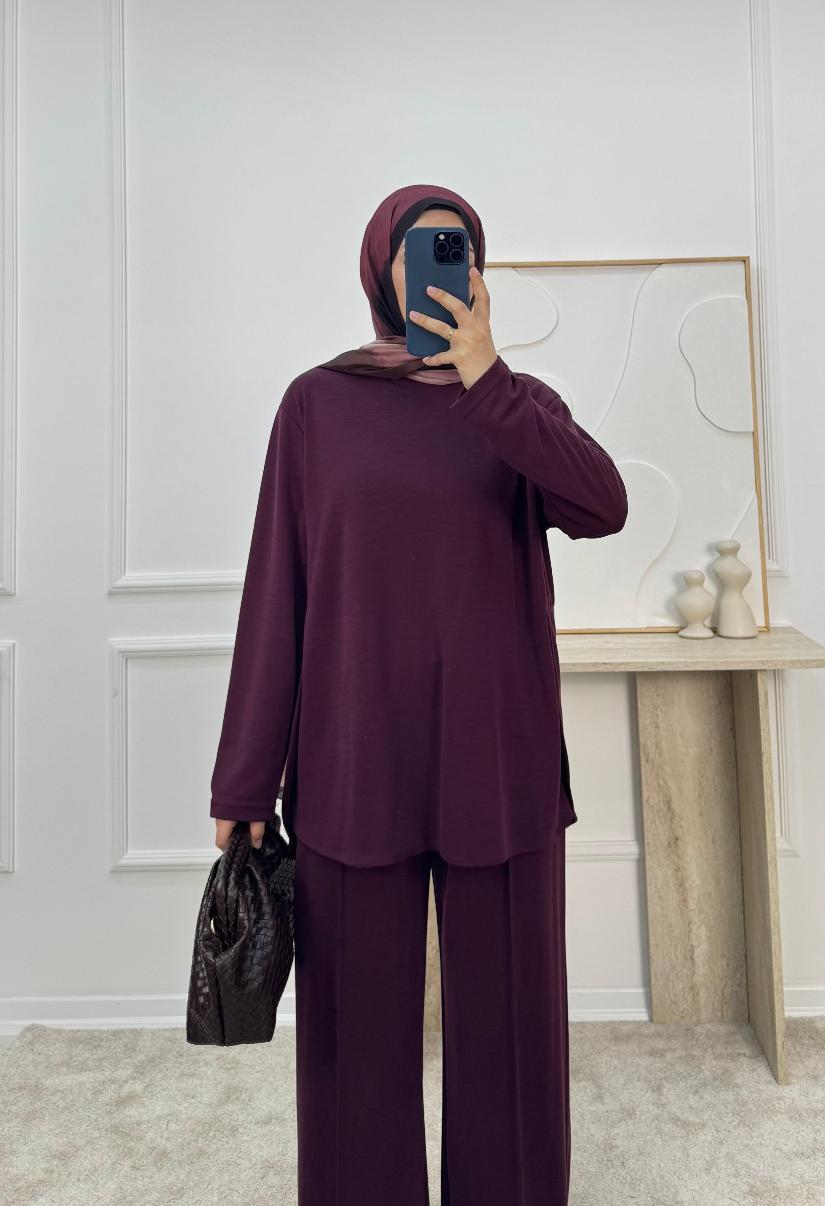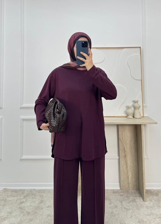 2649-oysho kumaş yanı yırtmaç detaylı pike pantolonlu takım-mor (2649)