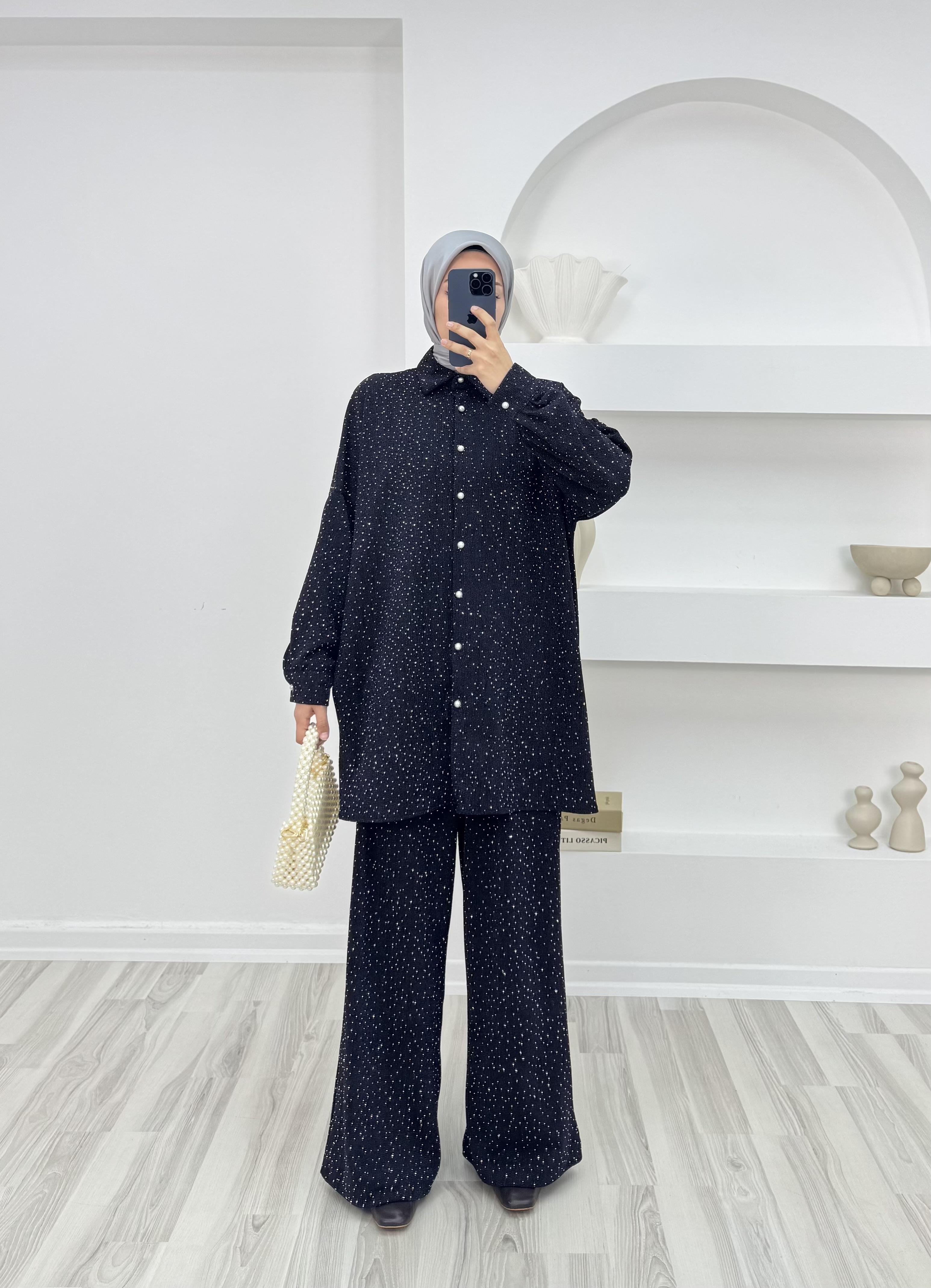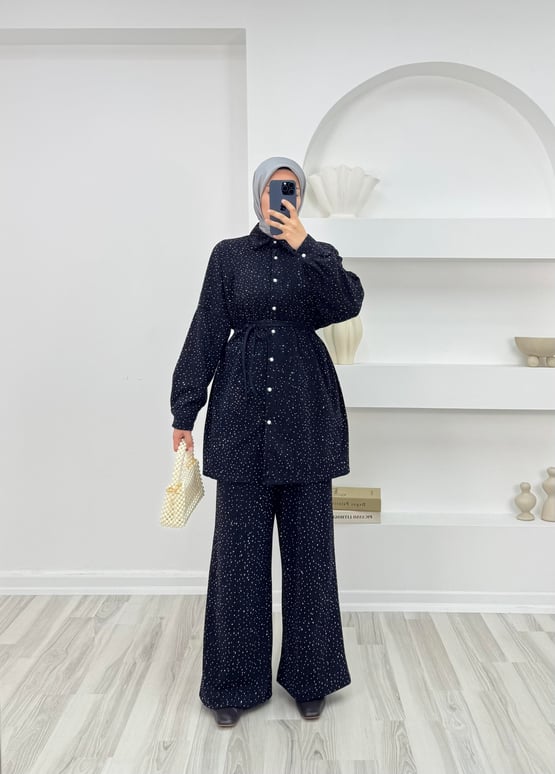 2759-biyeli tunik pantolonlu taşlı örme takım-mavi (2759)