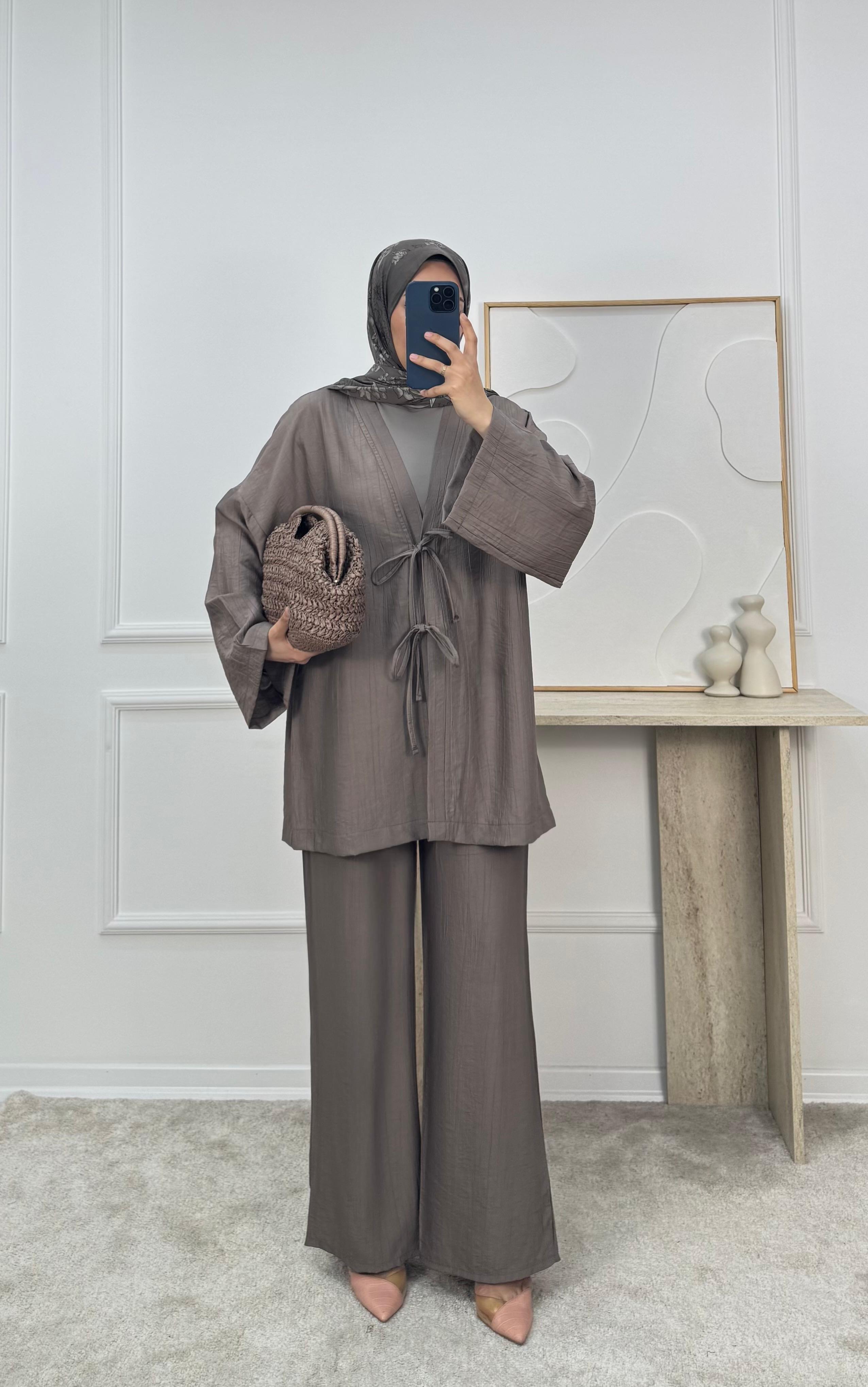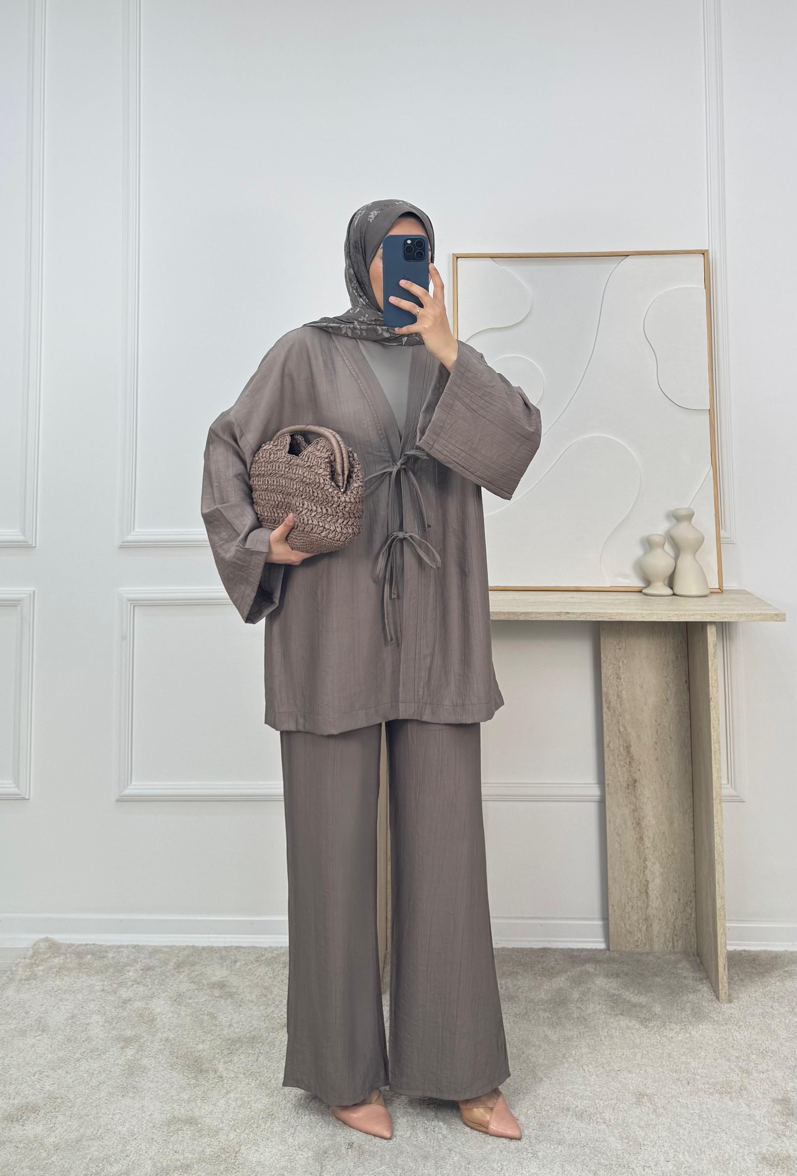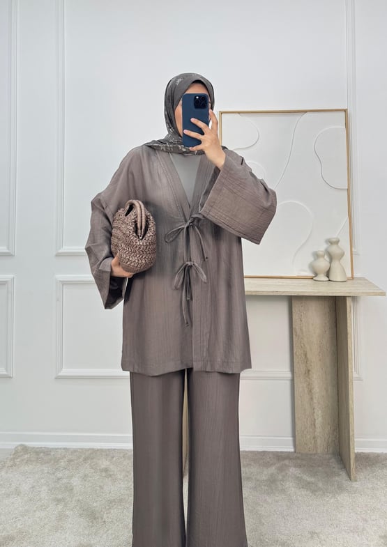 3059-çilek kumaş kimona pantolonlu takım-vizon (3059)