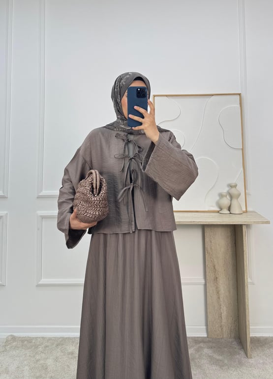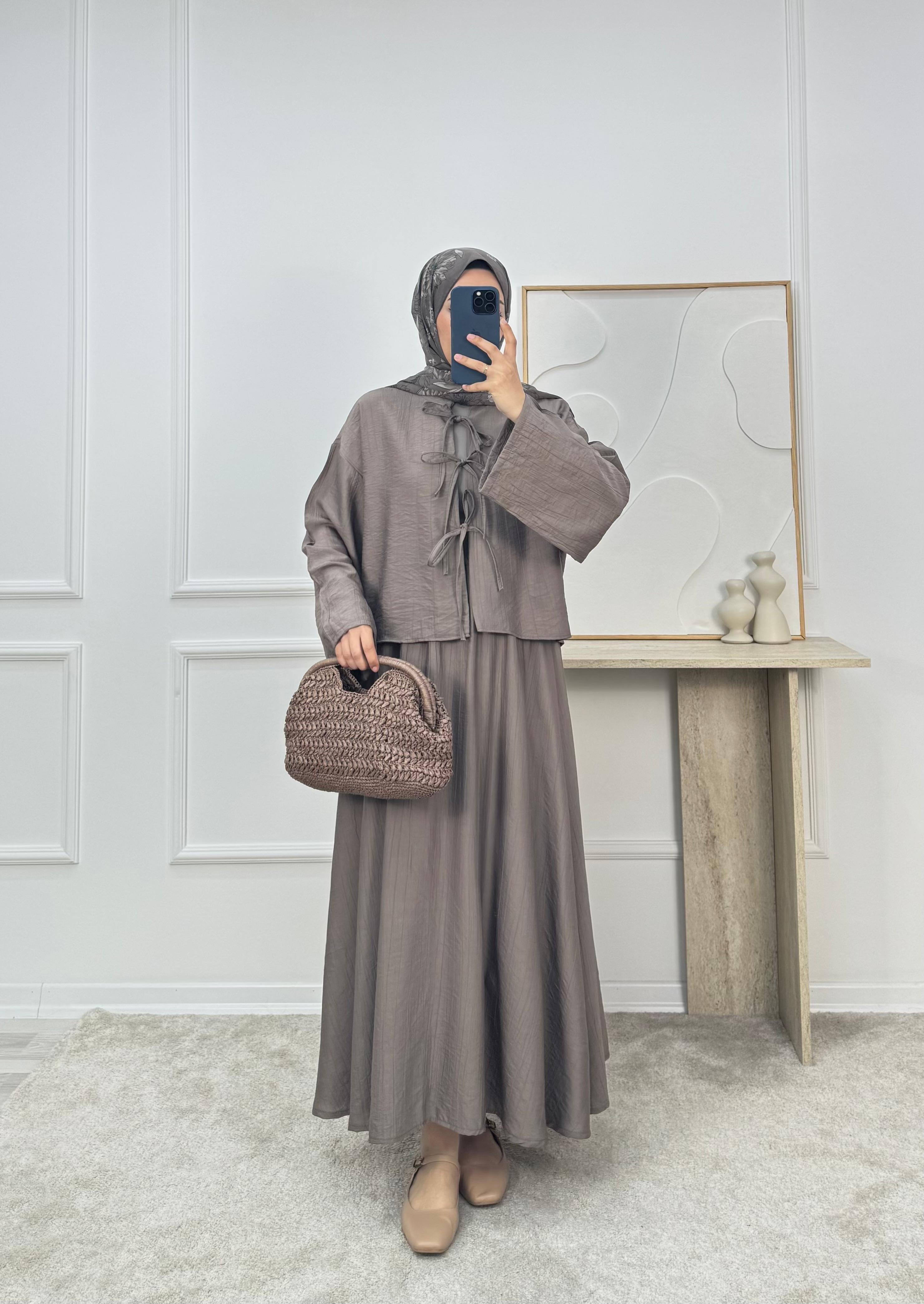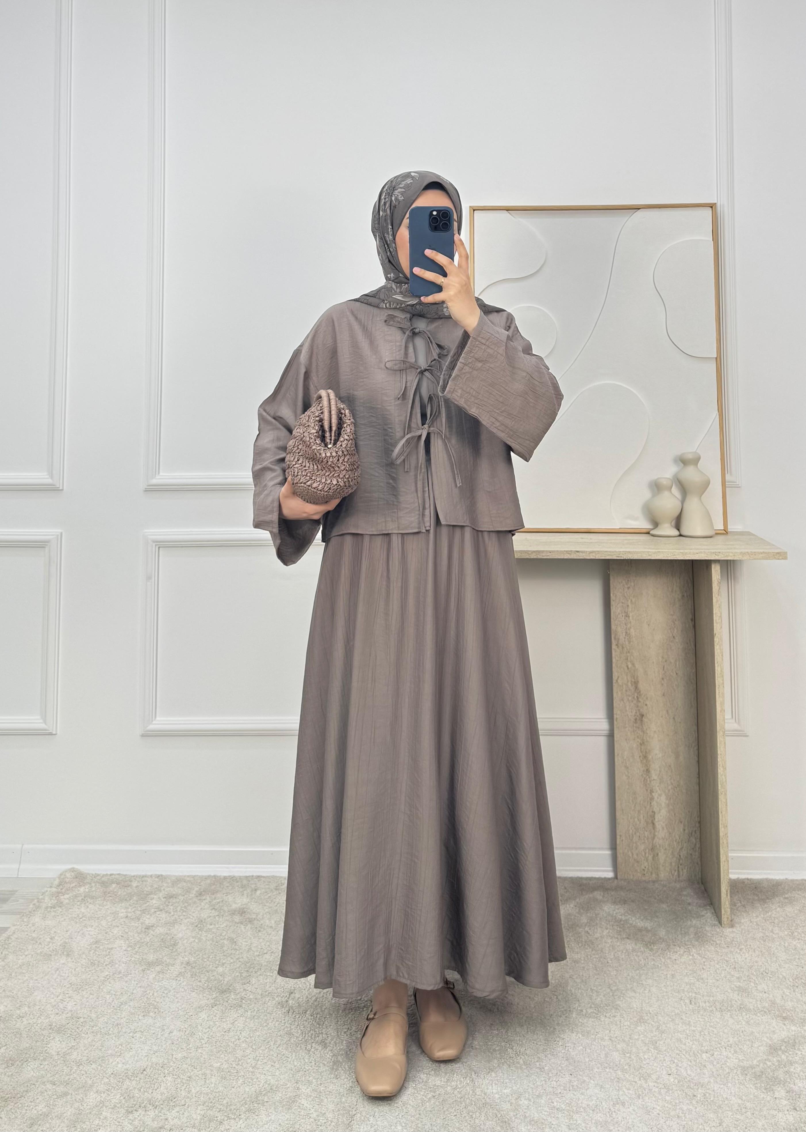 3084-çilek kumaş hakim yaka önü bağcıklı etekli takım VİZON (3084)