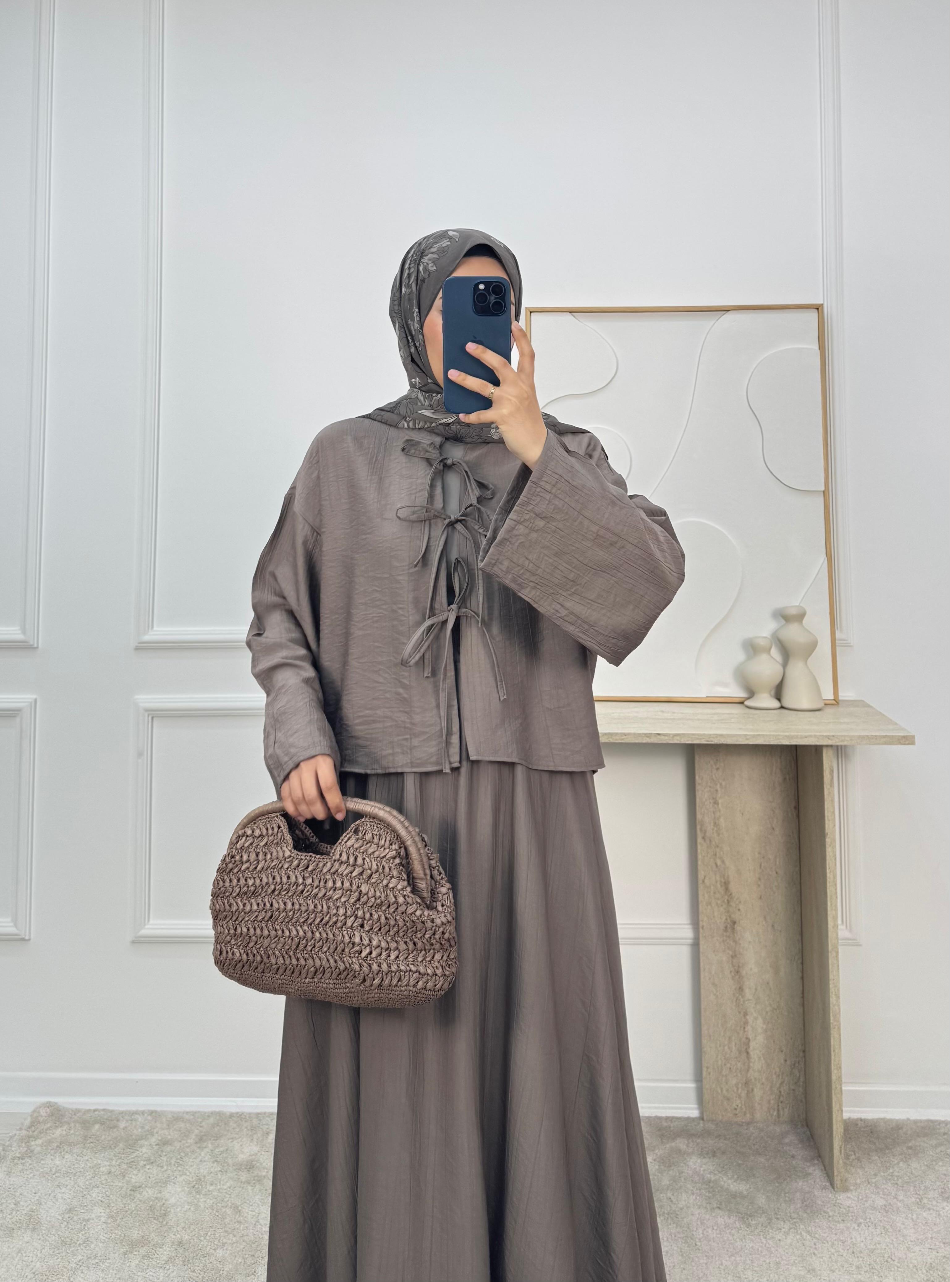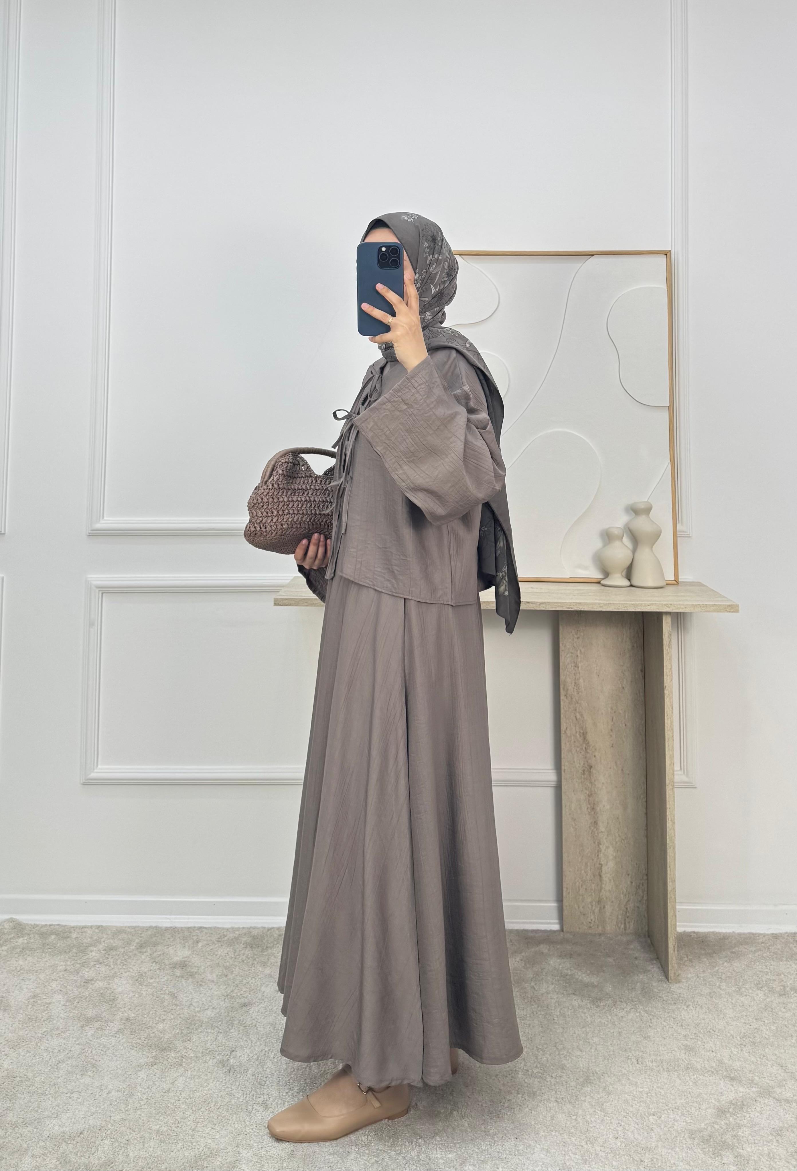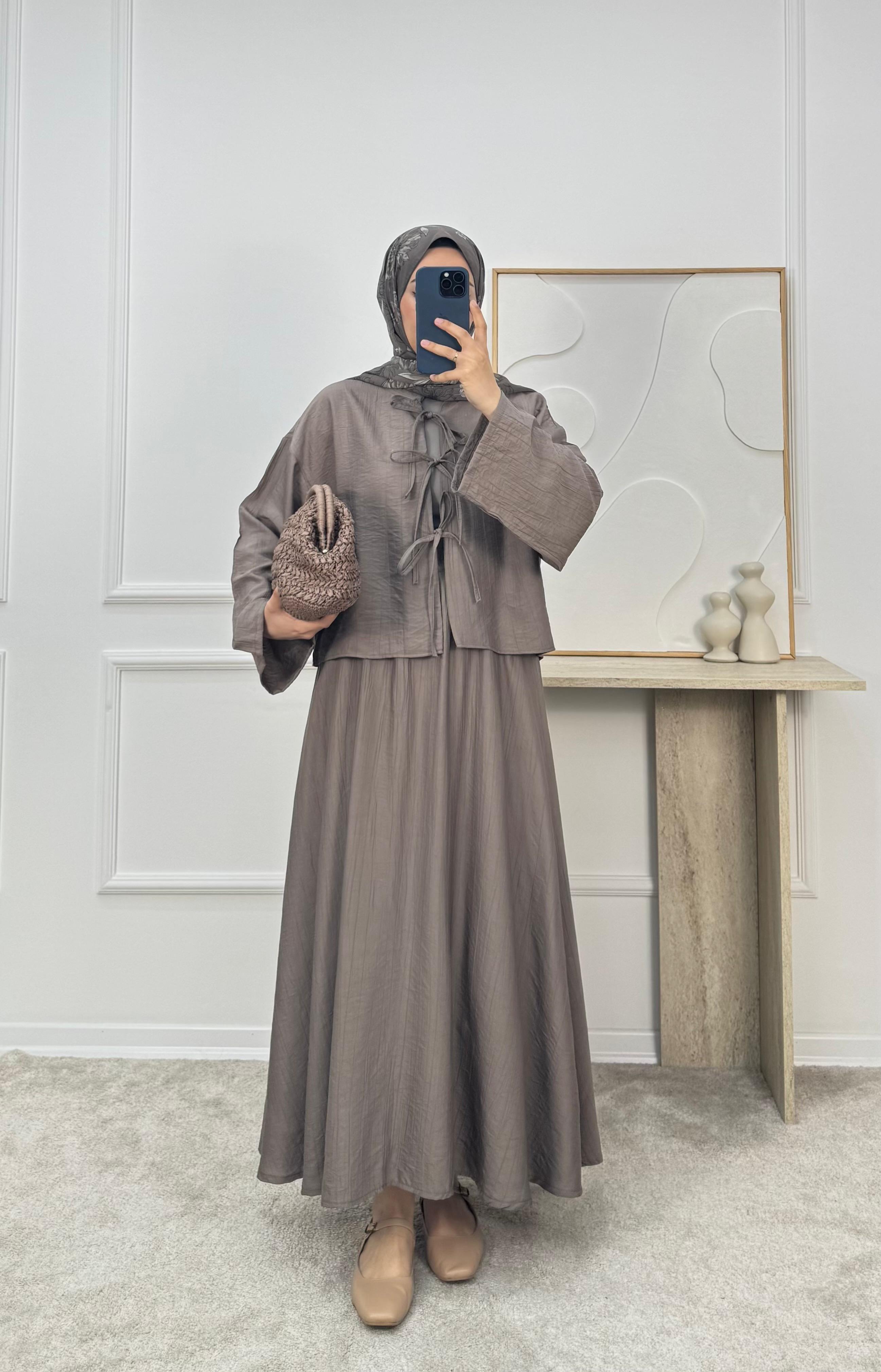 3084-çilek kumaş hakim yaka önü bağcıklı etekli takım VİZON (3084)