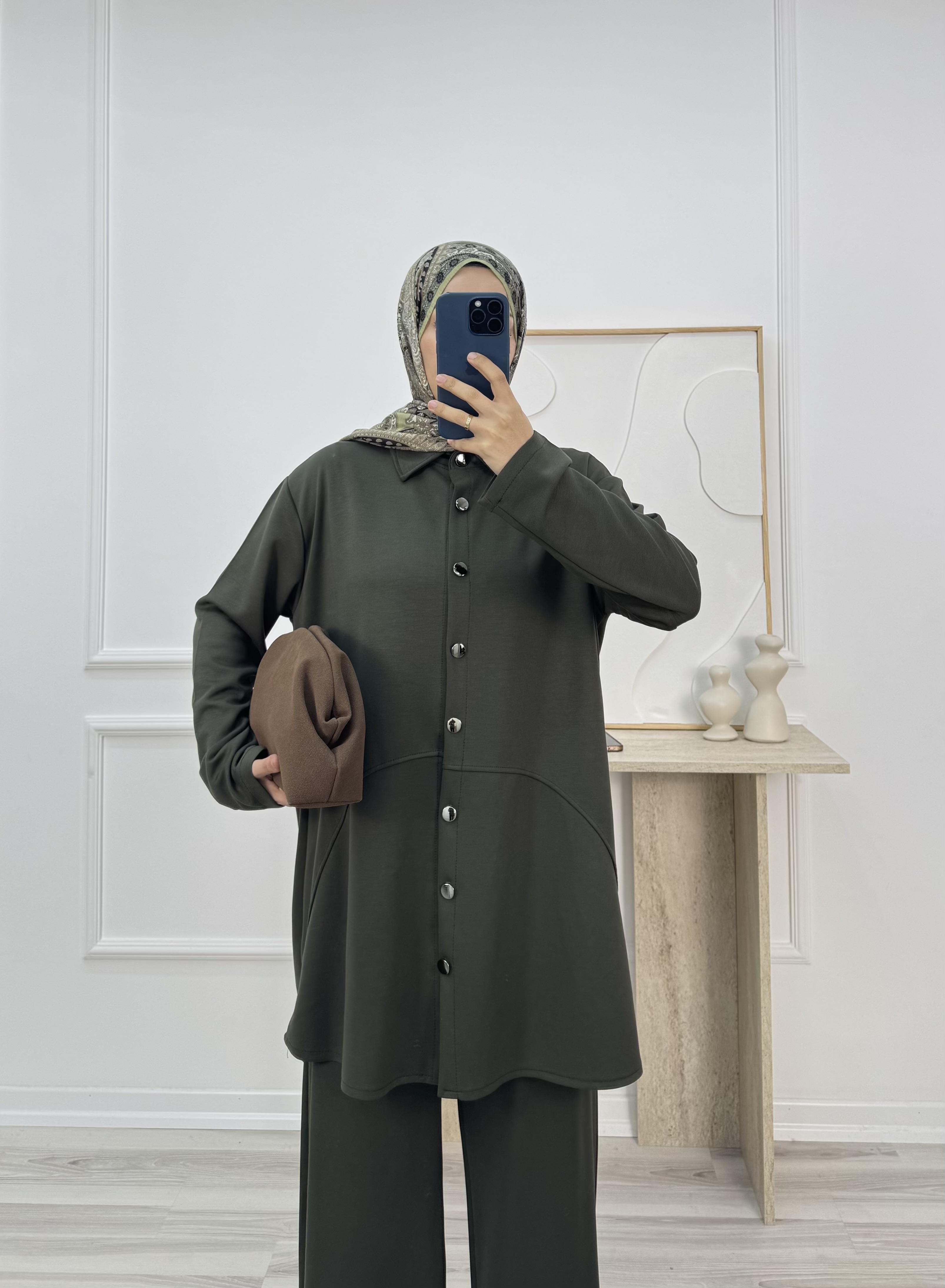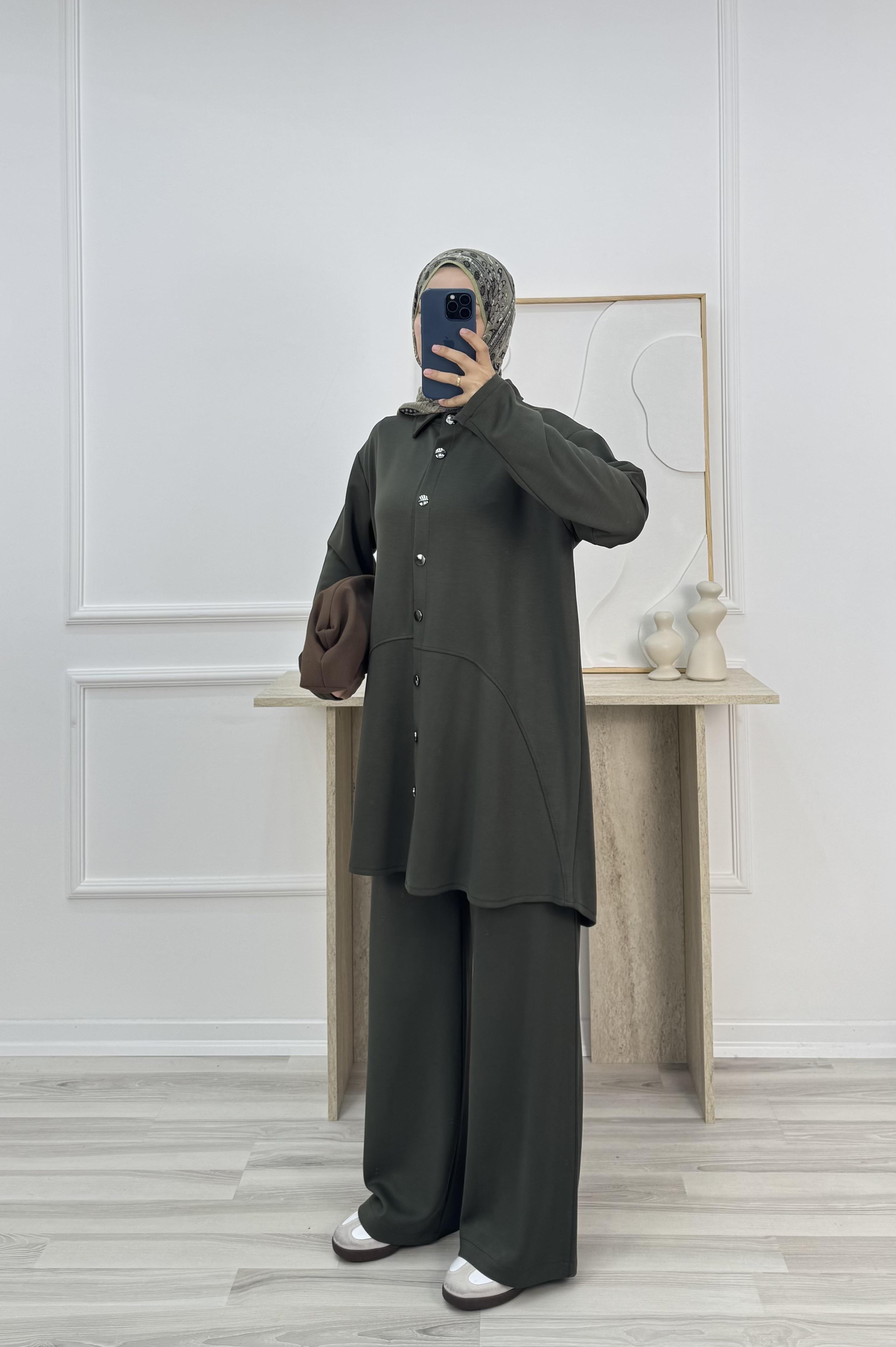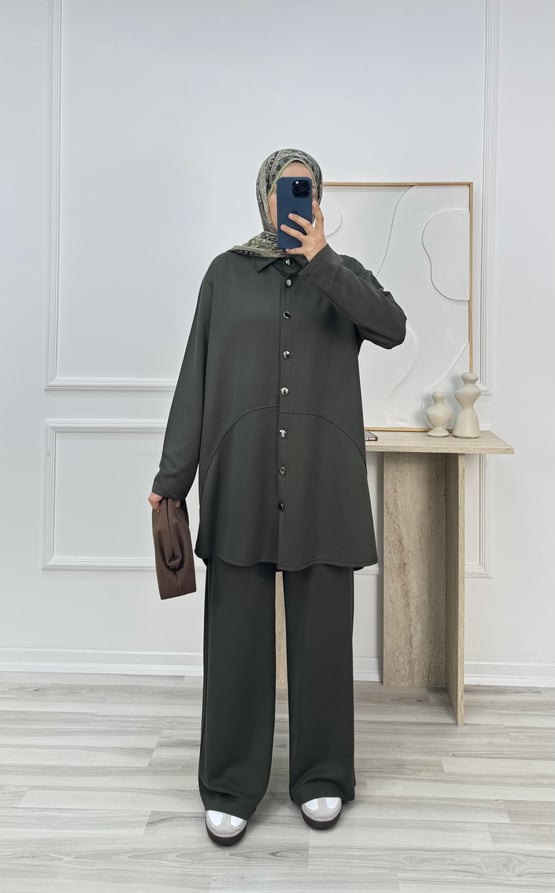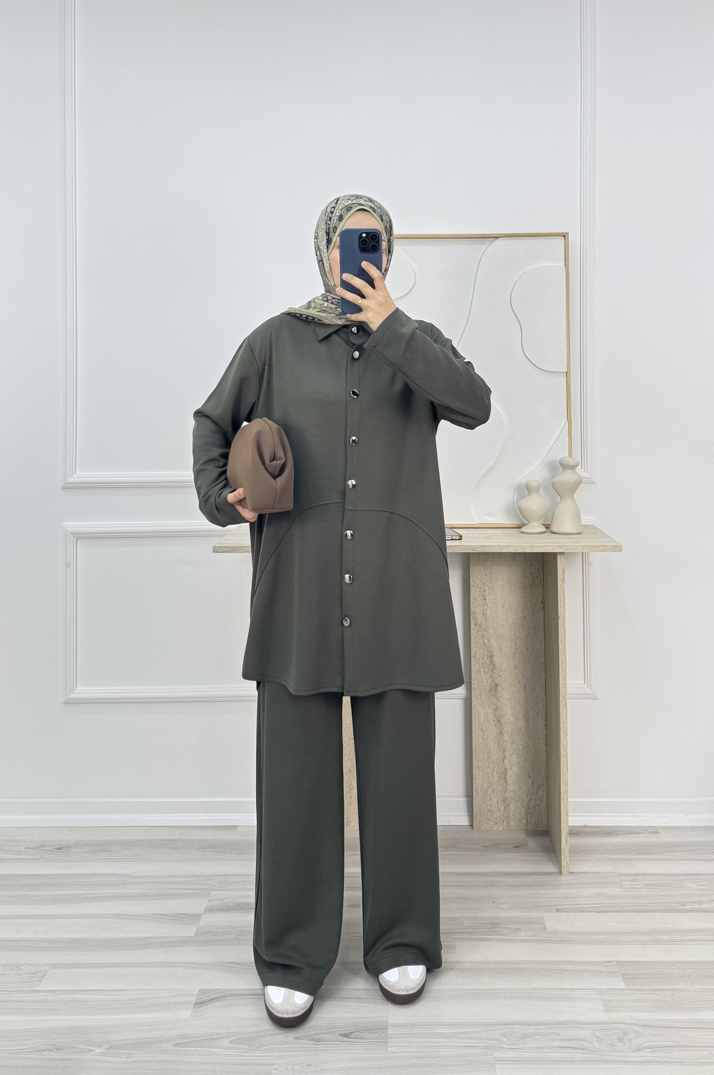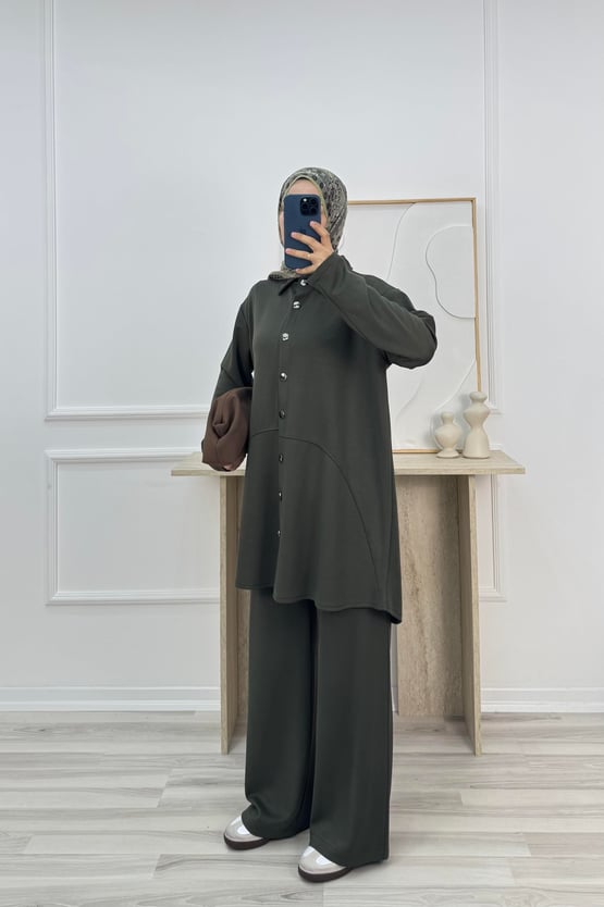 3146-oysho kumaş düğmeli pantolonlu takım-yeşil (3146)