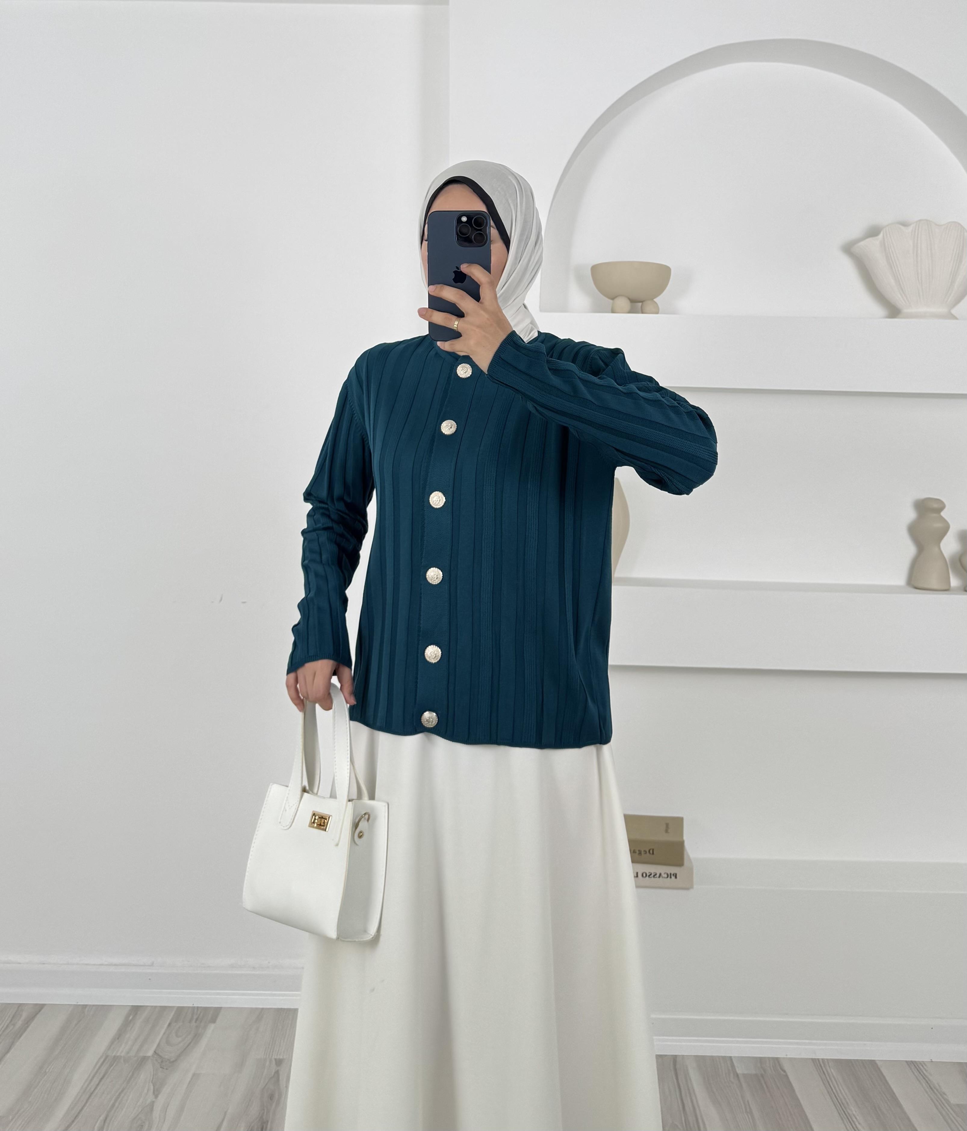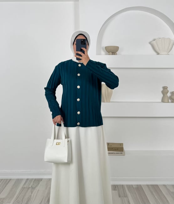 3204 kendinden çizgili etek üstü triko hırka-petrol yeşili (3204)