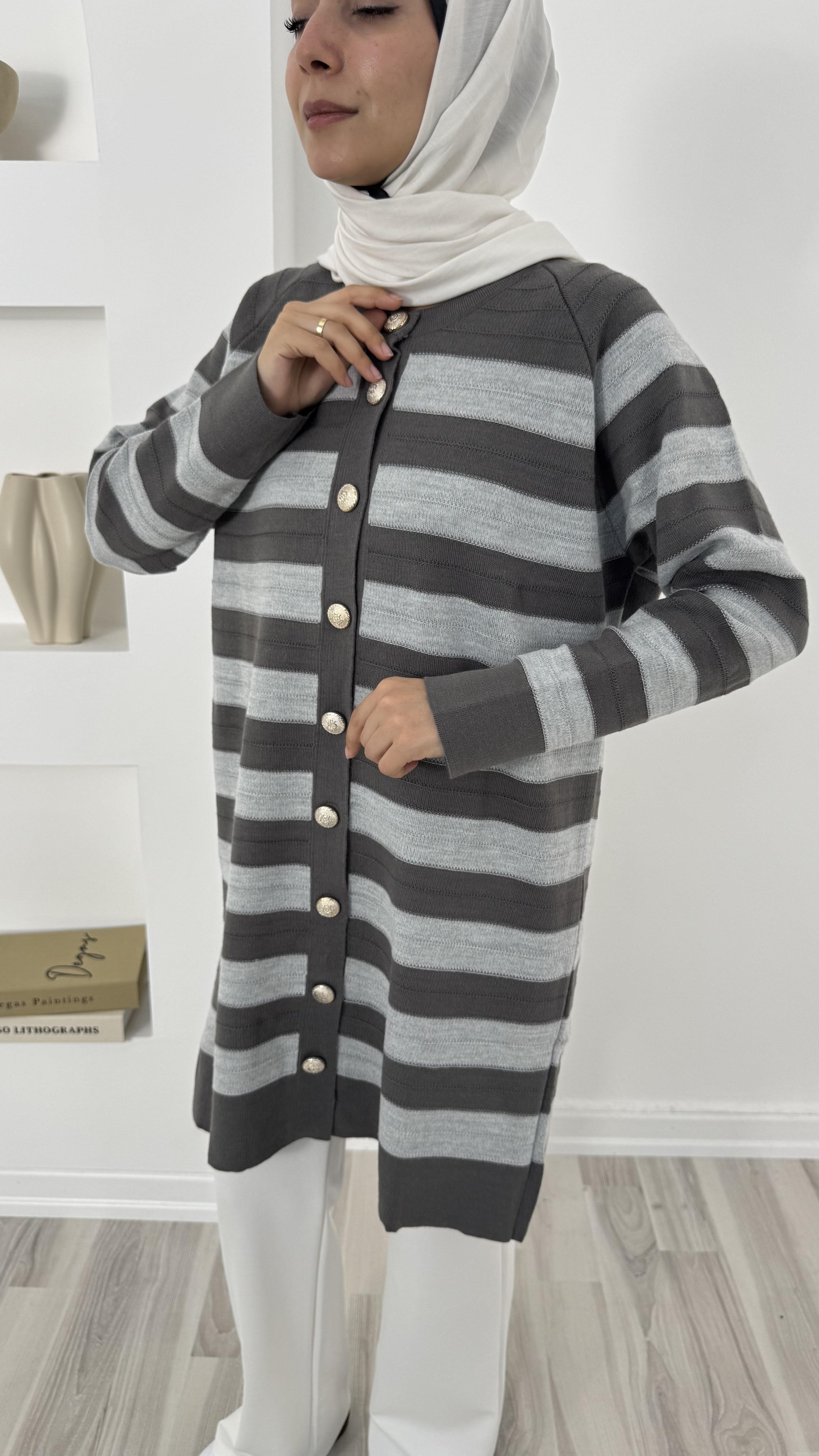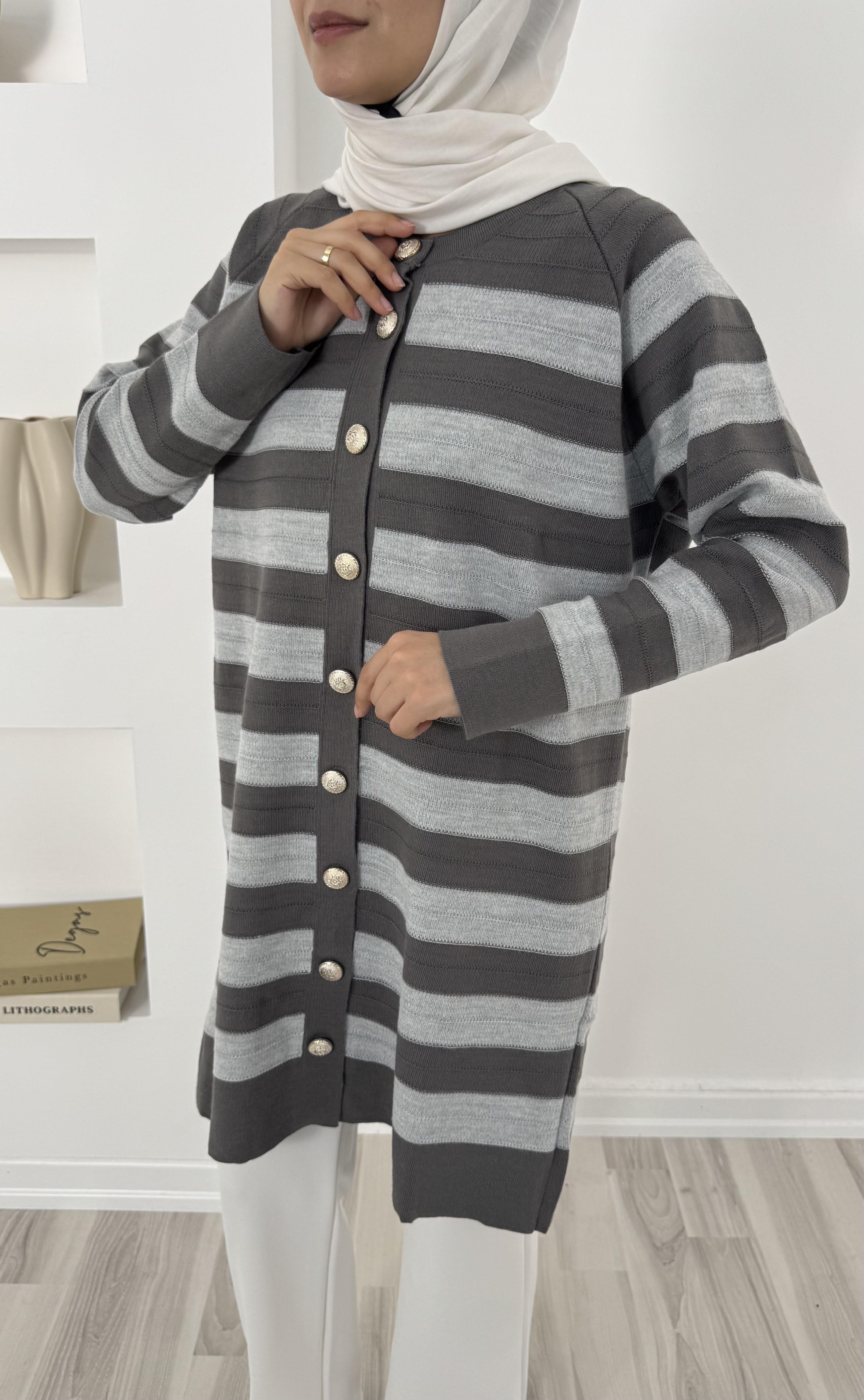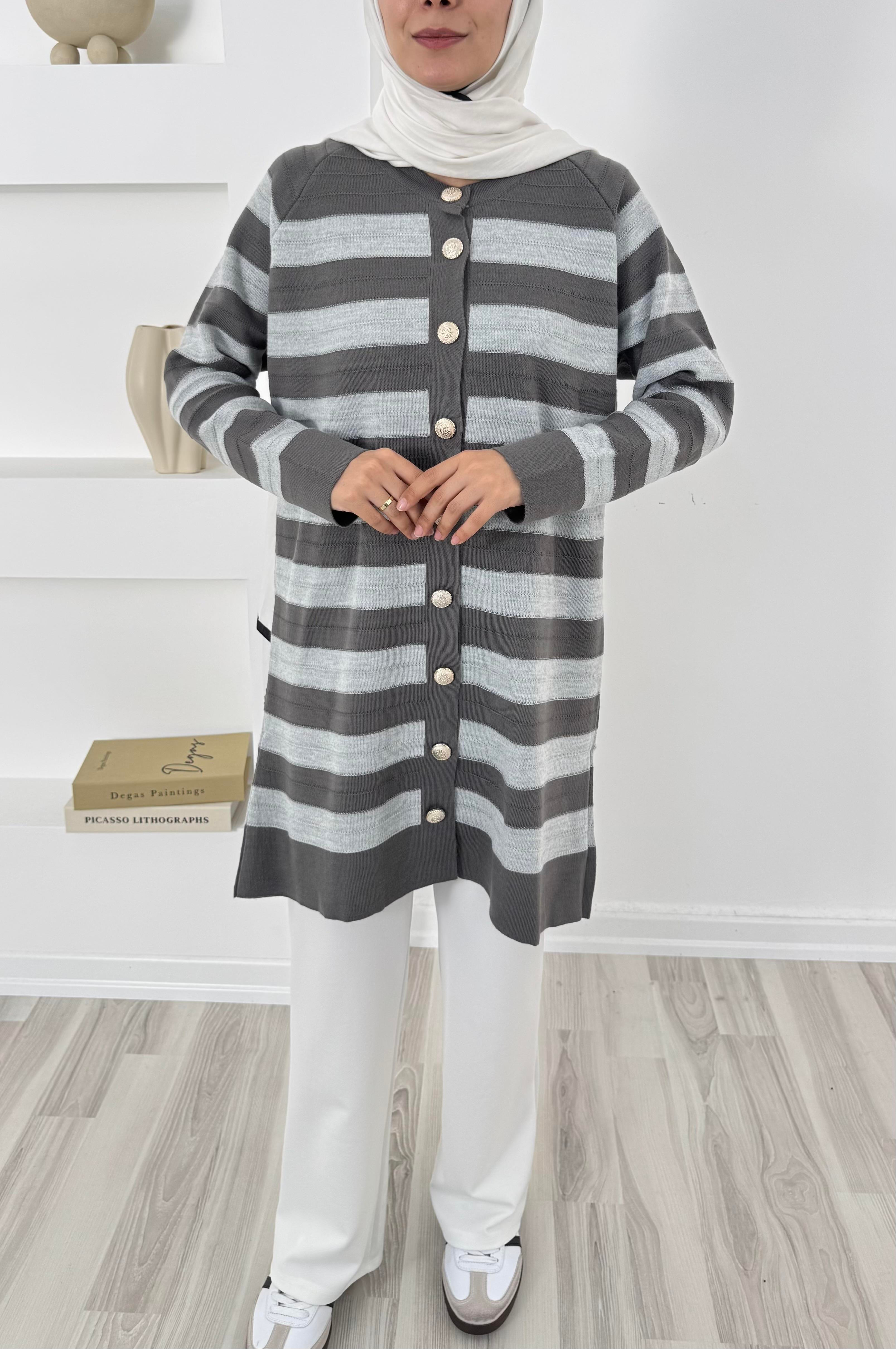 3210 çizgili triko düğmeli triko hırka füme (3210)