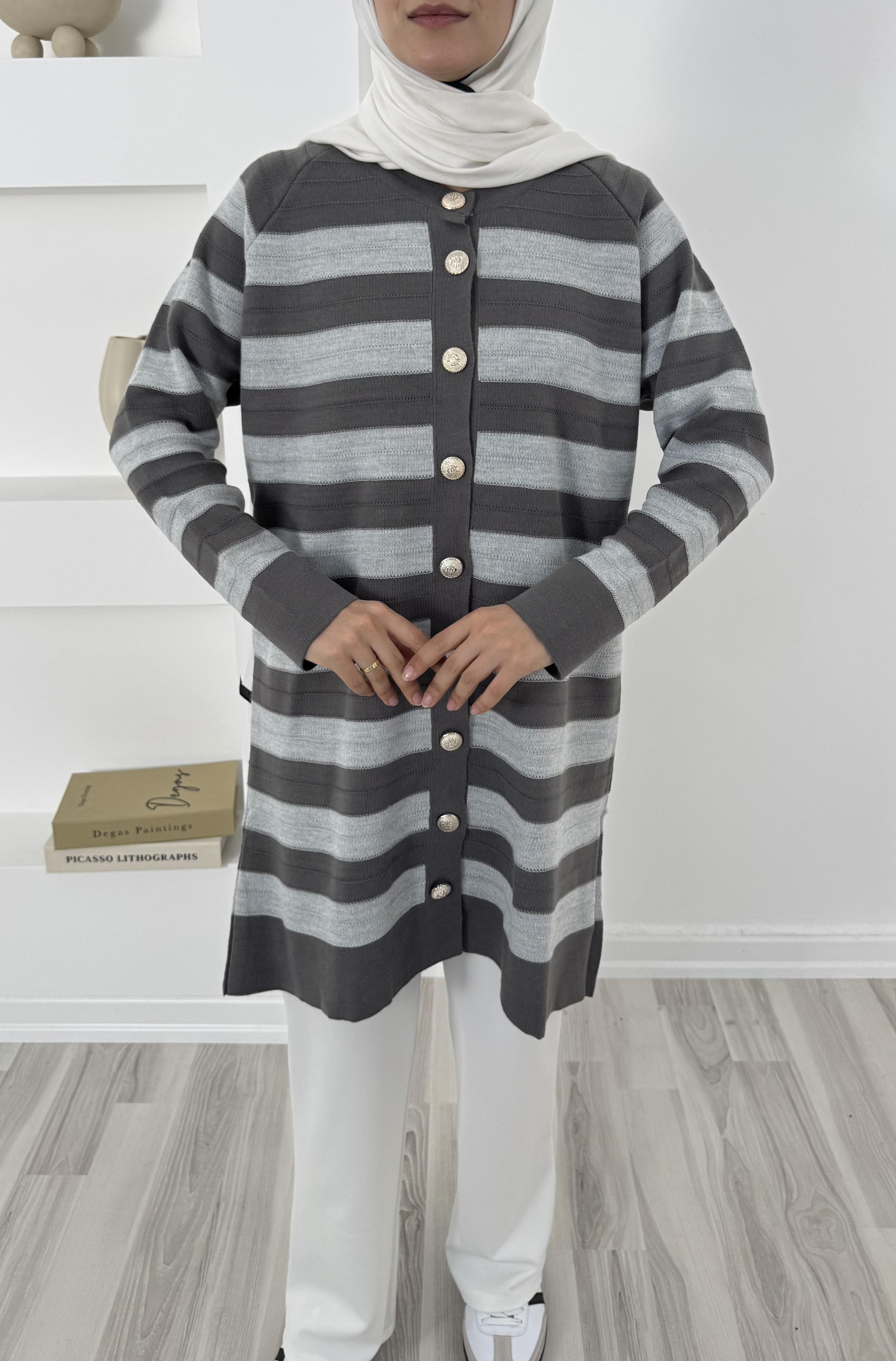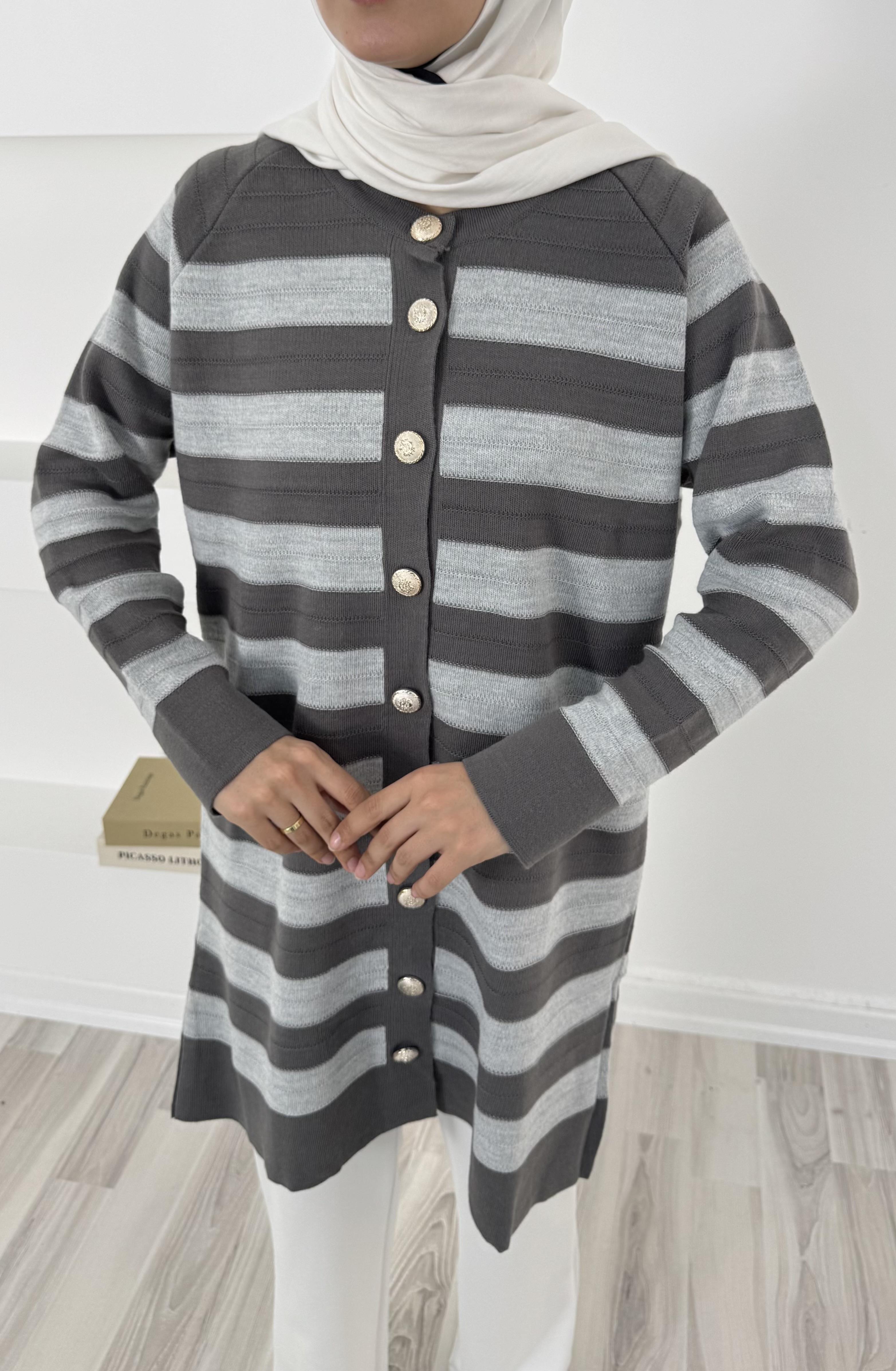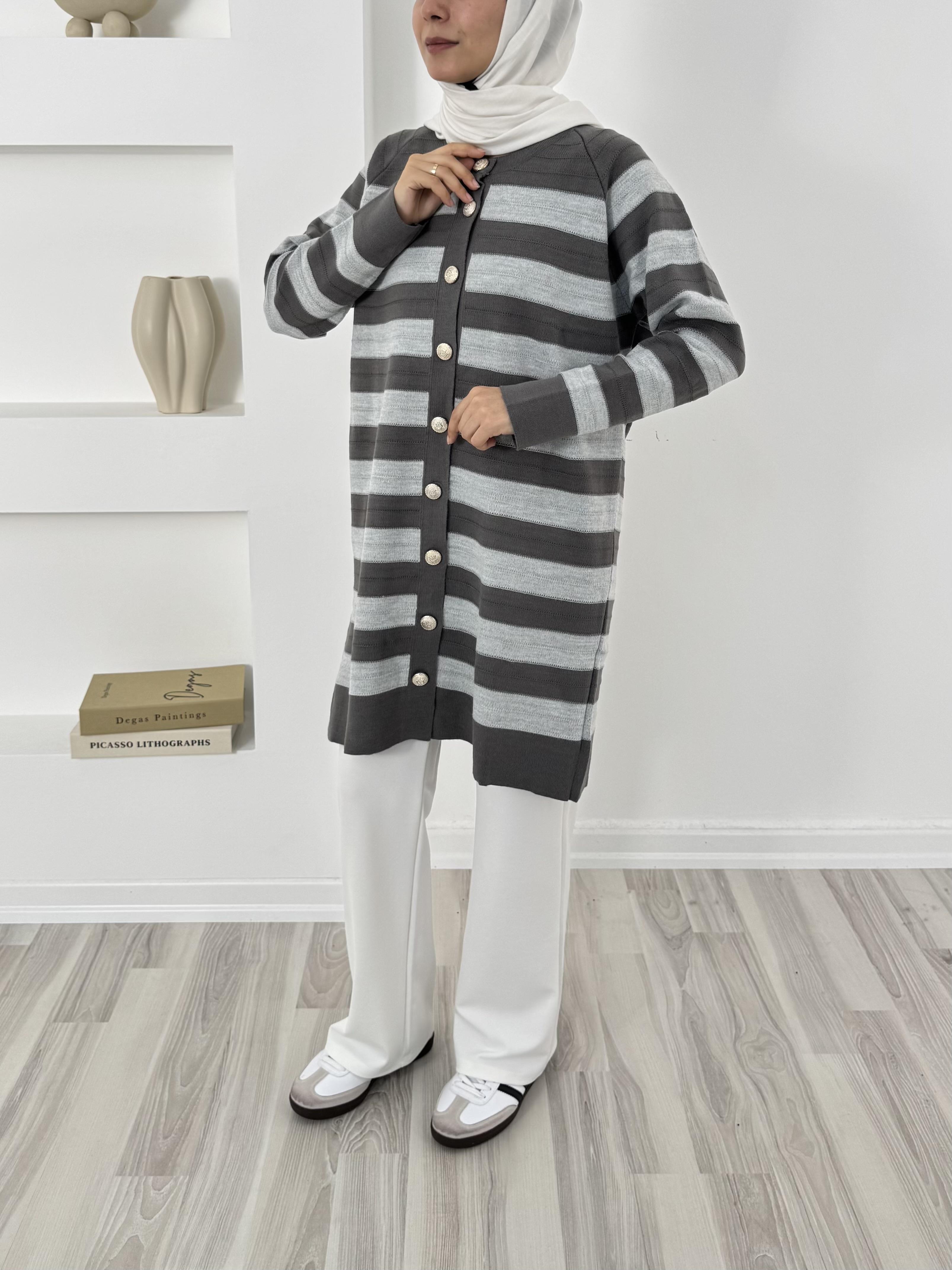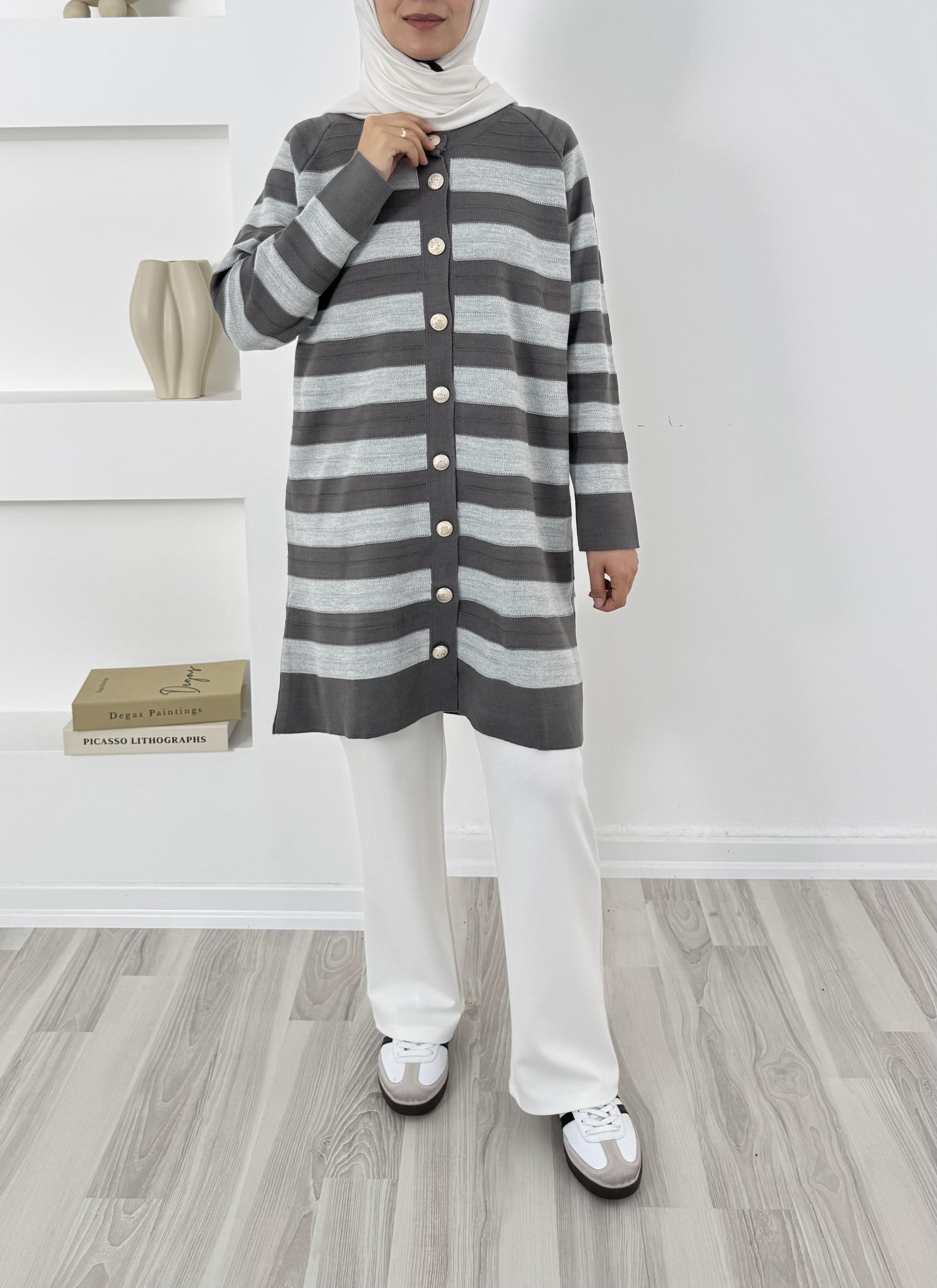3210 çizgili triko düğmeli triko hırka füme (3210)