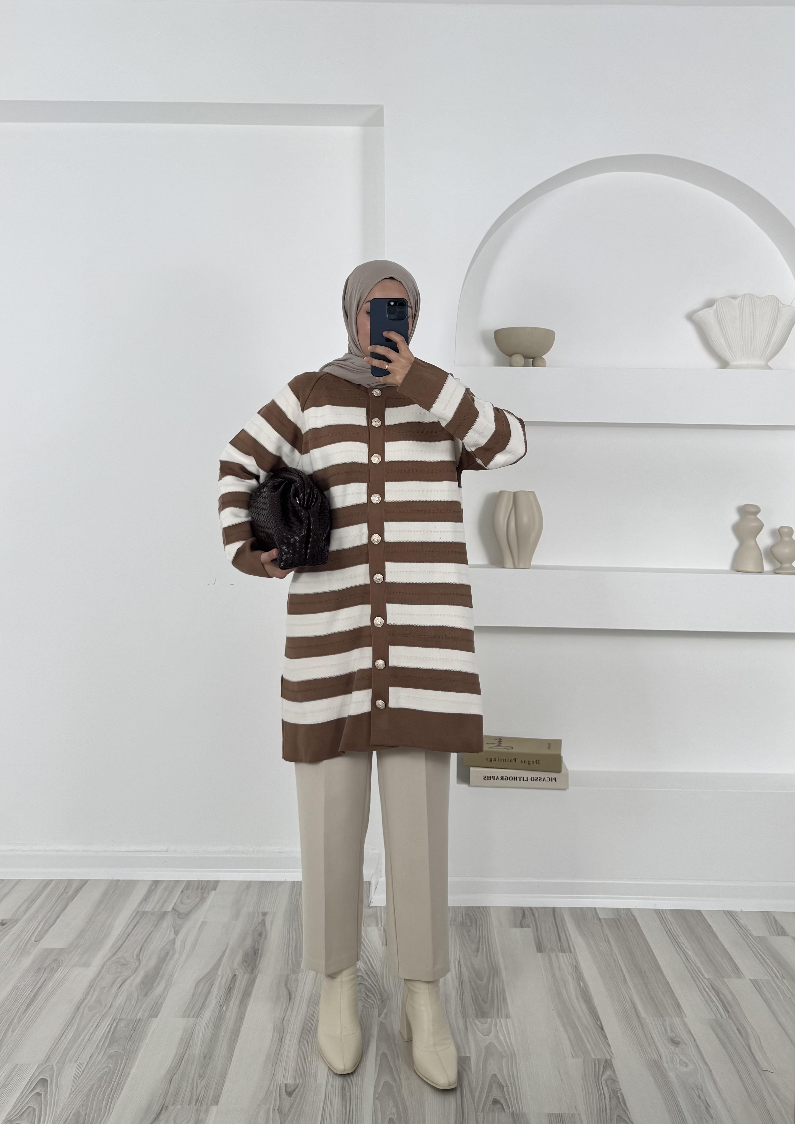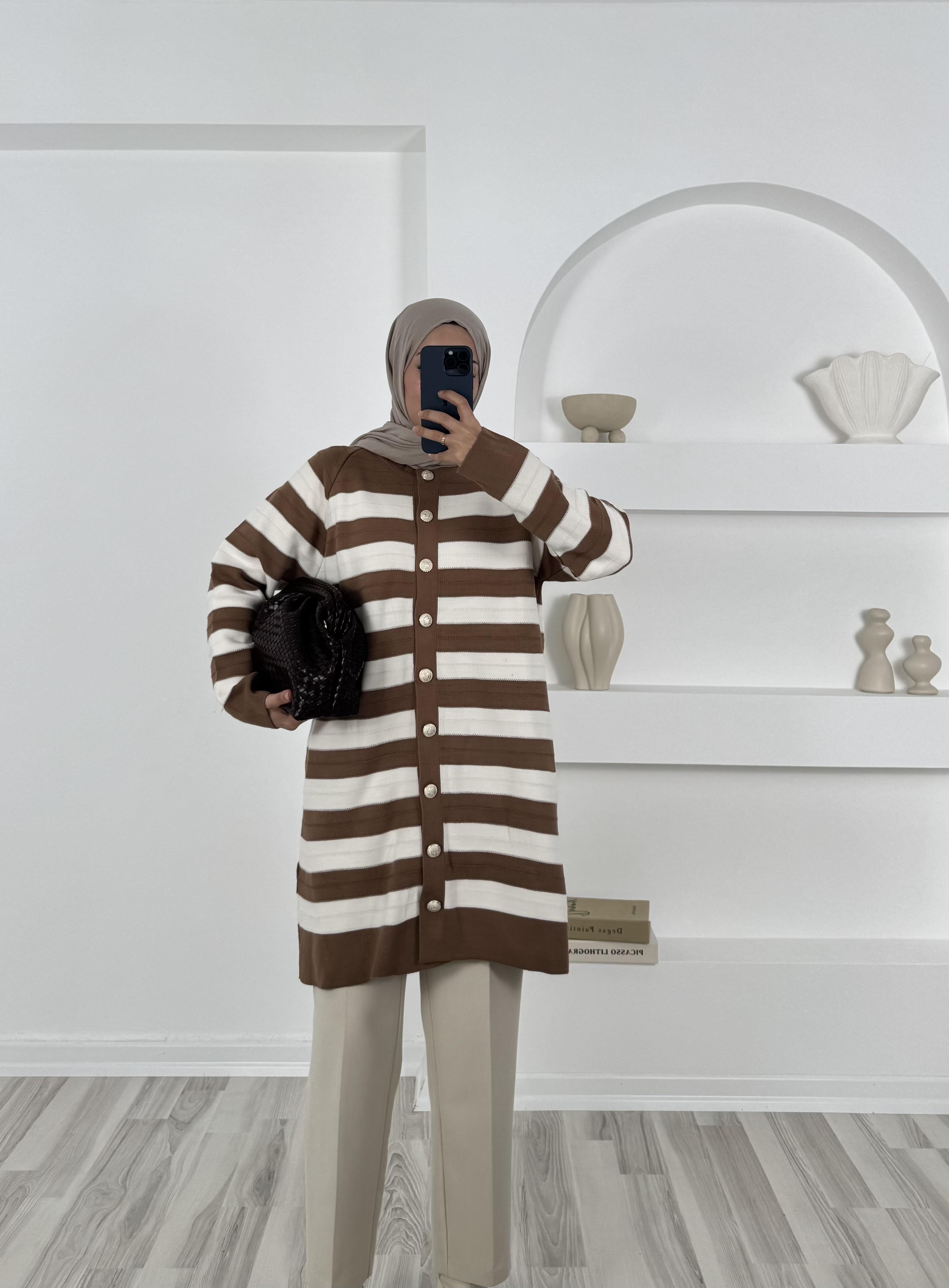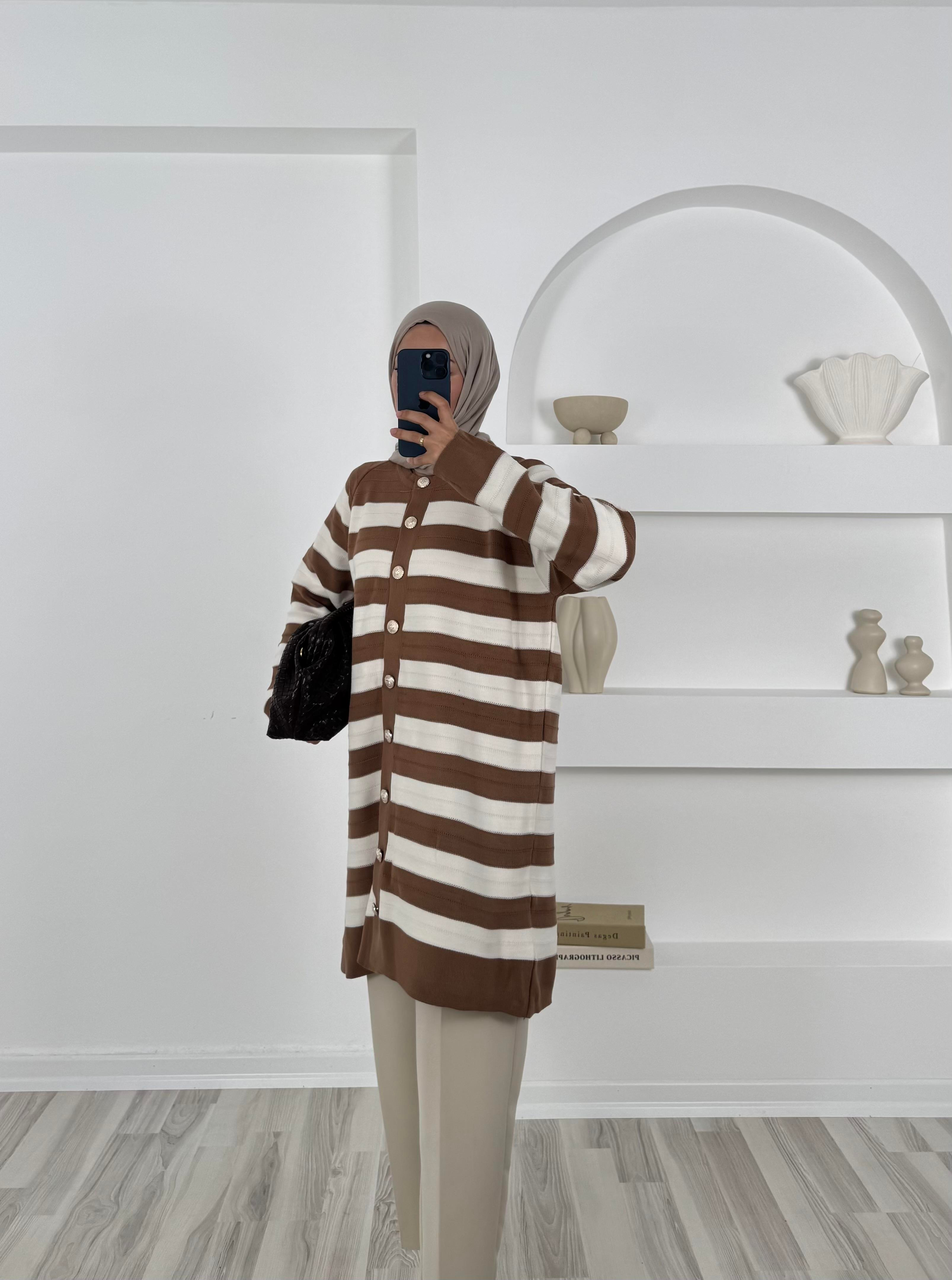 3210 çizgili triko düğmeli triko hırka sütlü-kahve (3210)