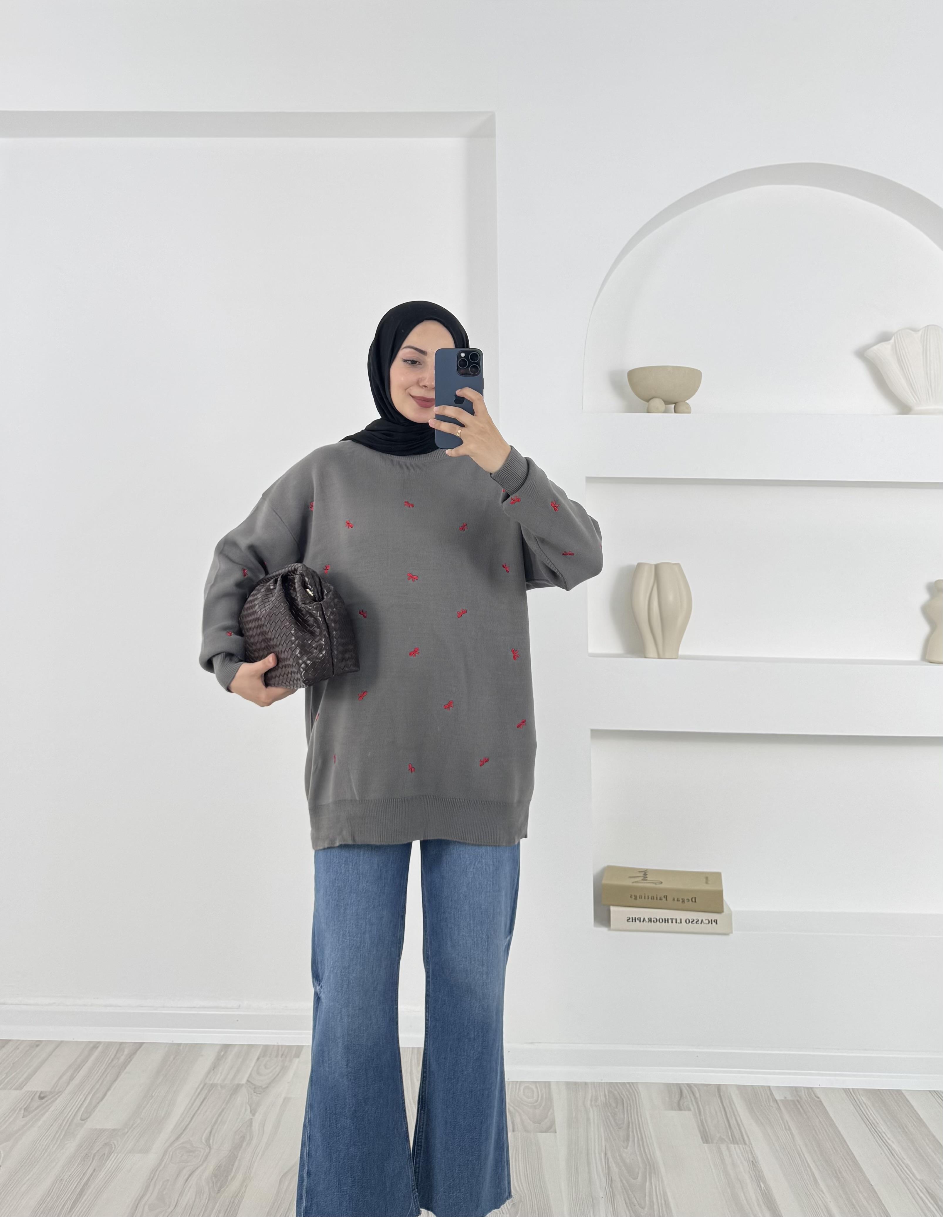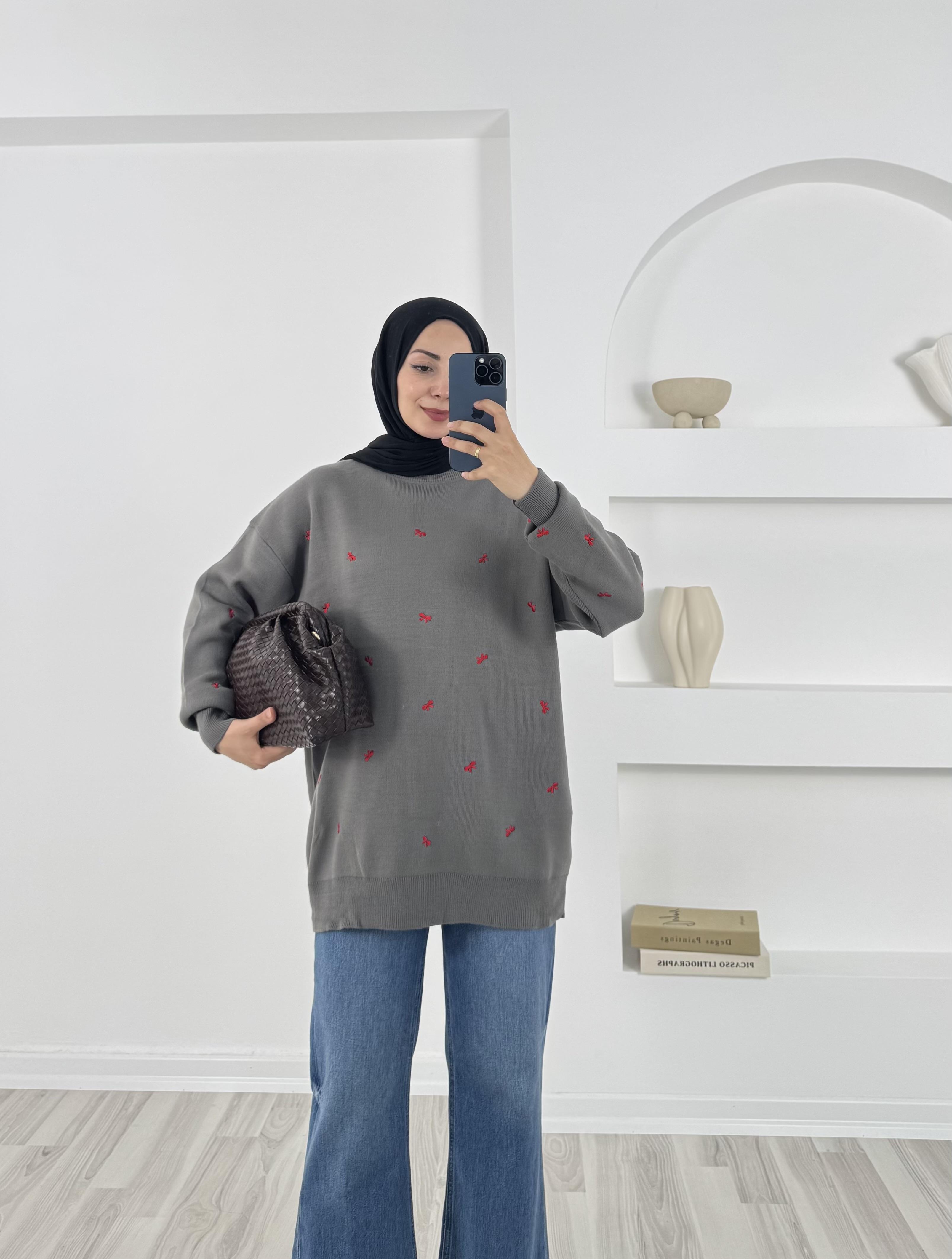 3251 küçük fiyonk nakışlı kazak füme (3251)