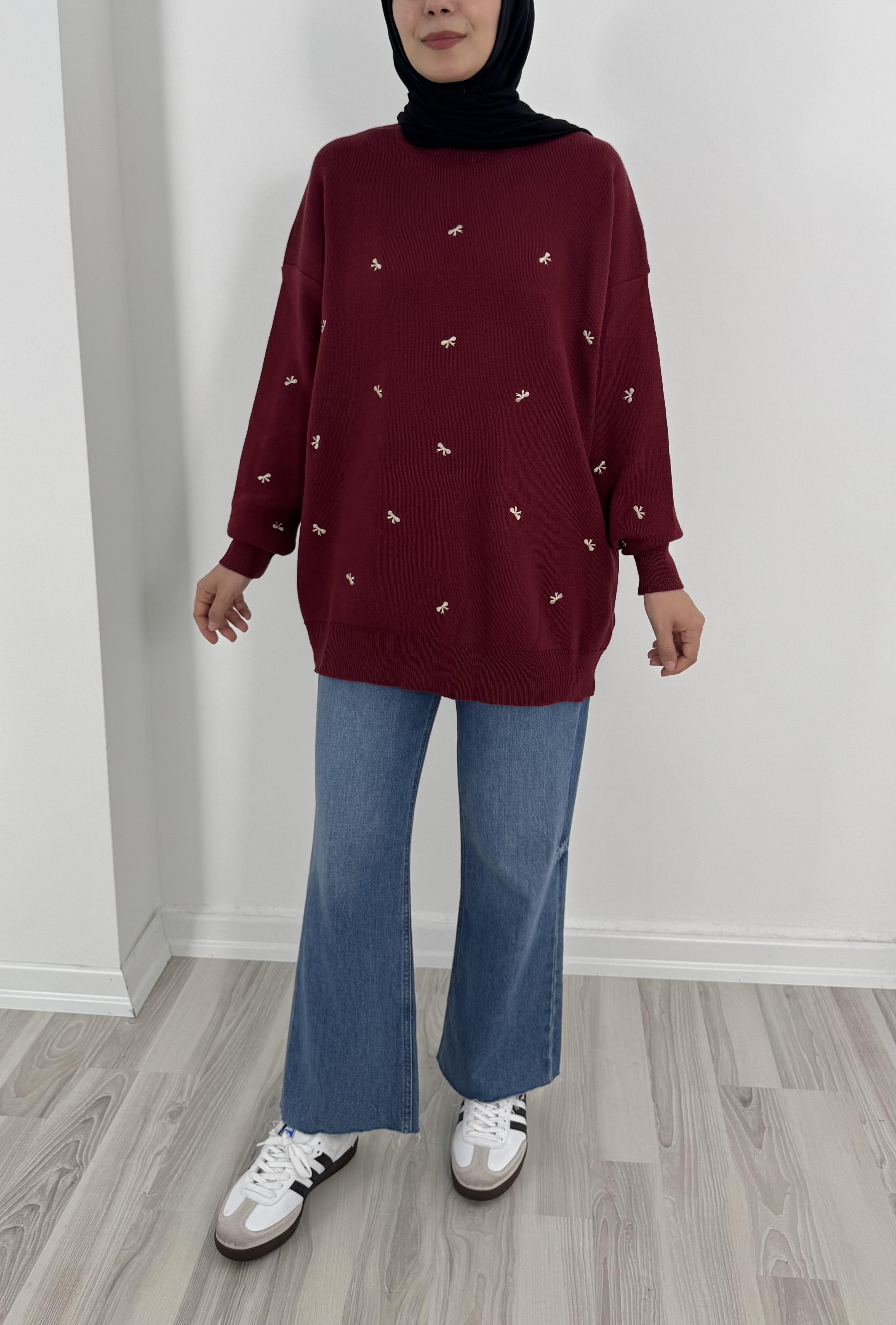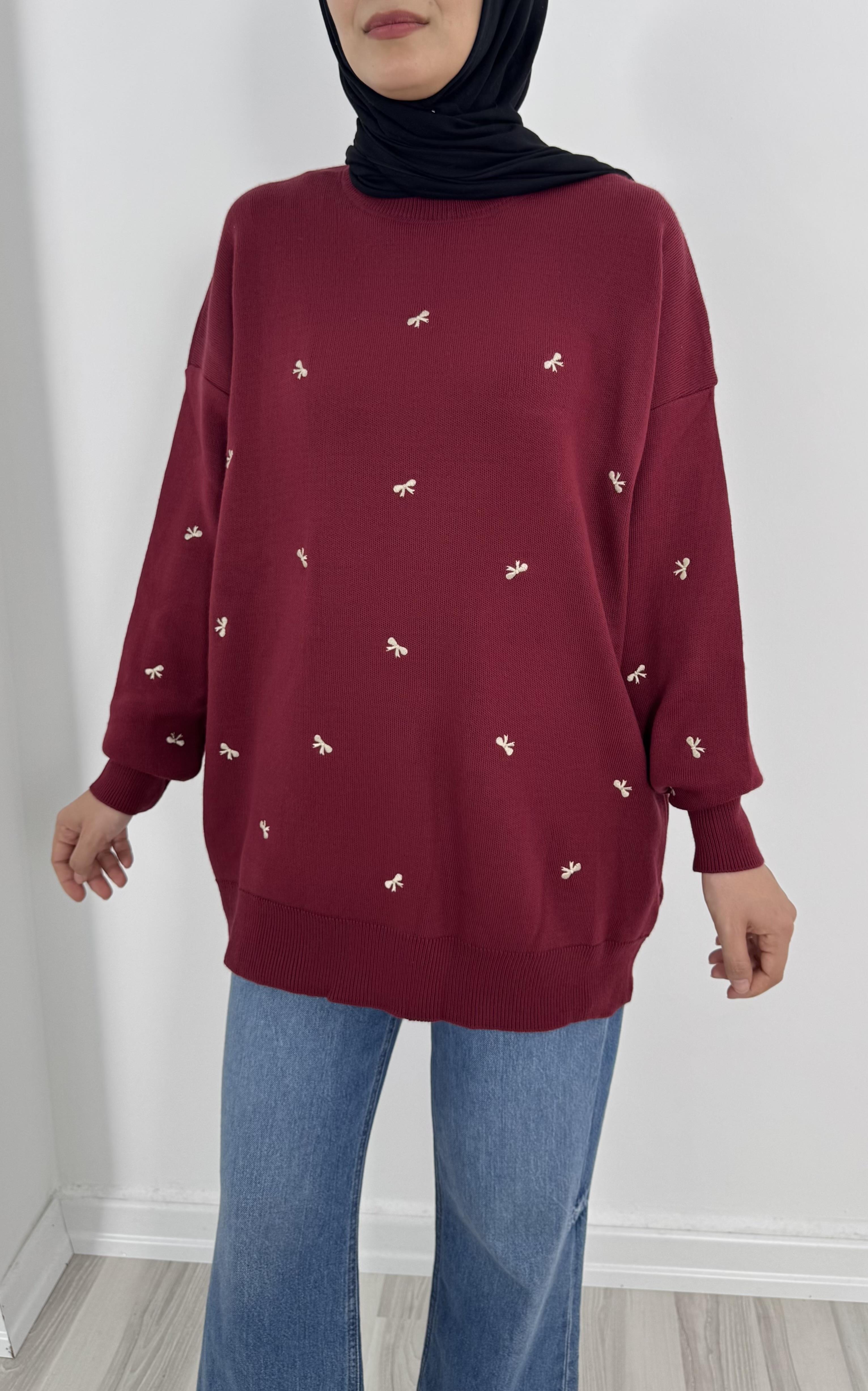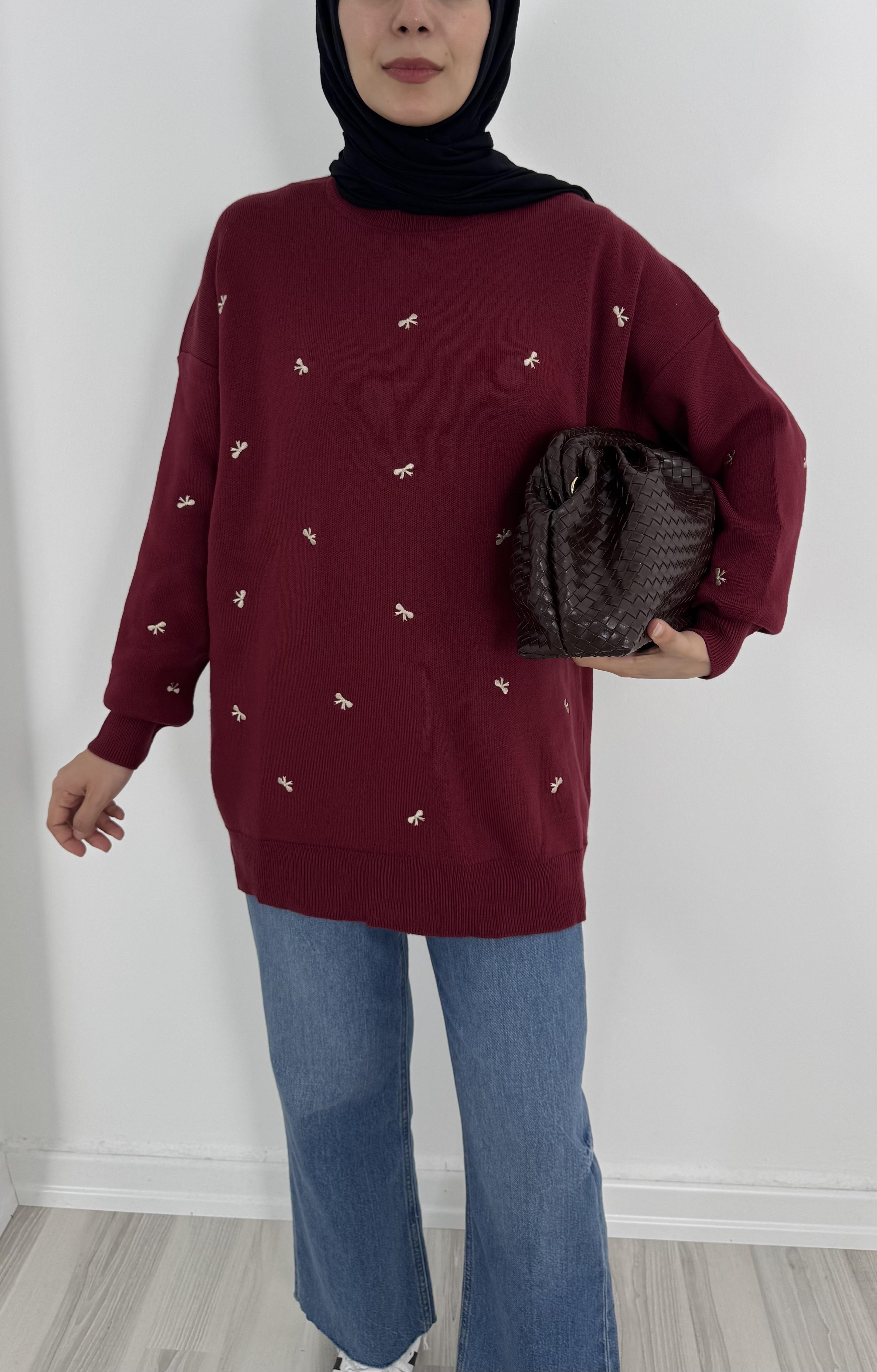 3251 küçük fiyonk nakışlı kazak bordo (3251)