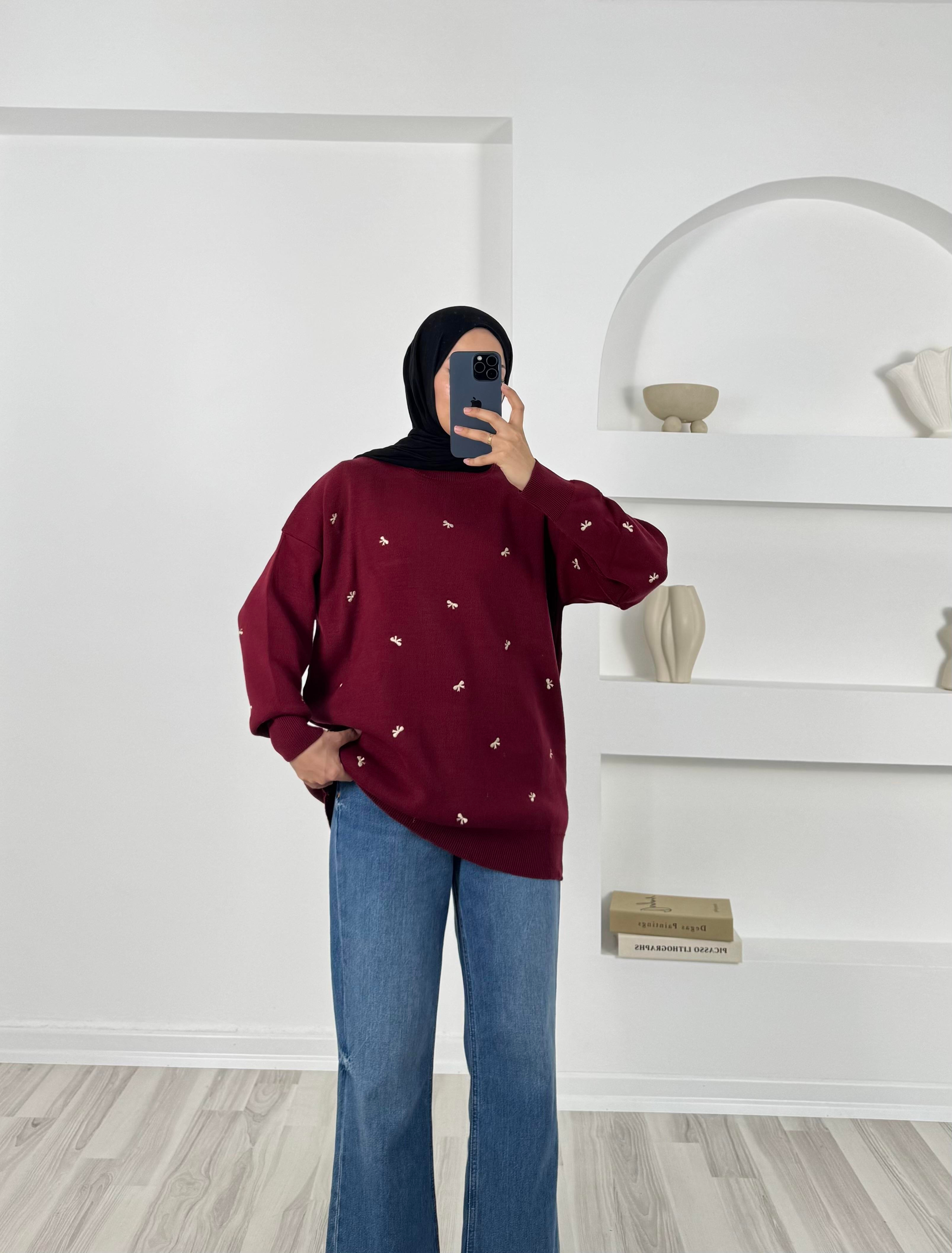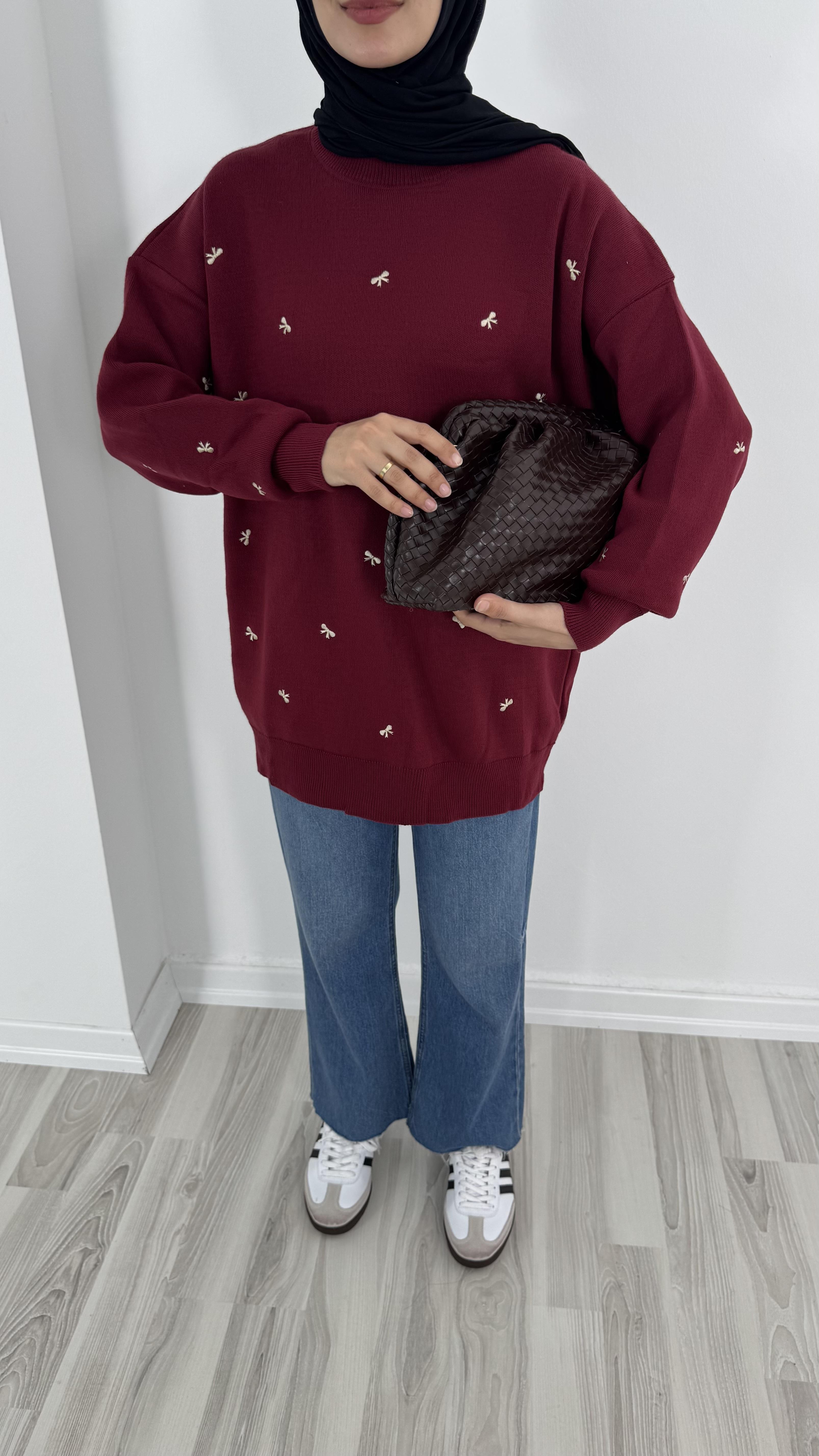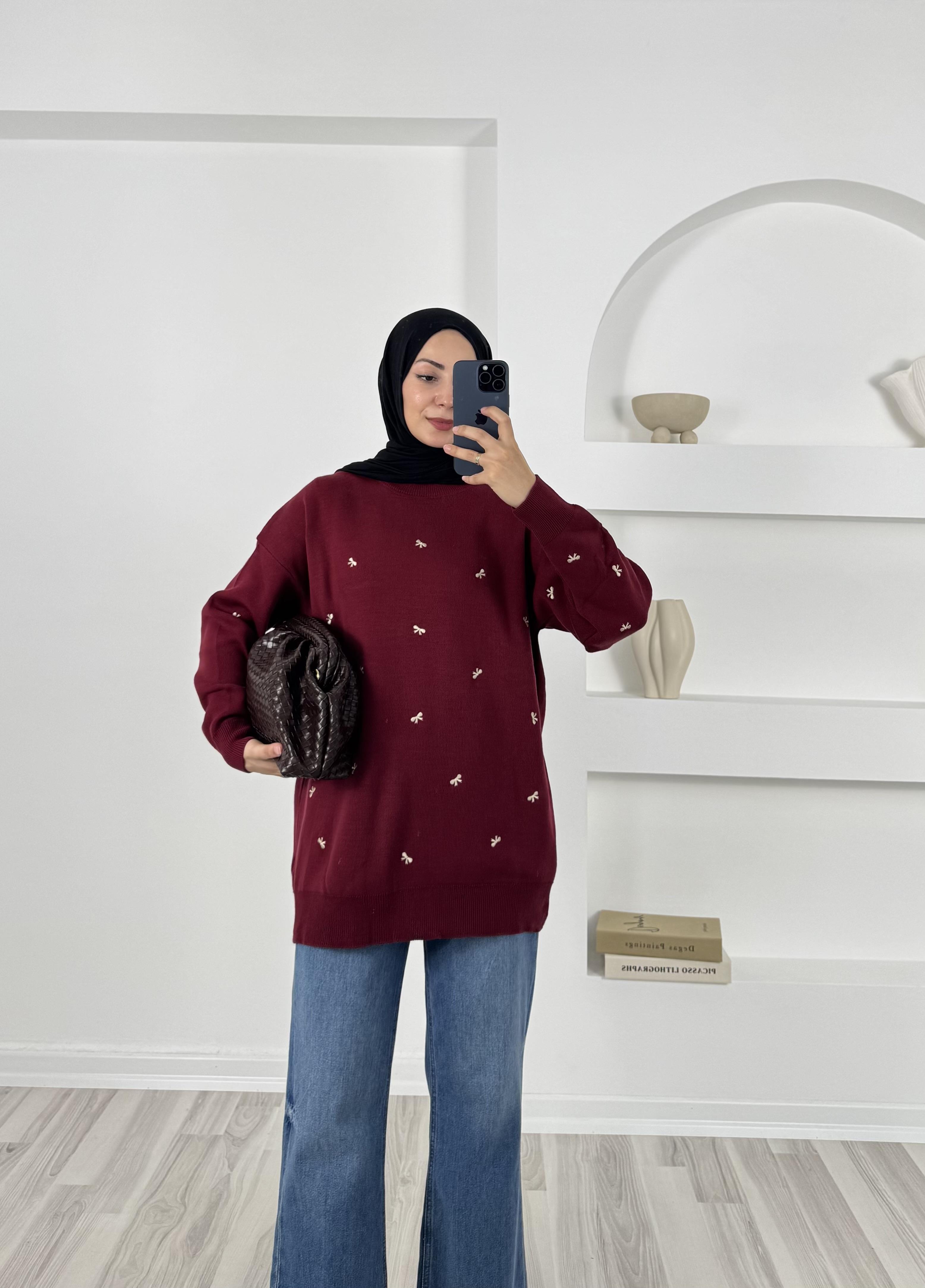 3251 küçük fiyonk nakışlı kazak bordo (3251)