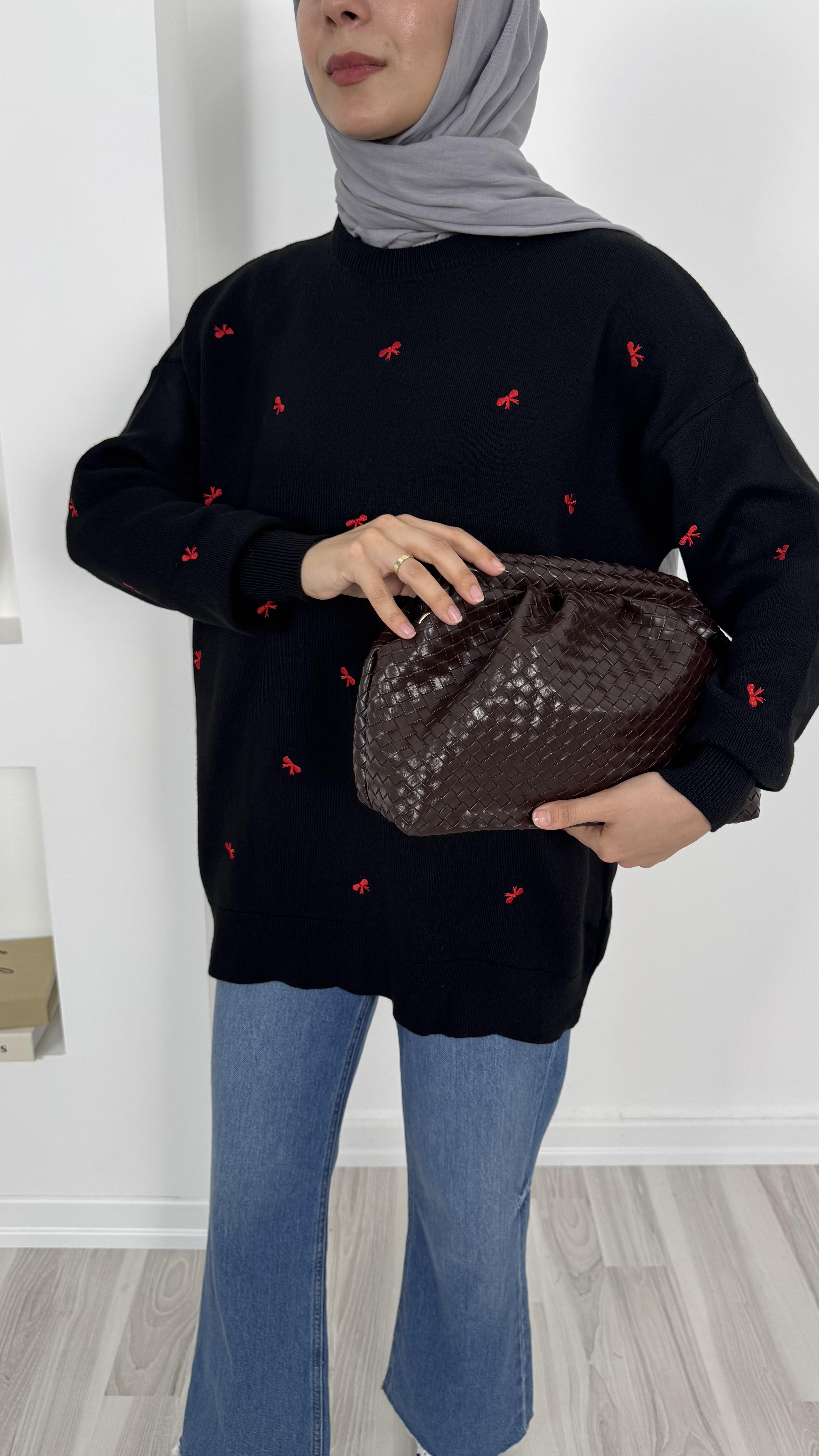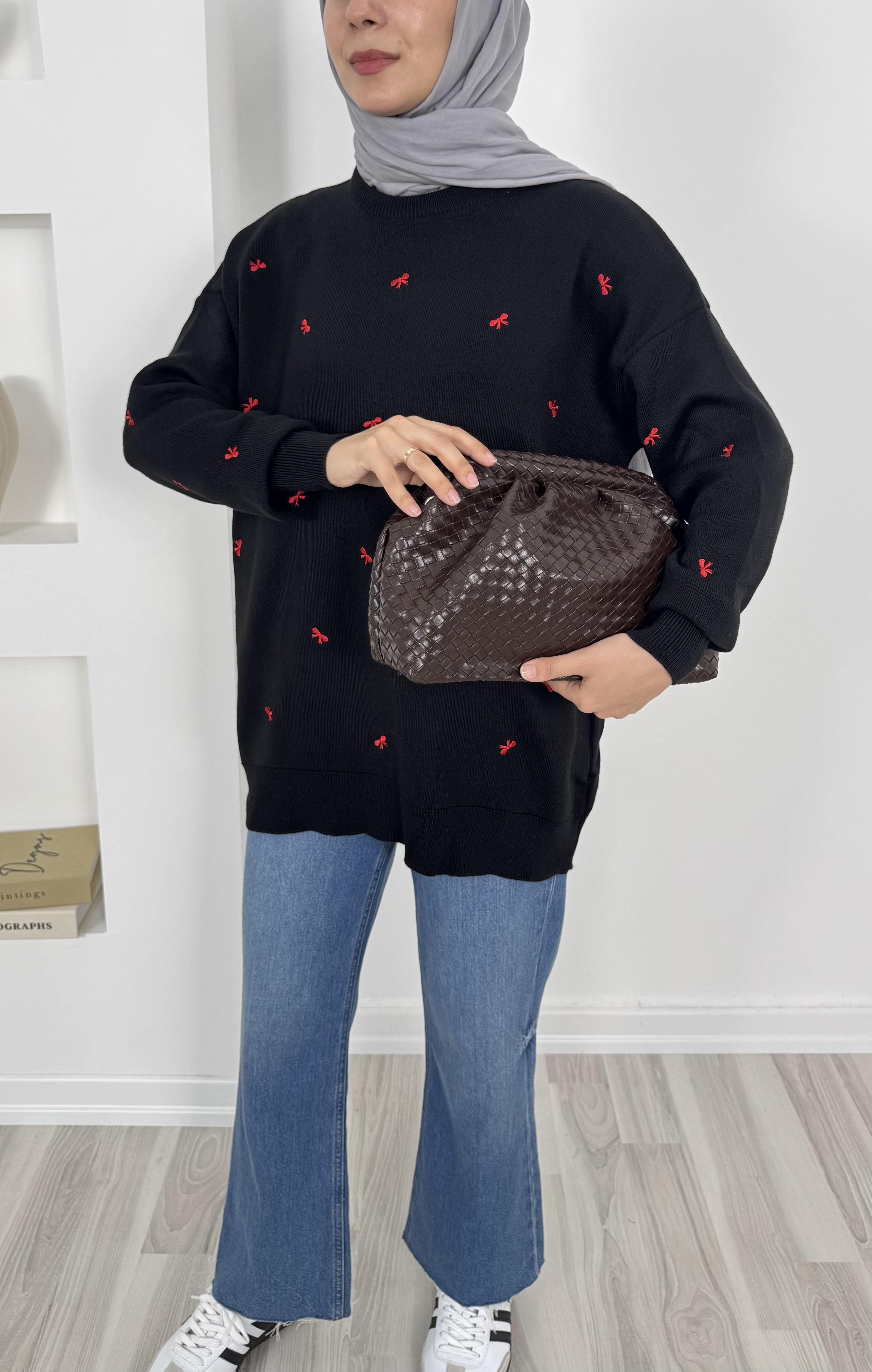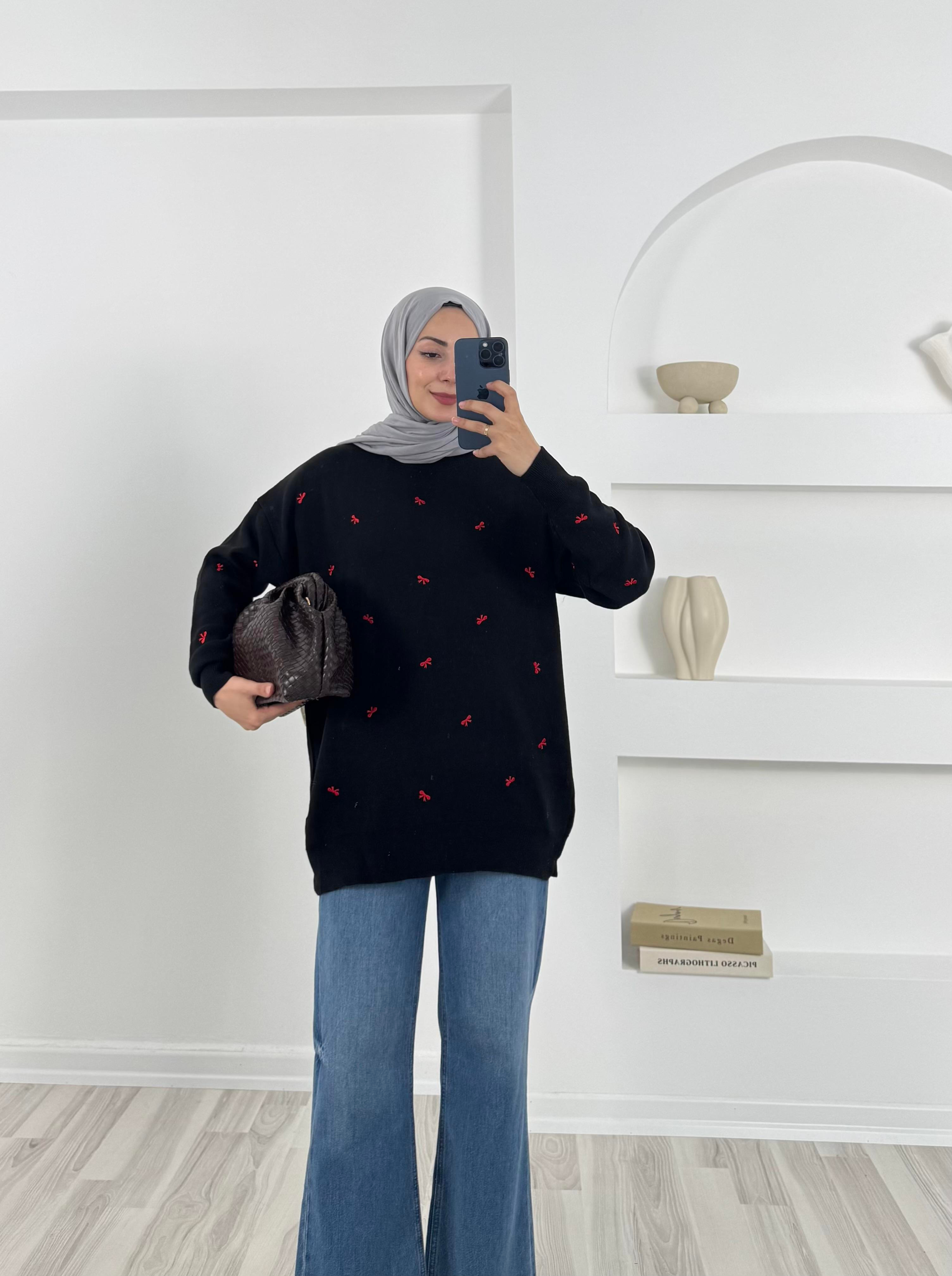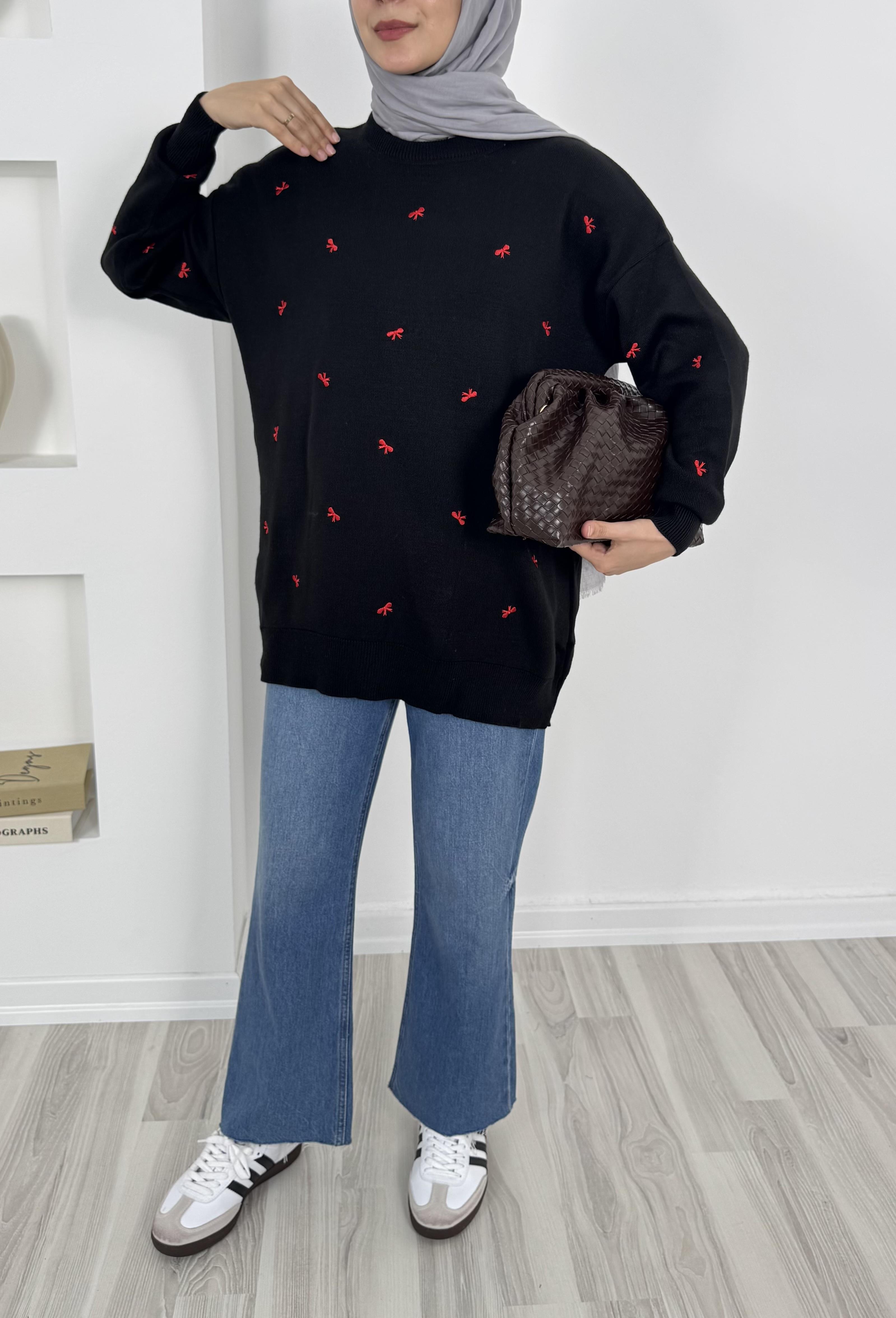 3251 küçük fiyonk nakışlı kazak siyah (3251)
