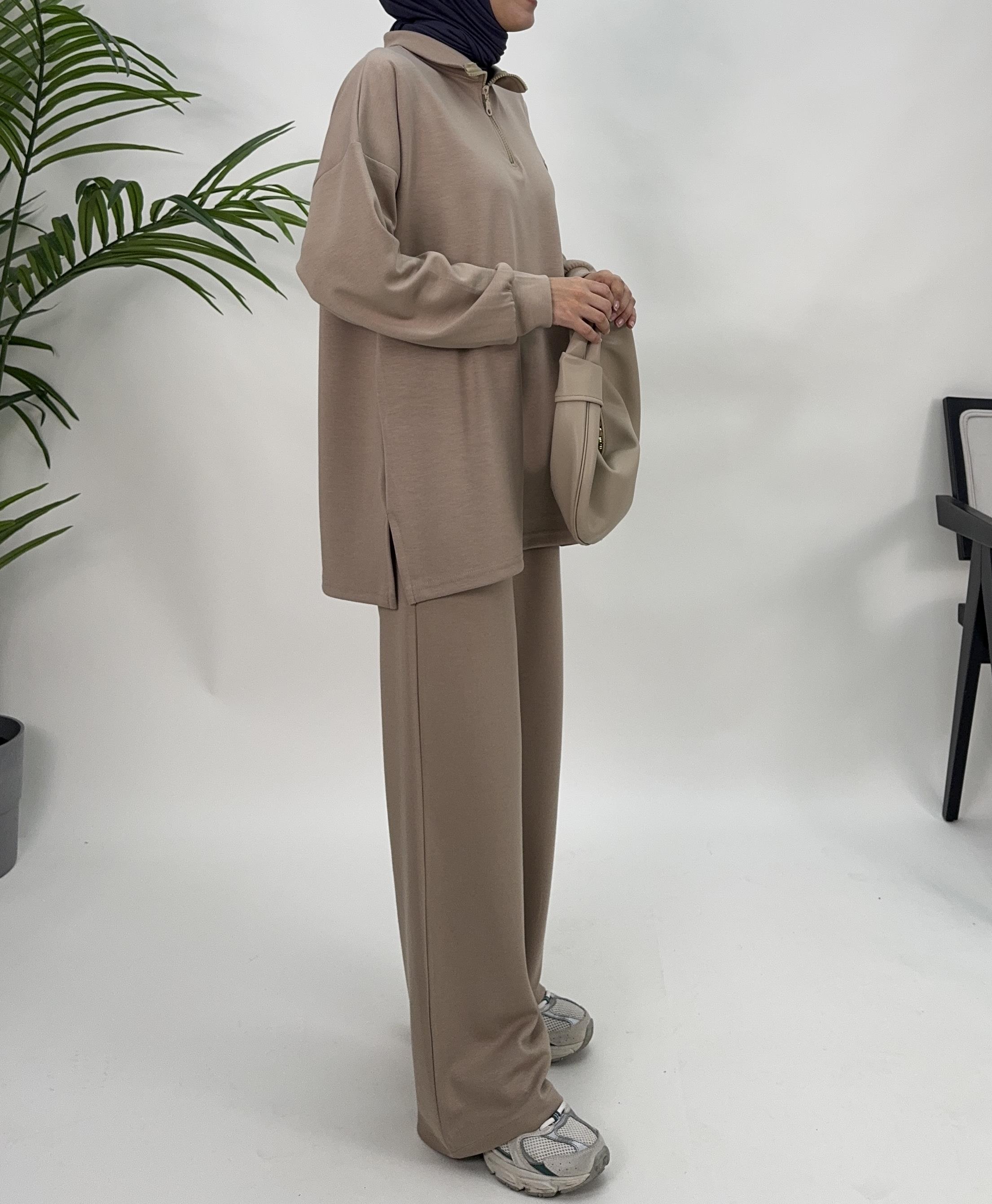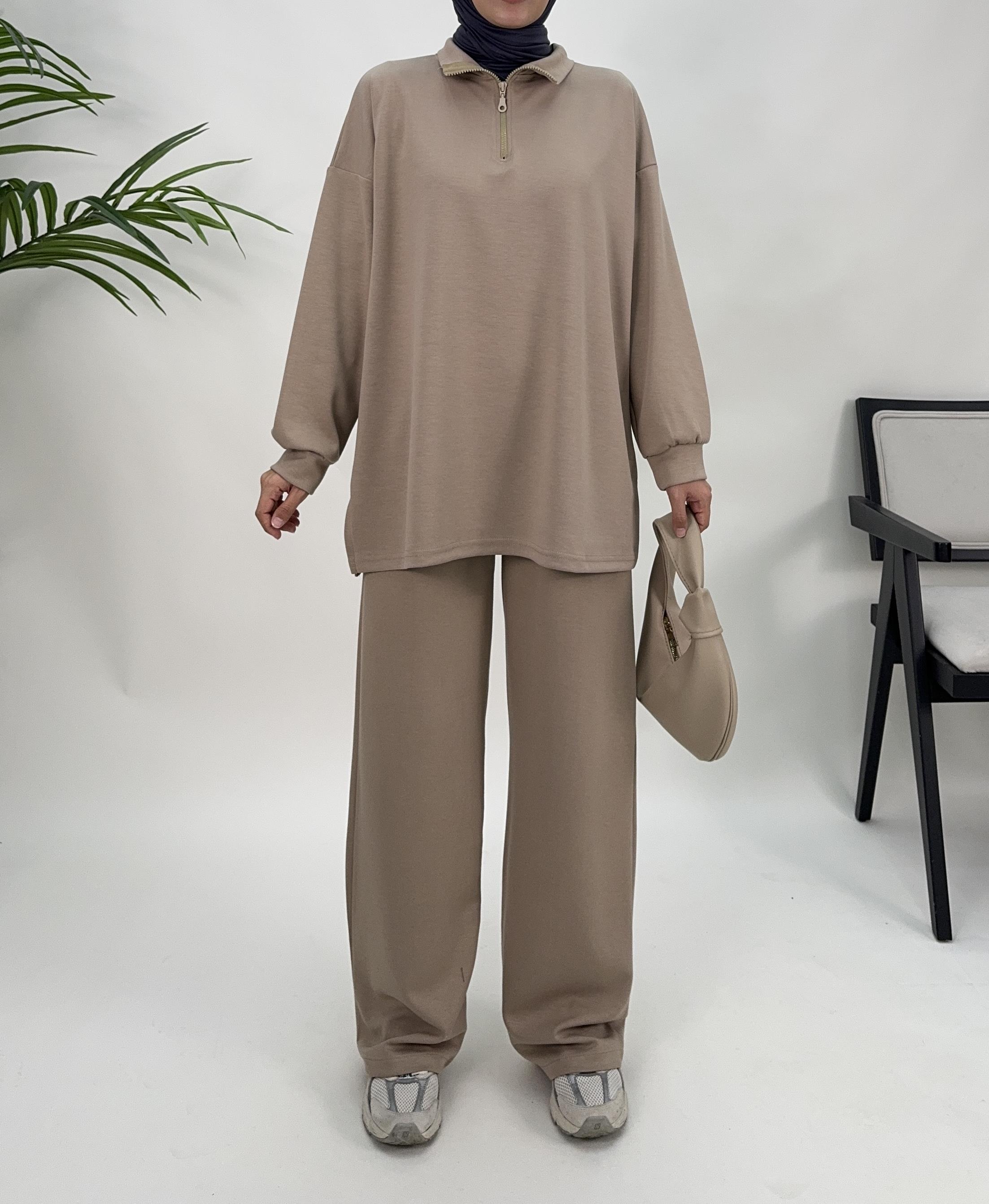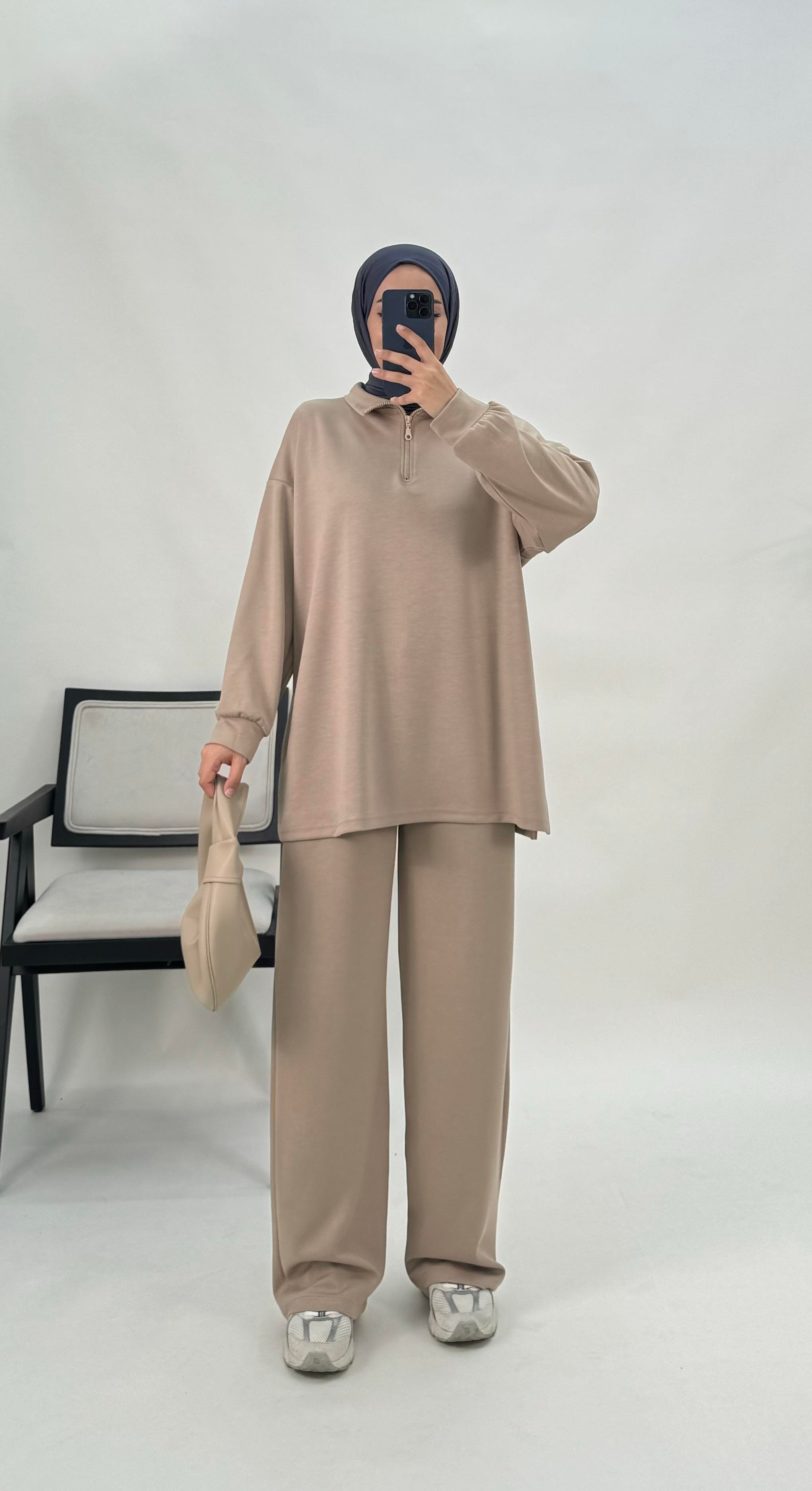 3256-oysho kumaş-fermuarlı takım-sütlü kahve (3256)