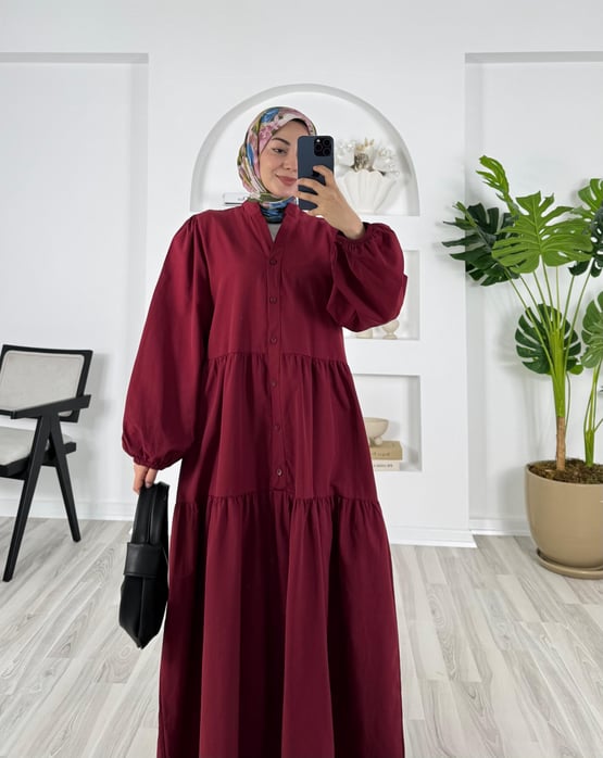 33065-terikoton kumaş-yarım düğmeli v yaka elbise-bordo (33065)