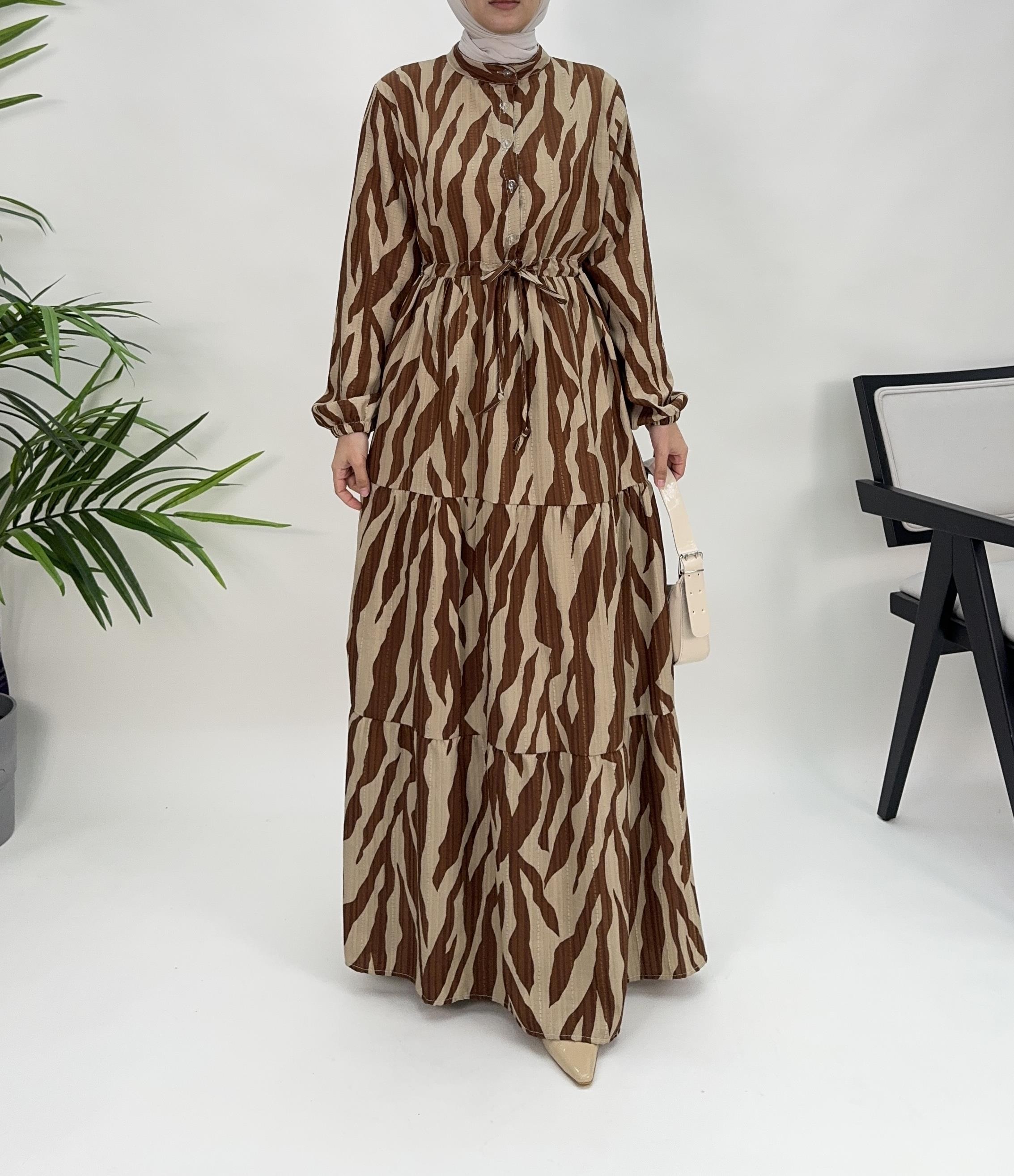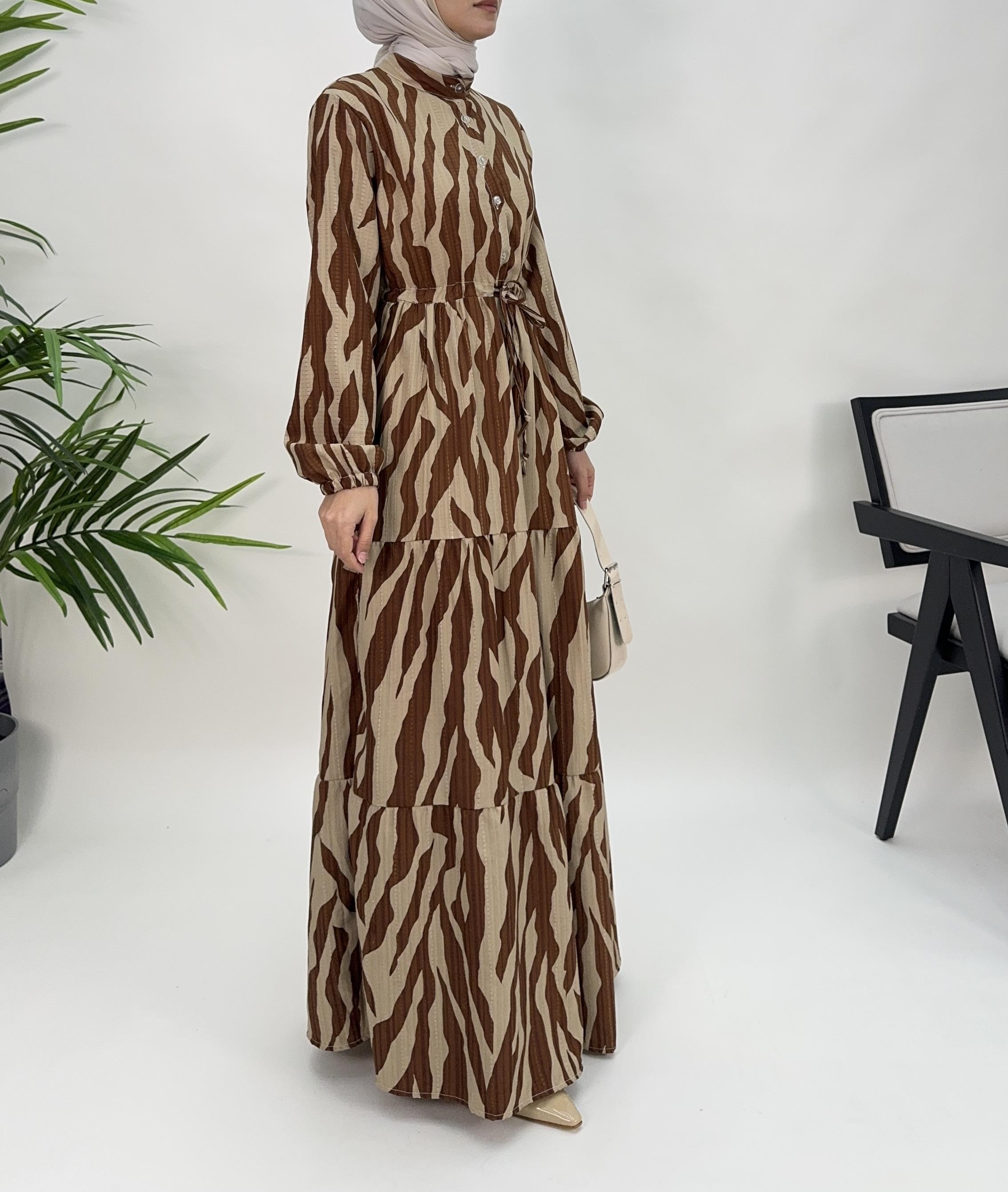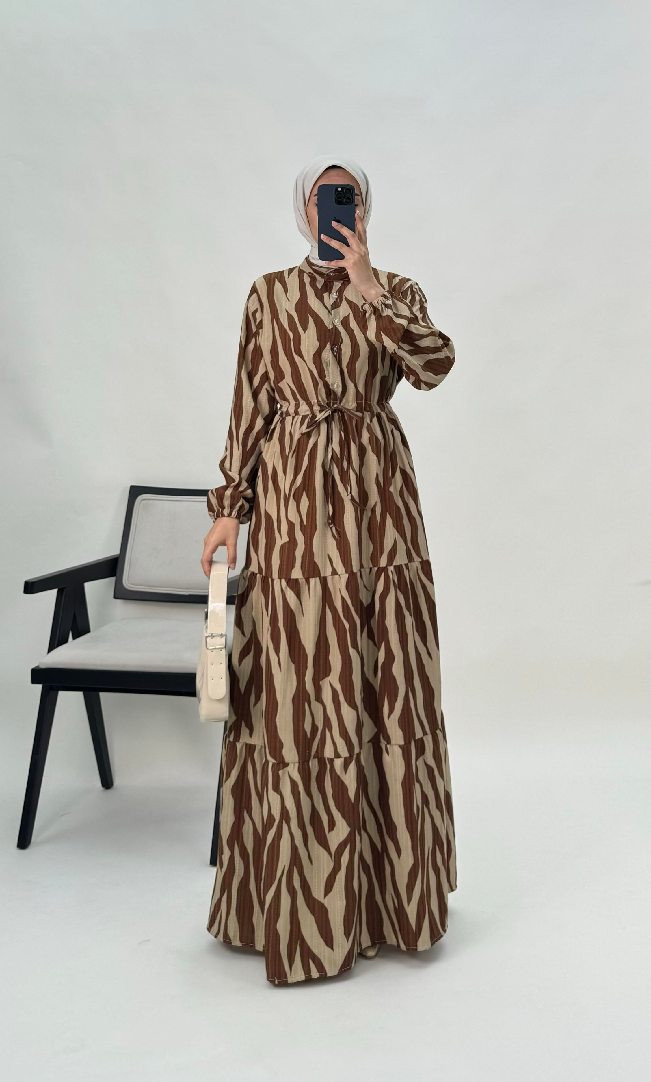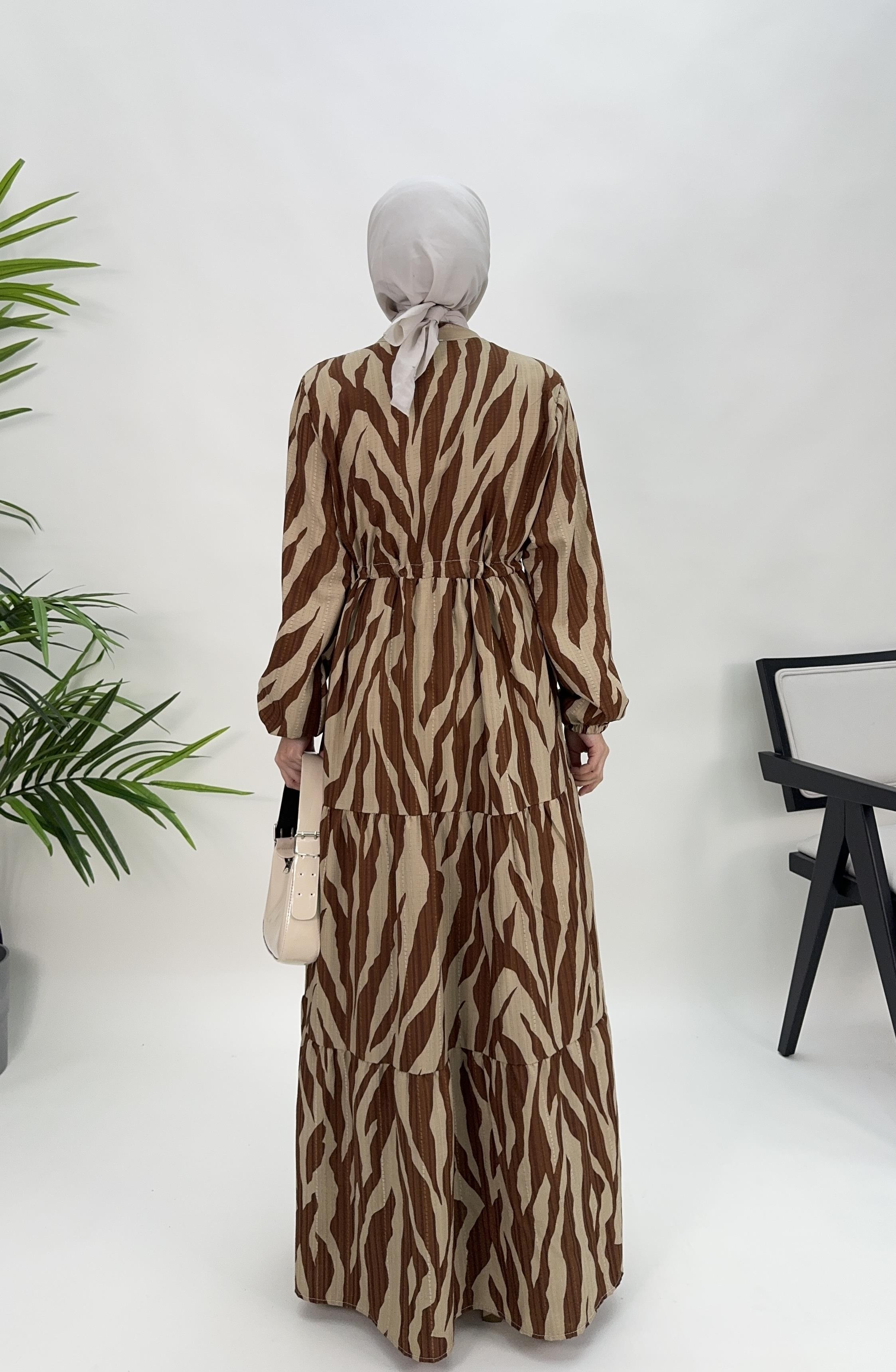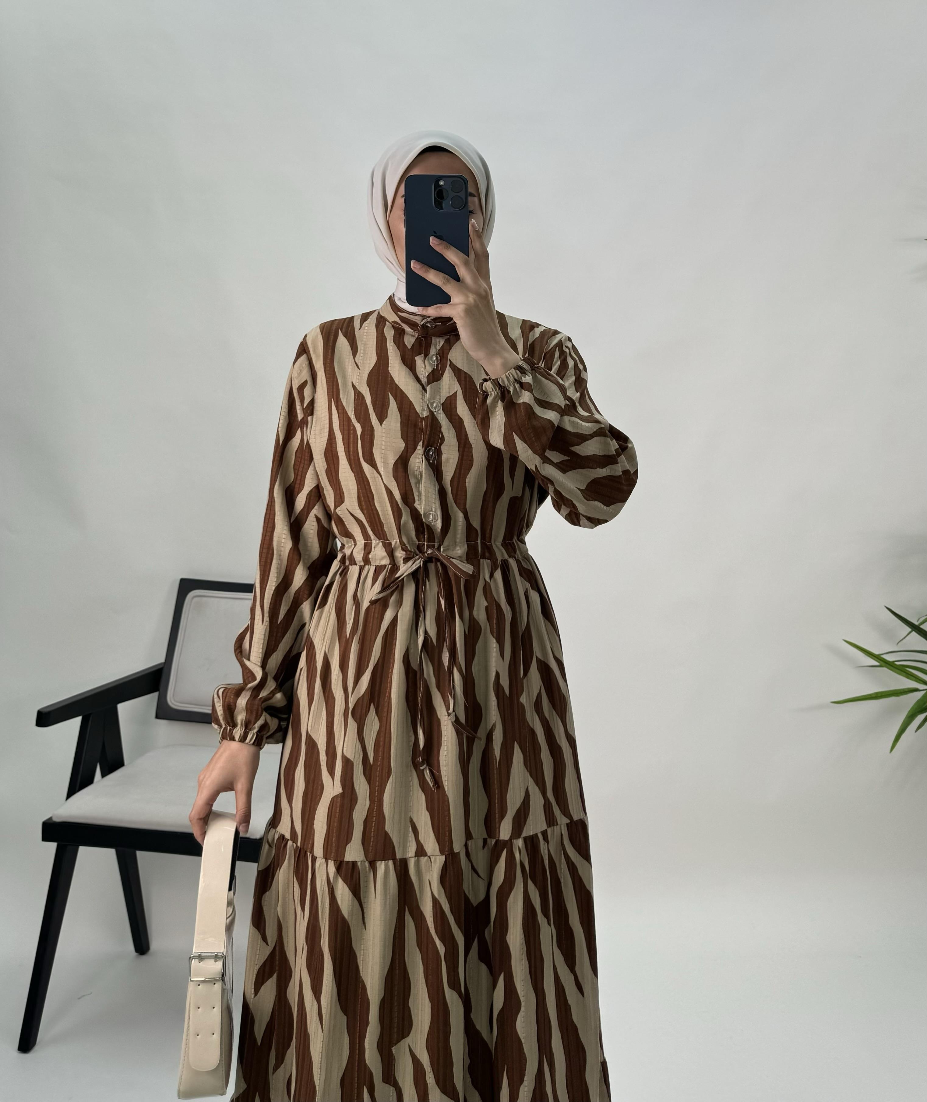 beline kadar düğmeli belden büzgülü elbise