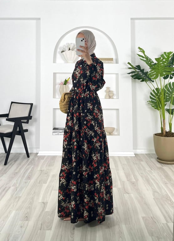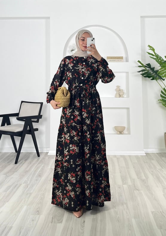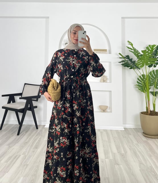 3582-pamuk viskon kumaş-belden büzülebilir küçük çiçek desenli elbise-siyah (3582)