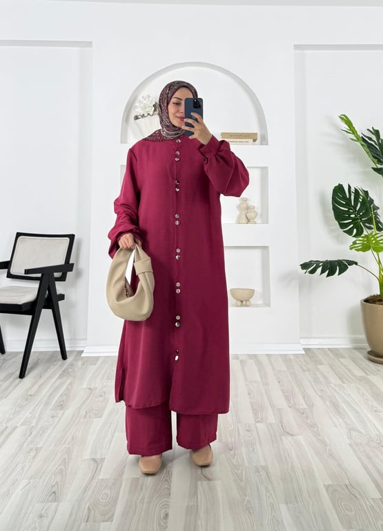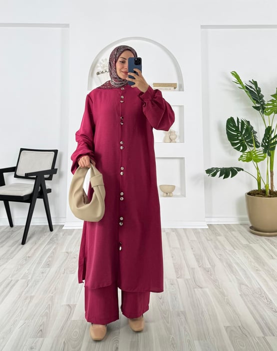 3621-modal kumaş-boydan düğmeli pantolonlu takım-fuşya (3621)