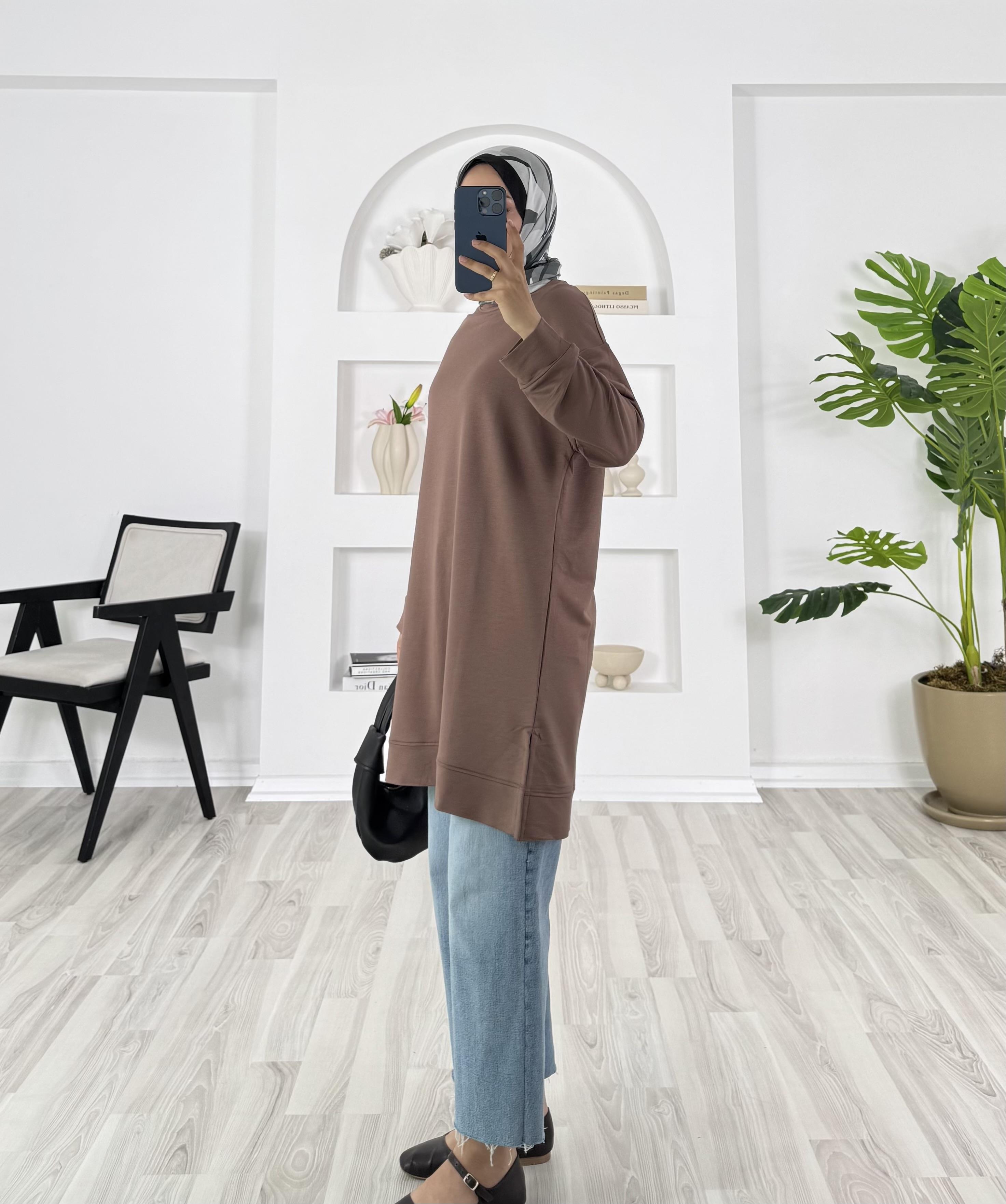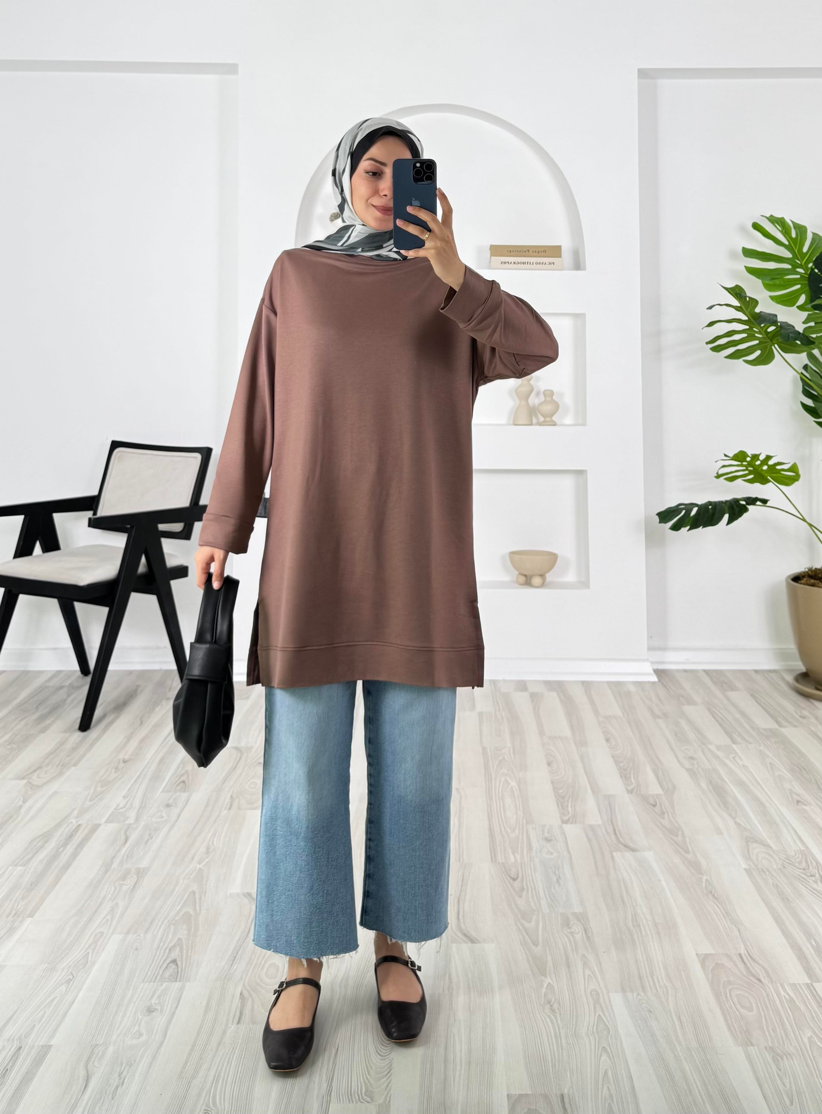 3622-kristal kumaş-yanları yırtmaçlı tunik-kahverengi (3622)