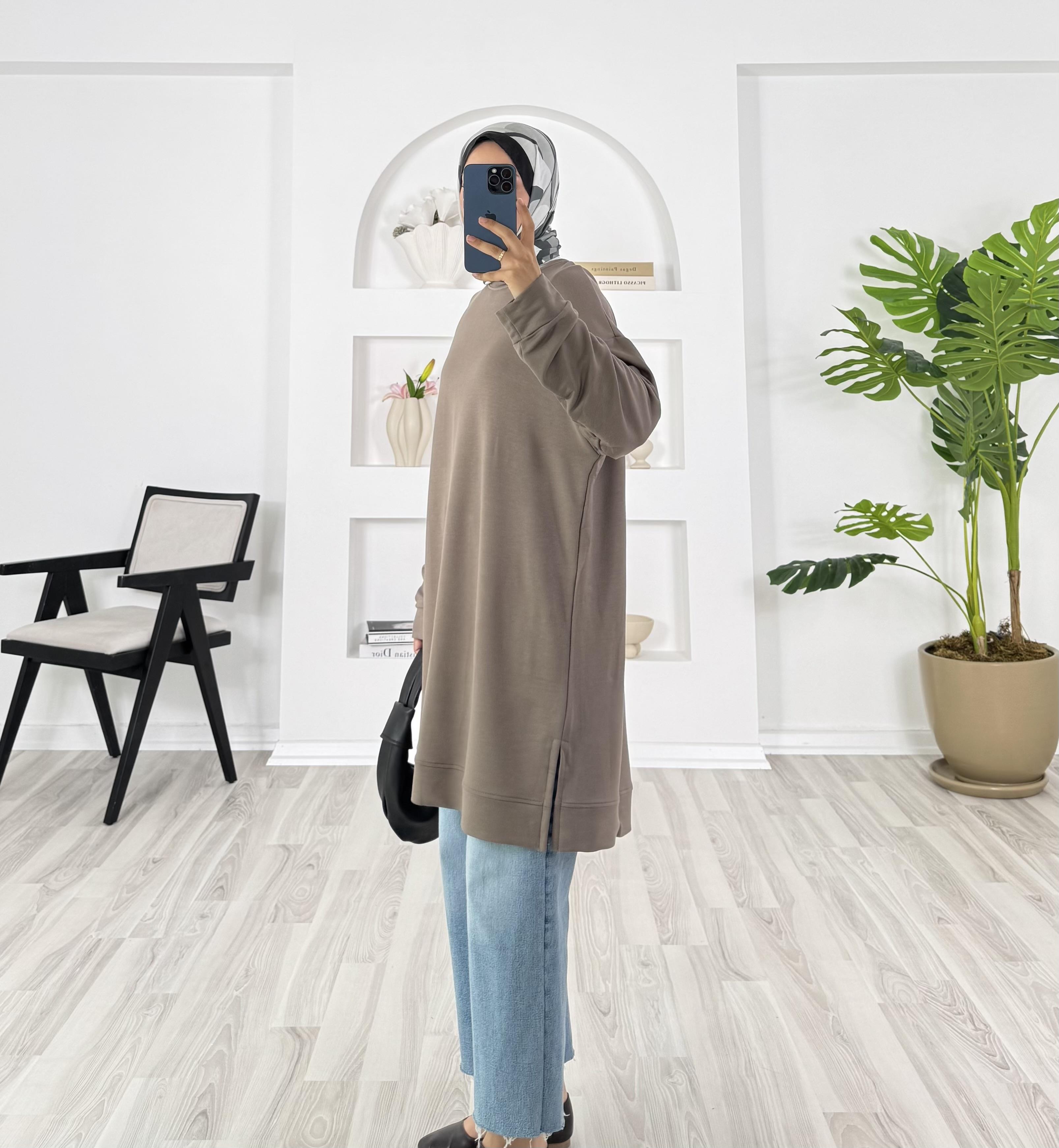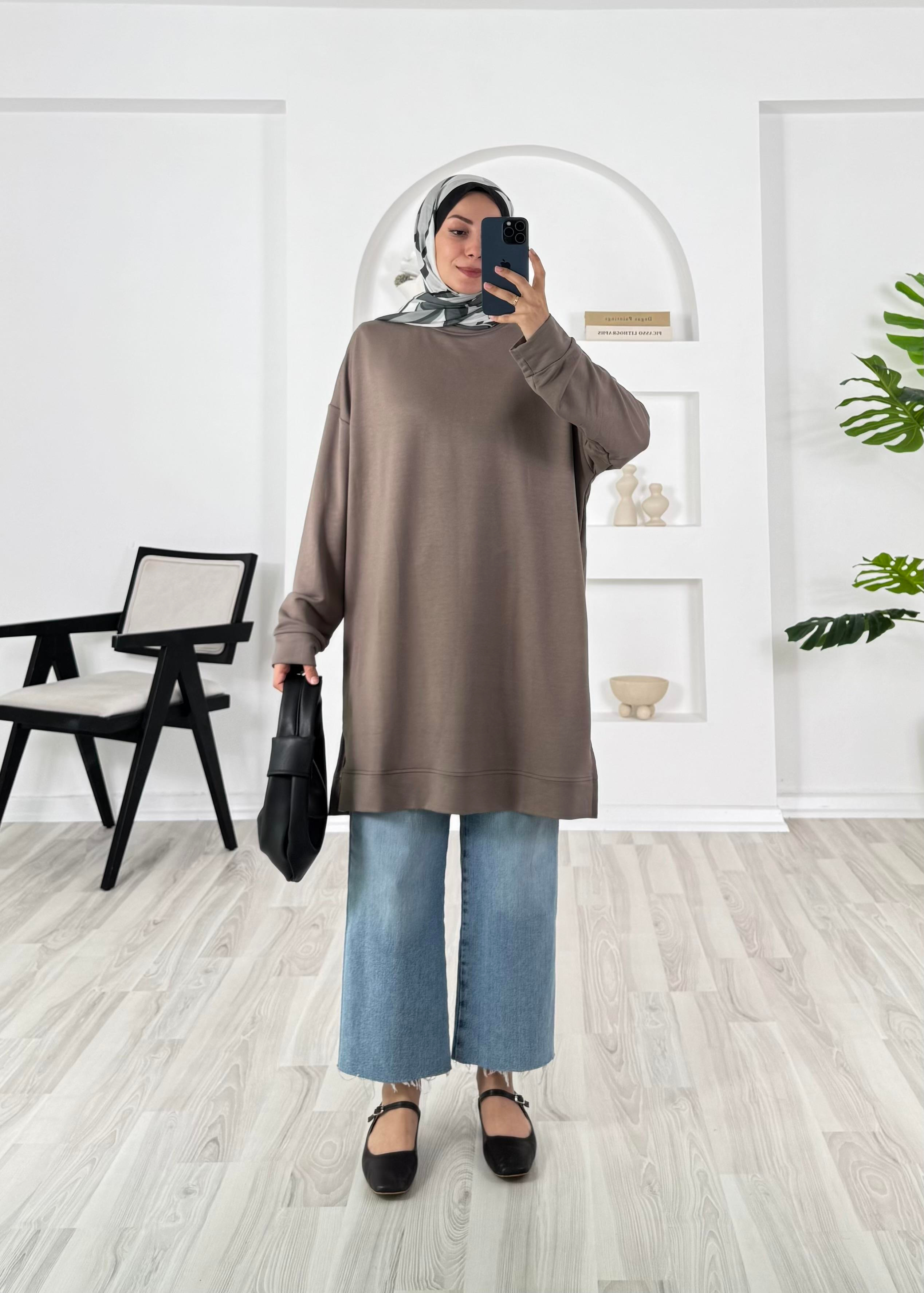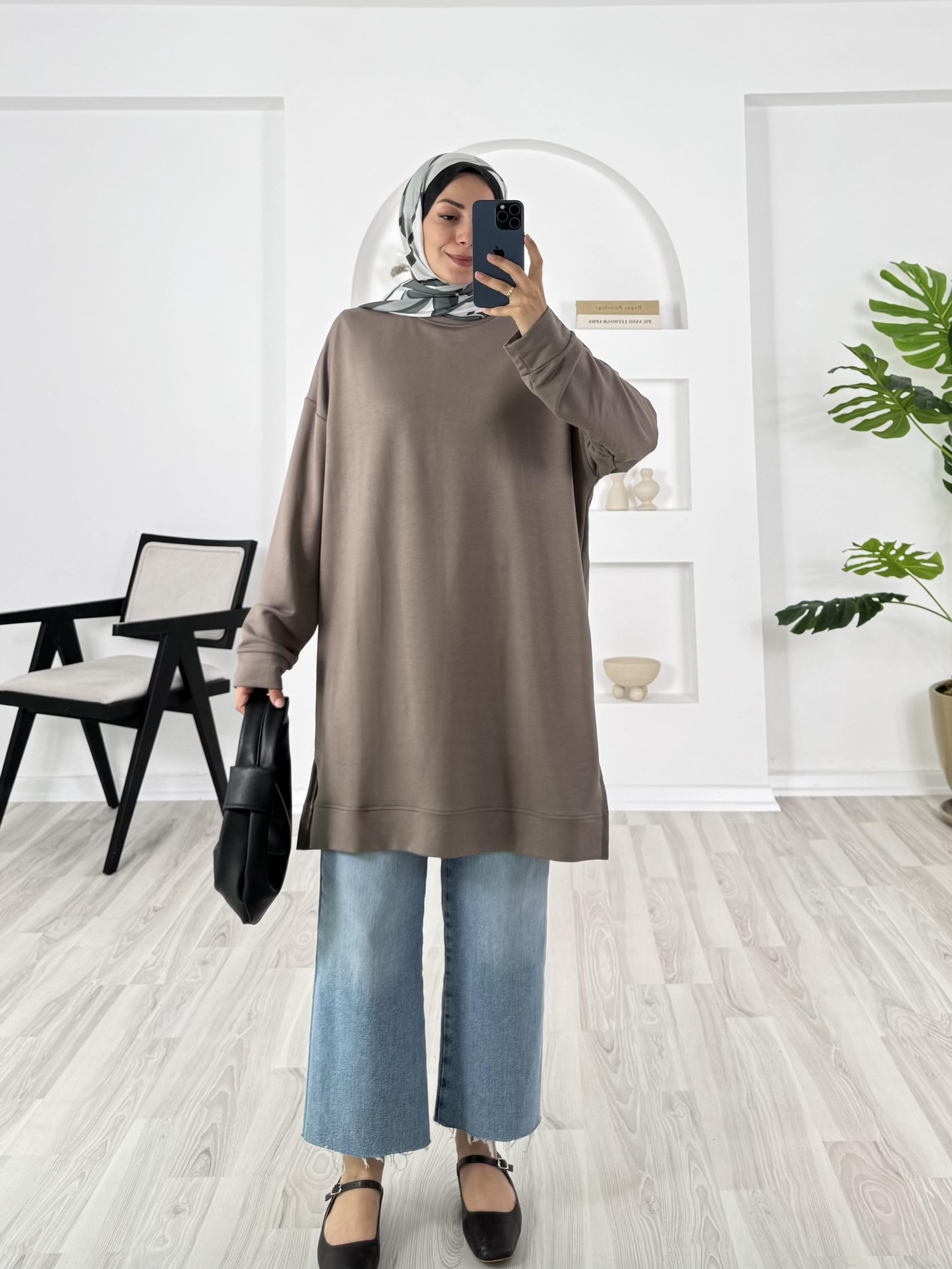 3622-kristal kumaş-yanları yırtmaçlı tunik-vizon (3622)