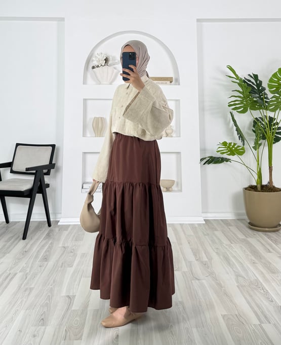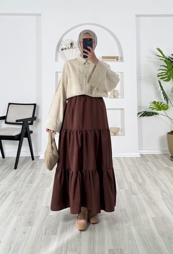 3684-terikoton kumaş-beli lastikli etek-acı kahve (3684)