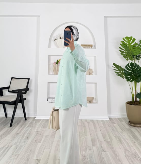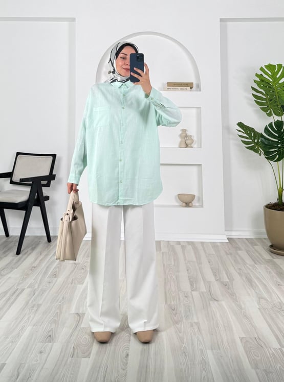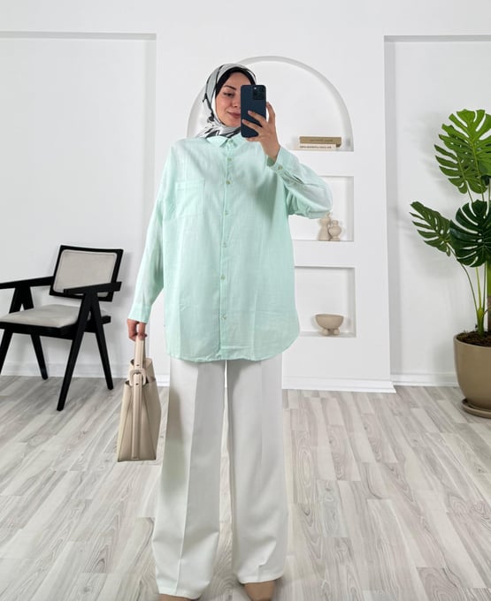 3725-keten kumaş-önü tek cepli gömlek-su yeşili (3725)