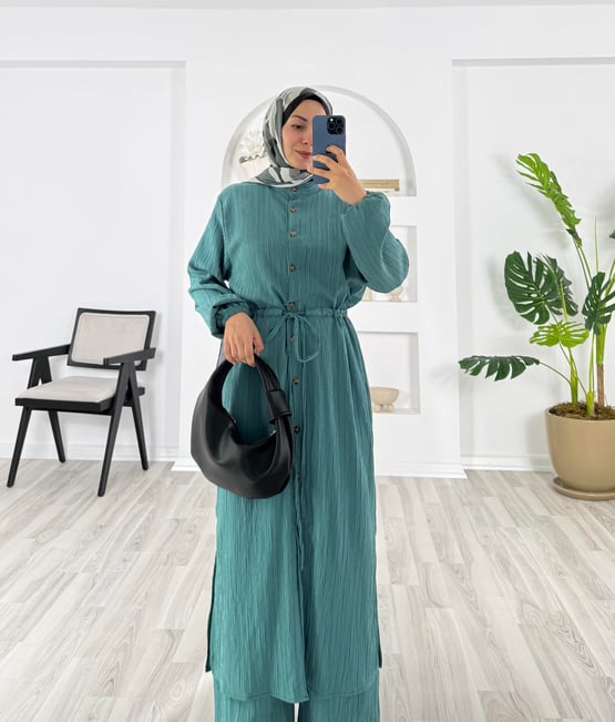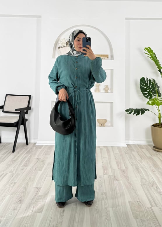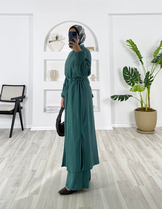 3812-kirinkıl kaş kumaş-beli büzülebilir boydan düğmeli pantolonlu takım-su yeşili (3812)