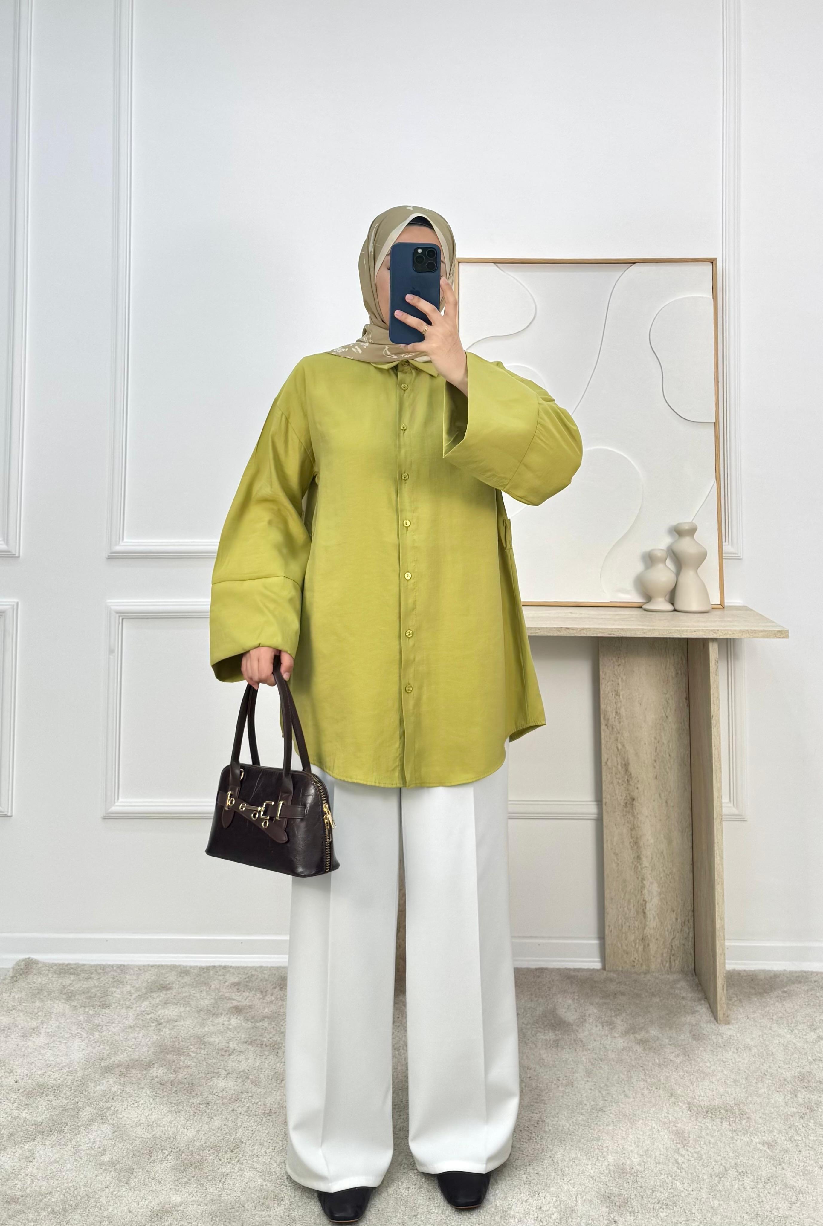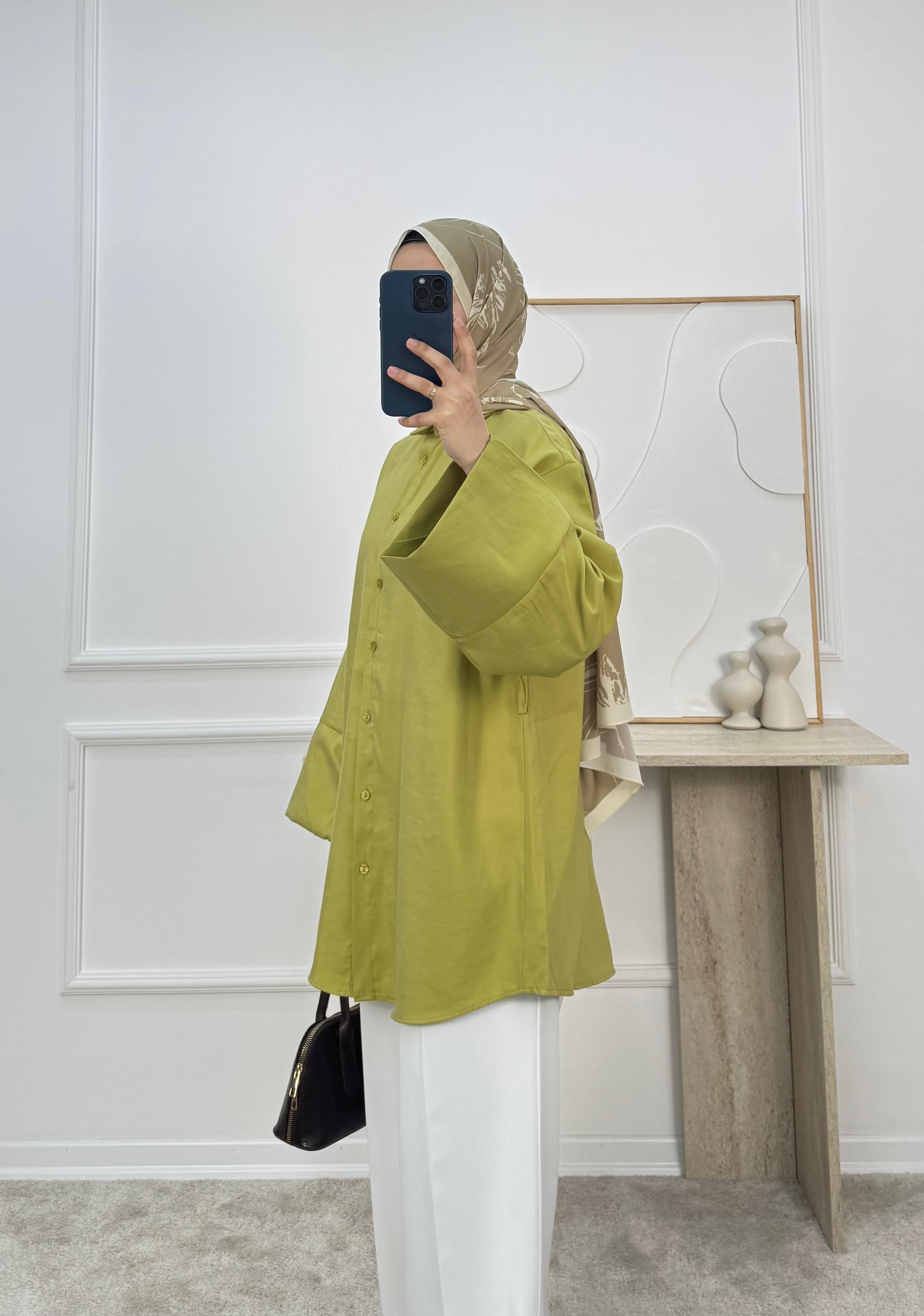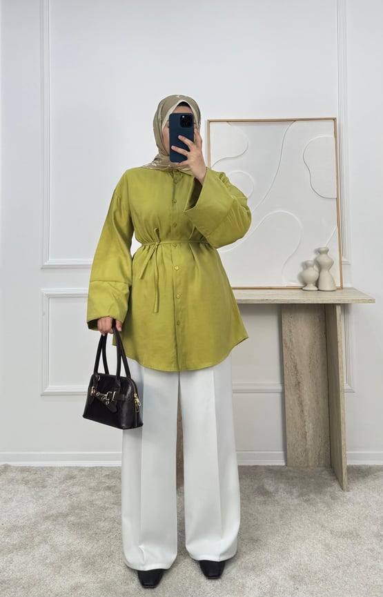 1512-cupra kumaş kuşaklı gömlek-yağ yeşili (1512)