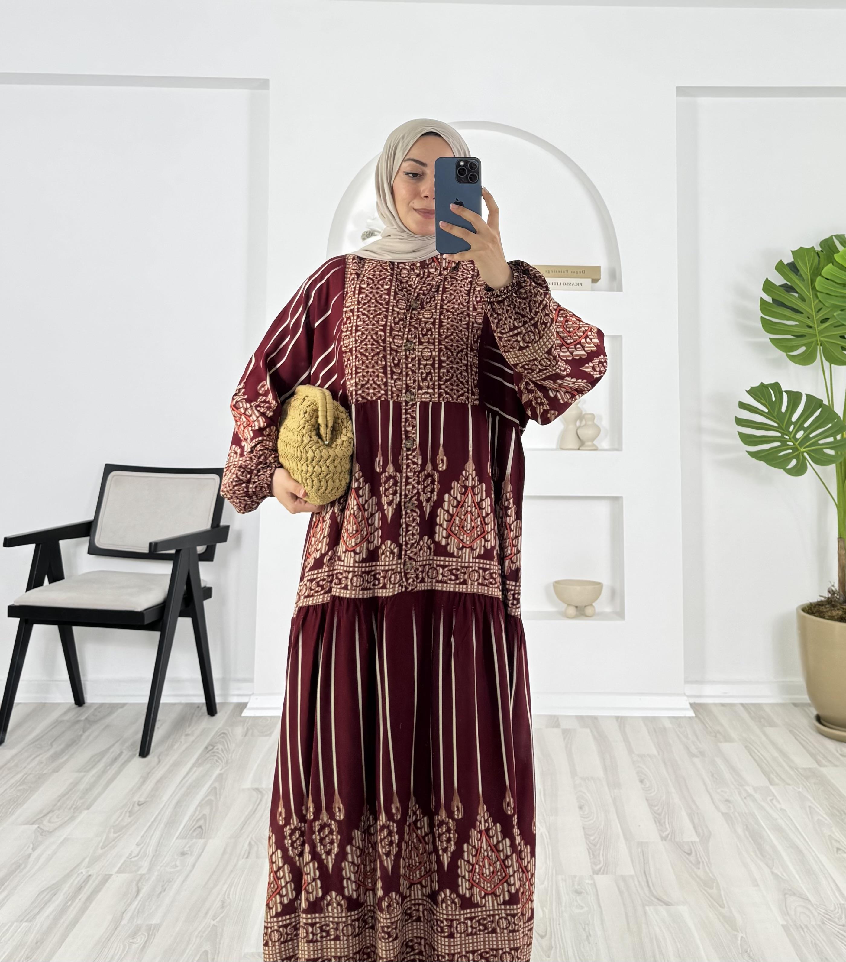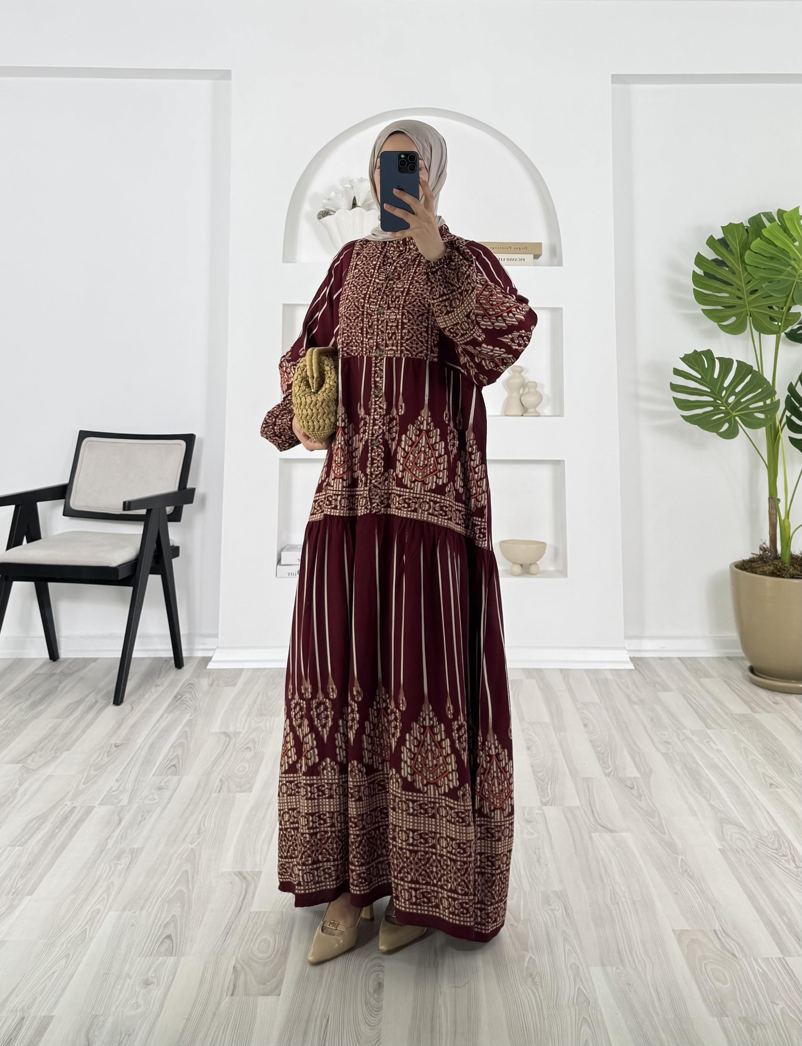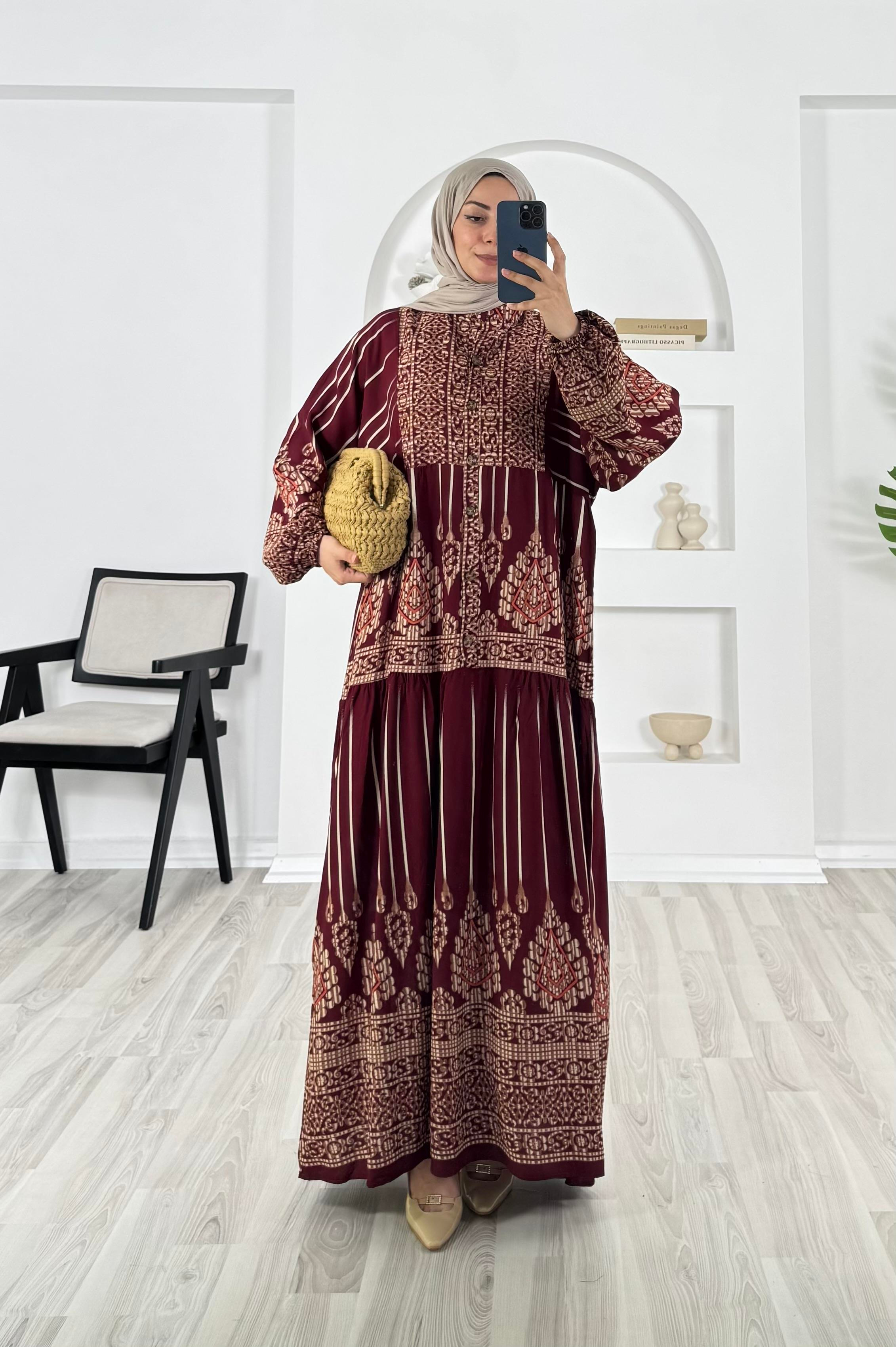 4159-pamuk viskon kumaş-yarım düğmeli desenli elbise-bordo (4159)