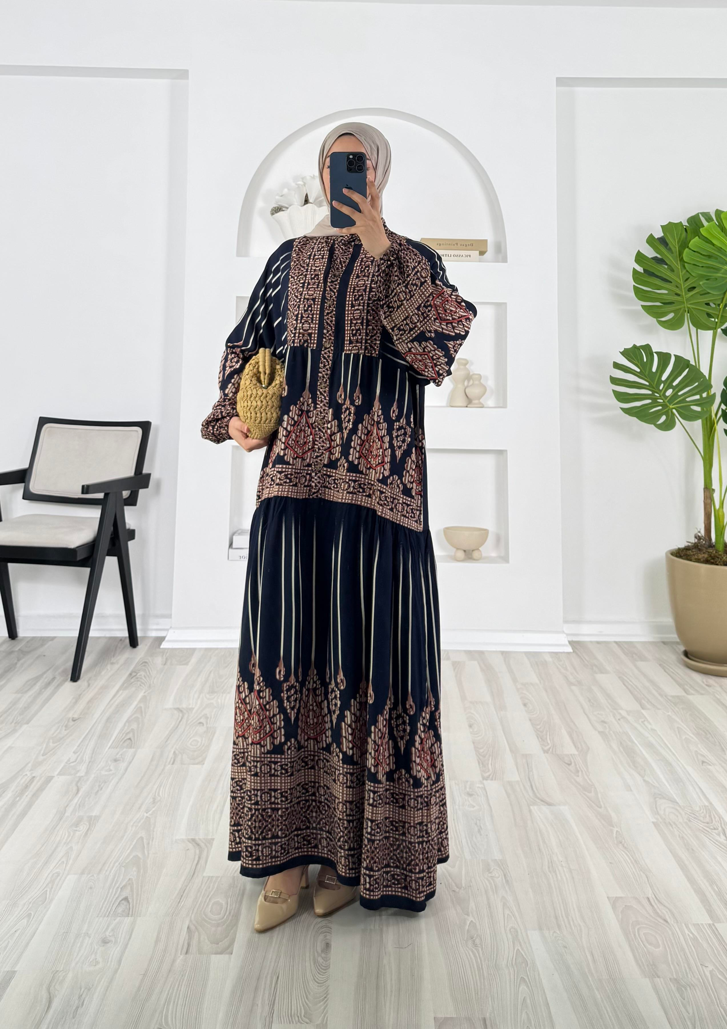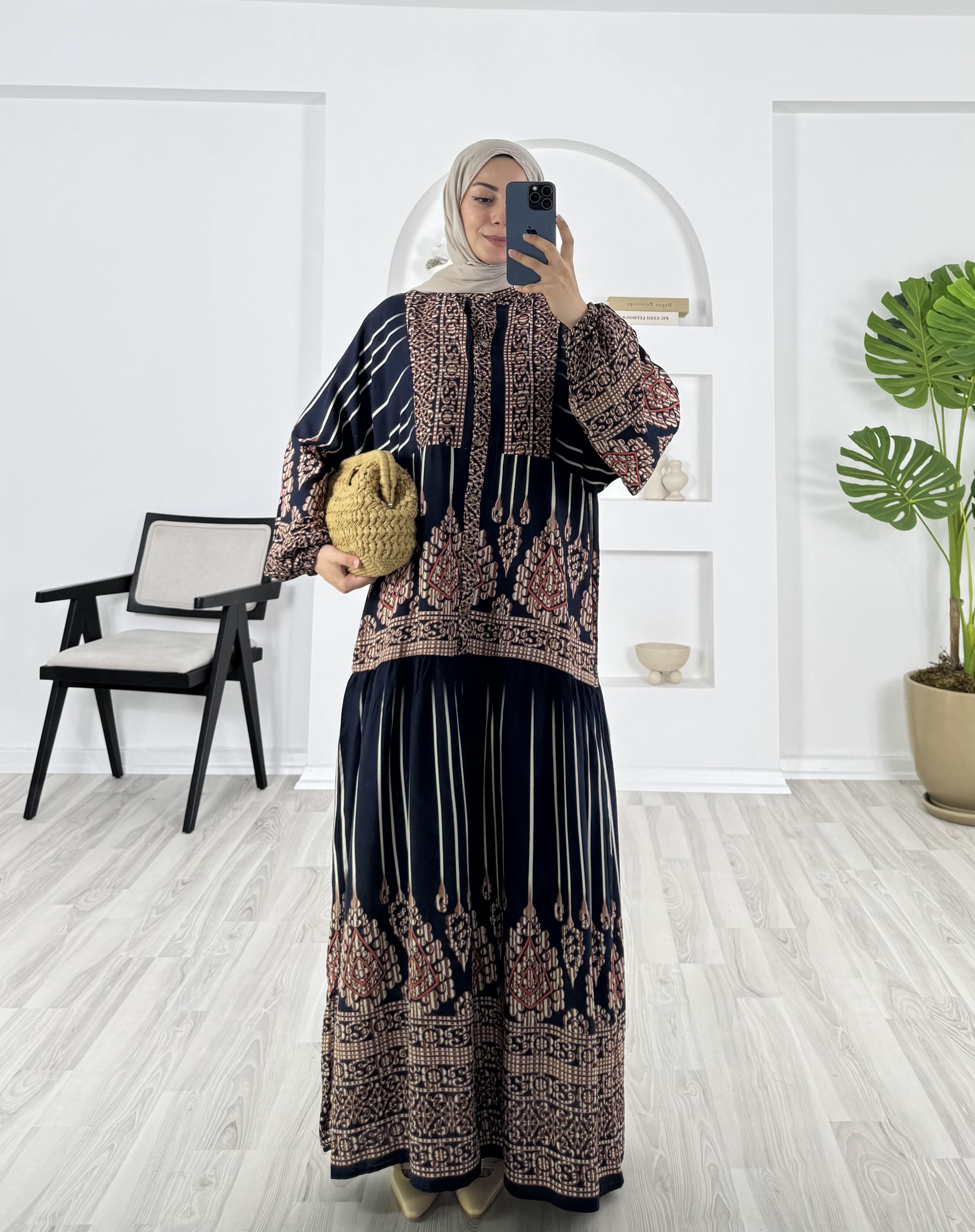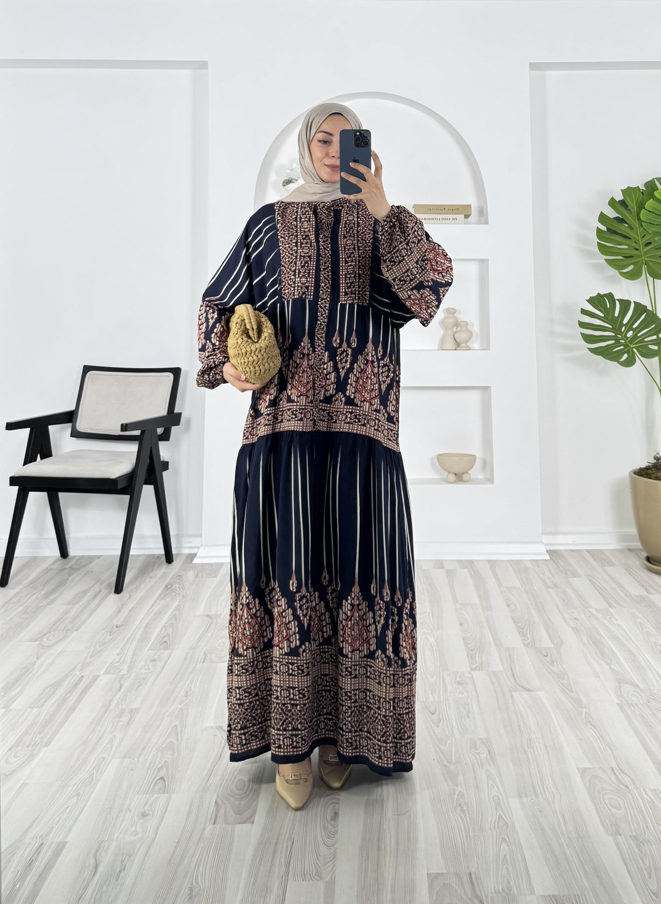 4159-pamuk viskon kumaş-yarım düğmeli desenli elbise-lacivert (4159)
