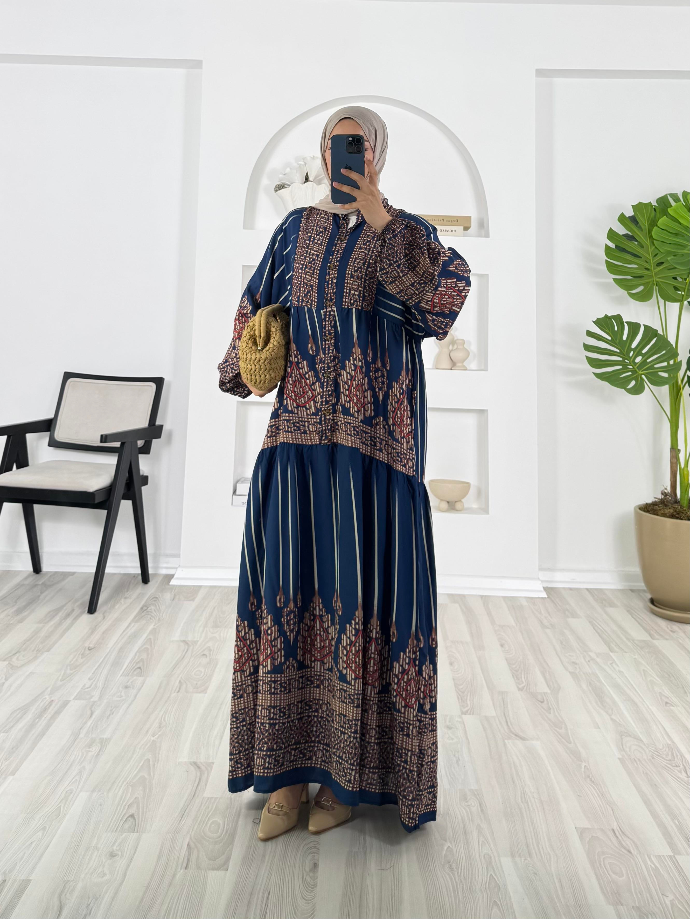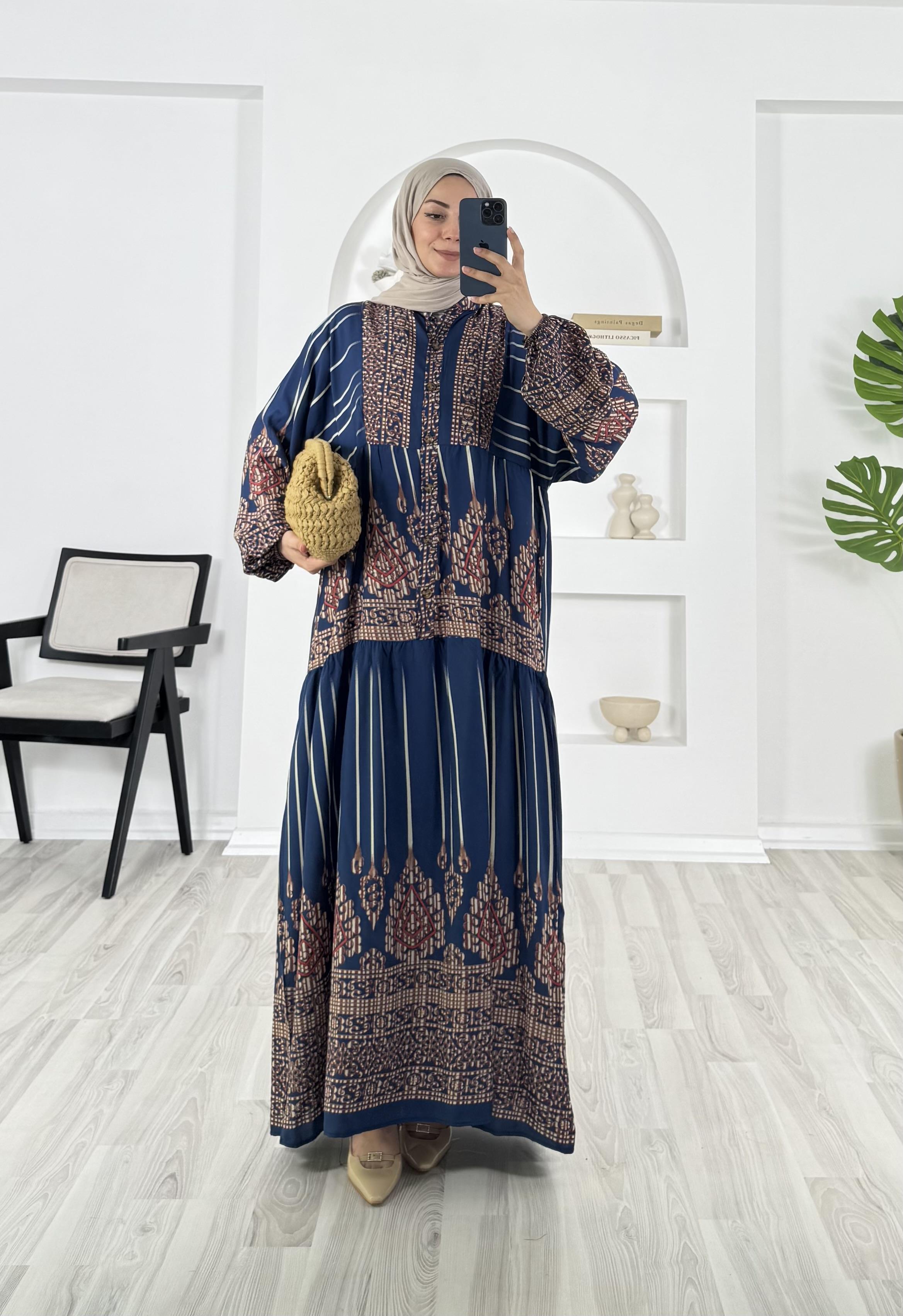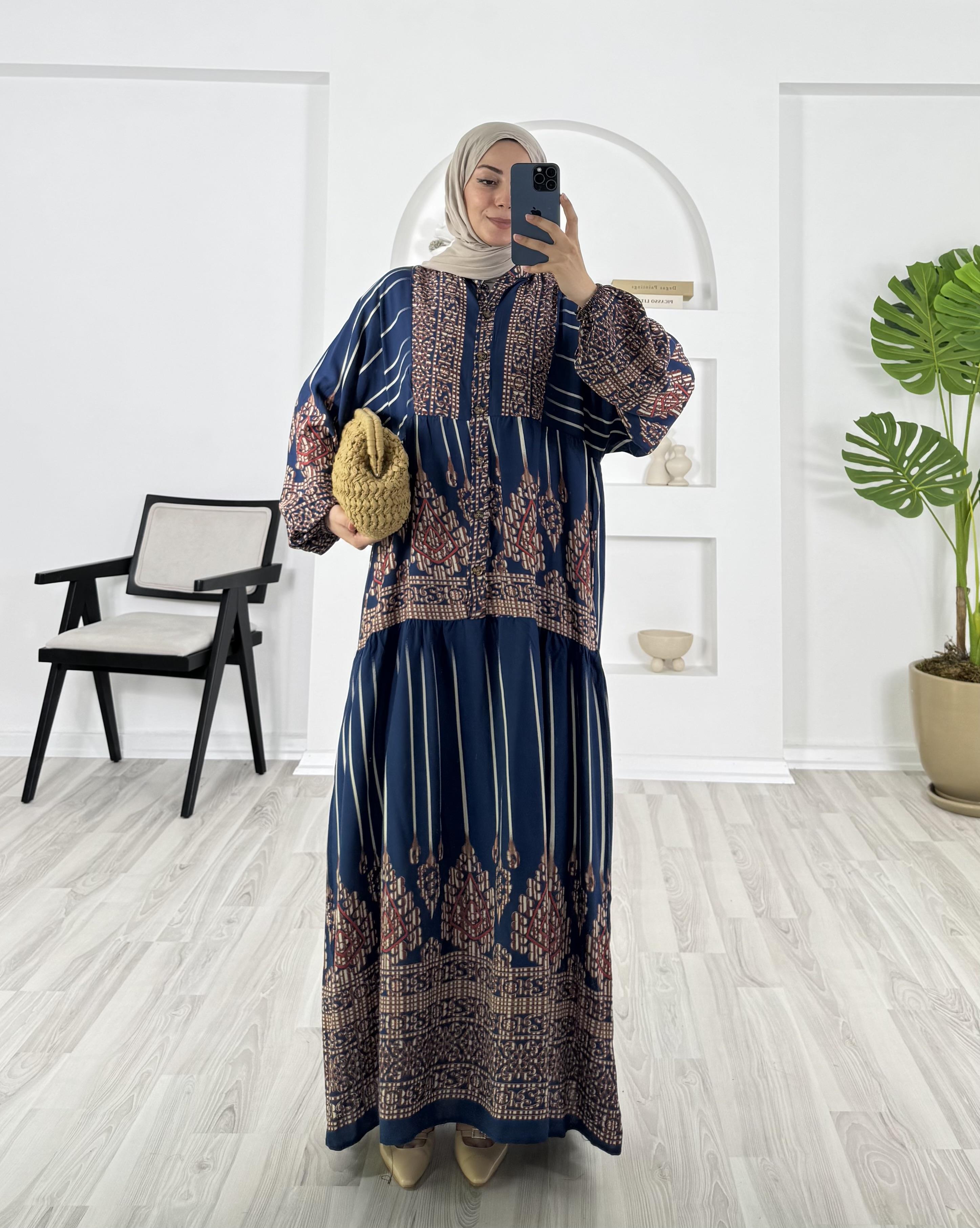 4159-pamuk viskon kumaş-yarım düğmeli desenli elbise-mavi (4159)